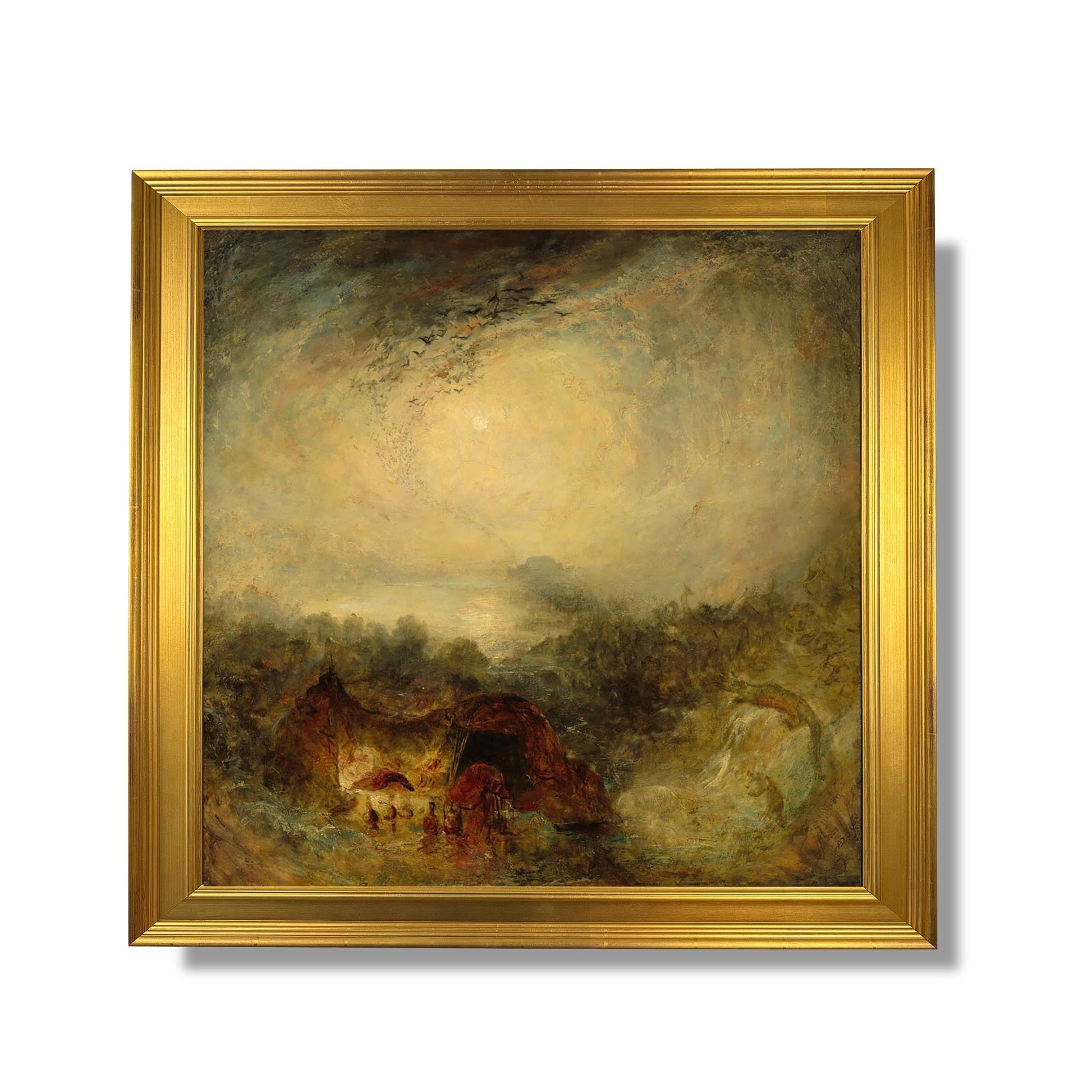 „Der Abend der Sintflut“ von Joseph Mallord William Turner aus dem Jahr 1805 ist ein ikonisches Werk der britischen Romantik. Dieses Gemälde zeigt eine apokalyptische Szene, die von der biblischen Sintflut inspiriert ist. Dunkle, stürmische Wolken beherrschen den Himmel, während Blitze die chaotische Landschaft erhellen. Die Silhouetten der menschlichen Figuren, die der Trostlosigkeit zum Opfer fallen, verleihen der Komposition eine tragische Dimension. Turner, ein Meister des Lichts und der Farbe, verwendet leuchtende Farbtöne, um die Emotionen und die Kraft der Natur hervorzurufen. Dieses Werk illustriert den Kampf zwischen Mensch und Naturgewalten, ein zentrales Thema in Turners Kunst.