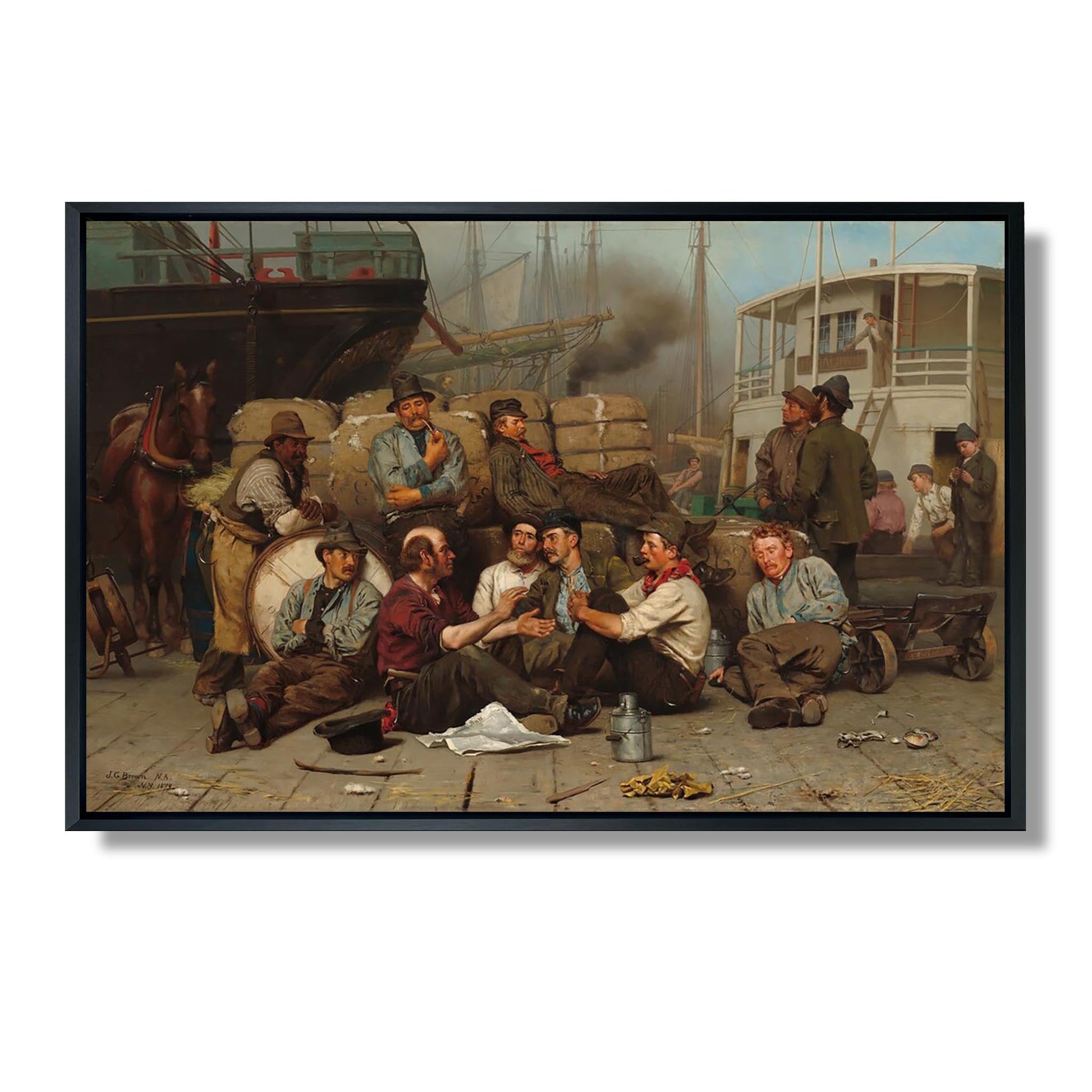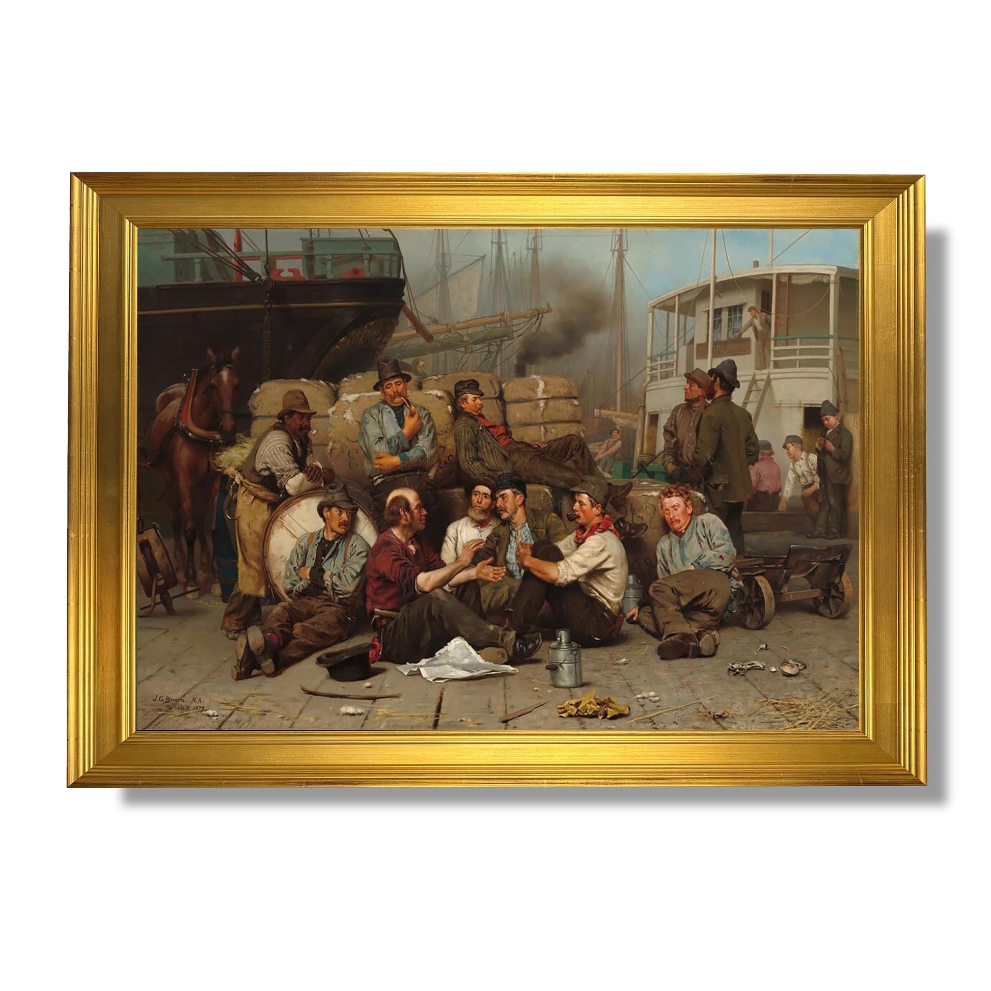 „The Longshoremen’s Noon“ von John George Brown ist ein ikonisches Werk des amerikanischen Realismus des 19. Jahrhunderts. Indem Brown eine Szene aus dem Alltag malt, fängt er einen Moment des Innehaltens der Hafenarbeiter ein und hebt ihre harte Arbeit und Menschlichkeit hervor. Die mit viel Liebe zum Detail dargestellten Charaktere drücken sowohl Müdigkeit als auch Kameradschaft aus. Natürliches, durch die Hafenumgebung gefiltertes Licht betont Texturen und Farben und schafft eine lebendige Atmosphäre. Dieses Werk illustriert nicht nur das Leben der Arbeiter, sondern auch die Würde und Solidarität, die sie vereint.