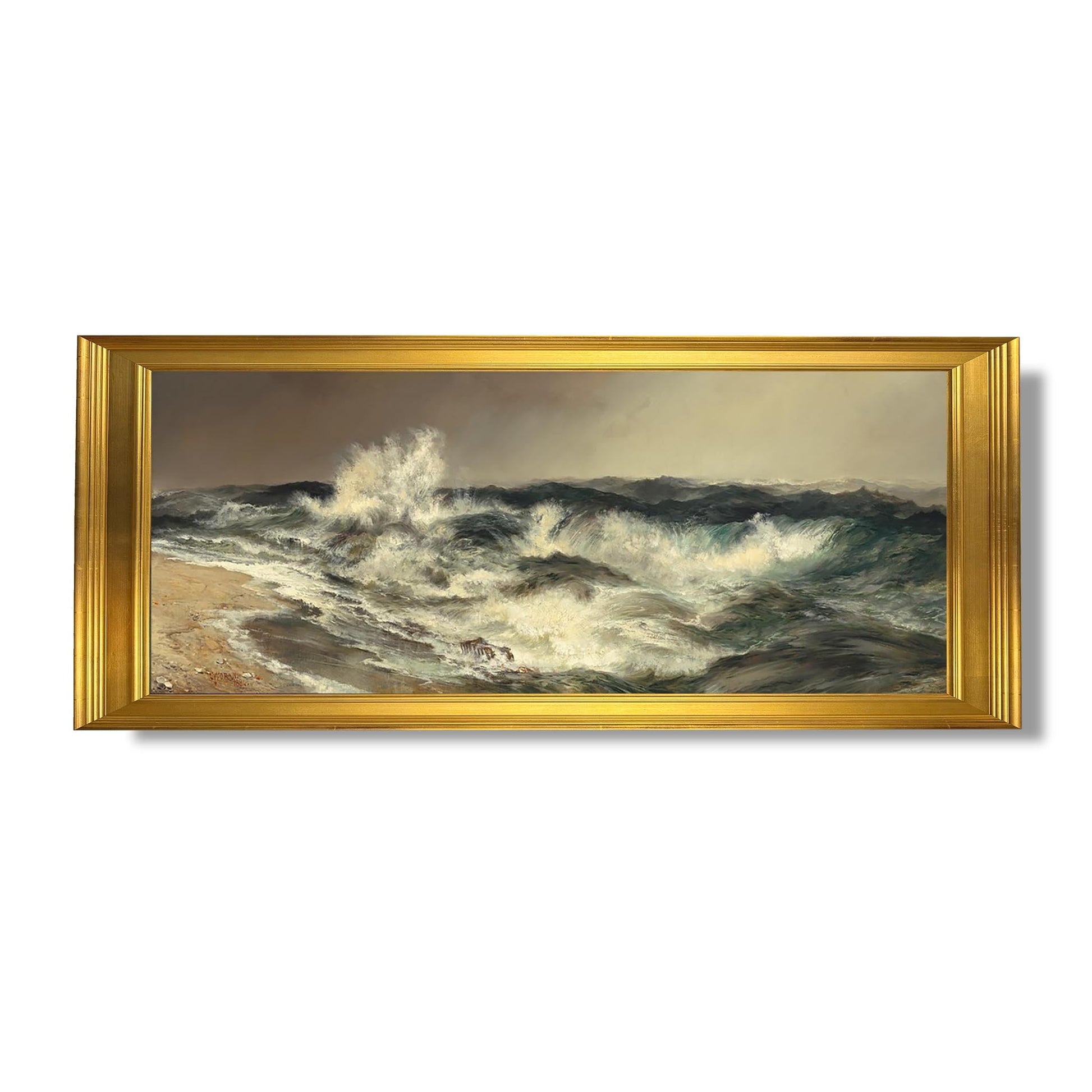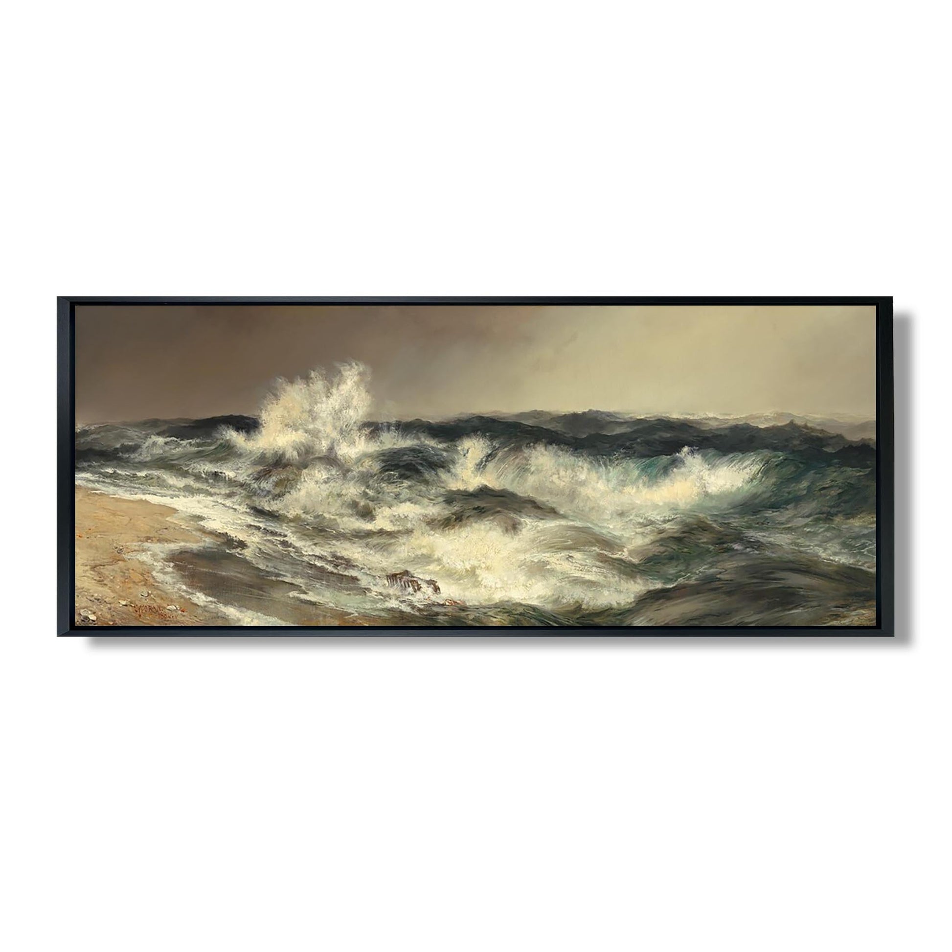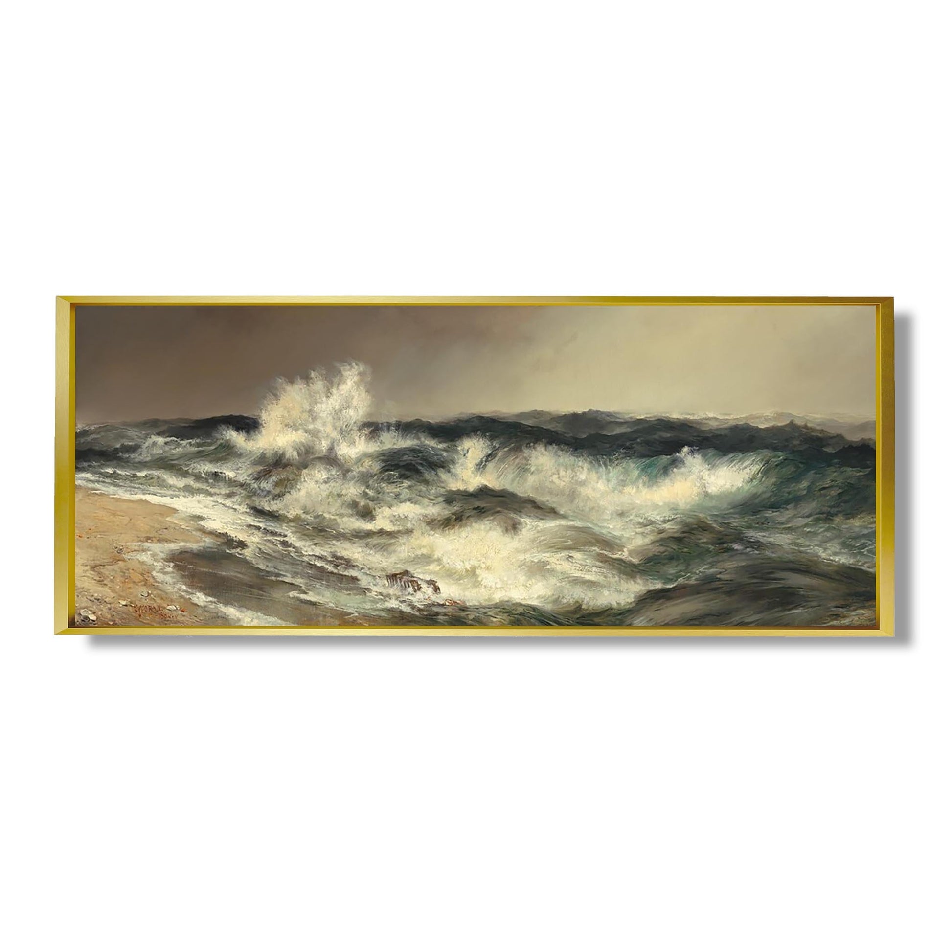 „The Much Resounding Sea“ ist ein ikonisches Werk von Thomas Moran, einem amerikanischen Maler des 19. Jahrhunderts, der für seine grandiosen Landschaften berühmt ist. Dieses 1892 gemalte Gemälde fängt die Majestät des Ozeans ein, wo tosende Wellen gegen Felsen schlagen und eine Atmosphäre schaffen, die zugleich wild und beruhigend ist. Moran verwendet leuchtende Farben und Lichtspiele, um die Kraft der Natur hervorzurufen. Sein romantischer Stil spiegelt eine tiefe Bewunderung für amerikanische Landschaften wider und betont gleichzeitig die Fragilität der Umwelt angesichts der Industrialisierung. Dieses Werk verkörpert die Harmonie zwischen Mensch und Natur.