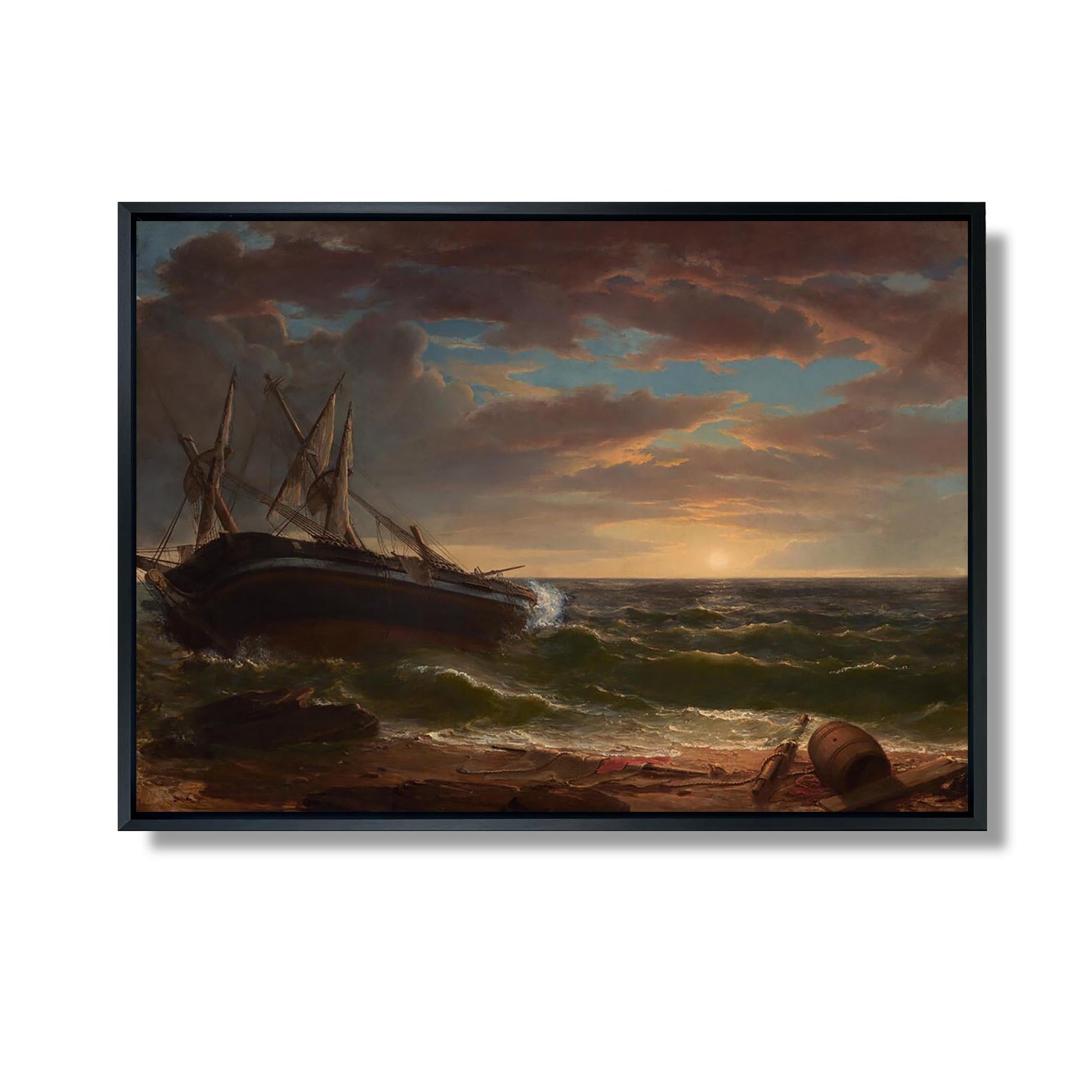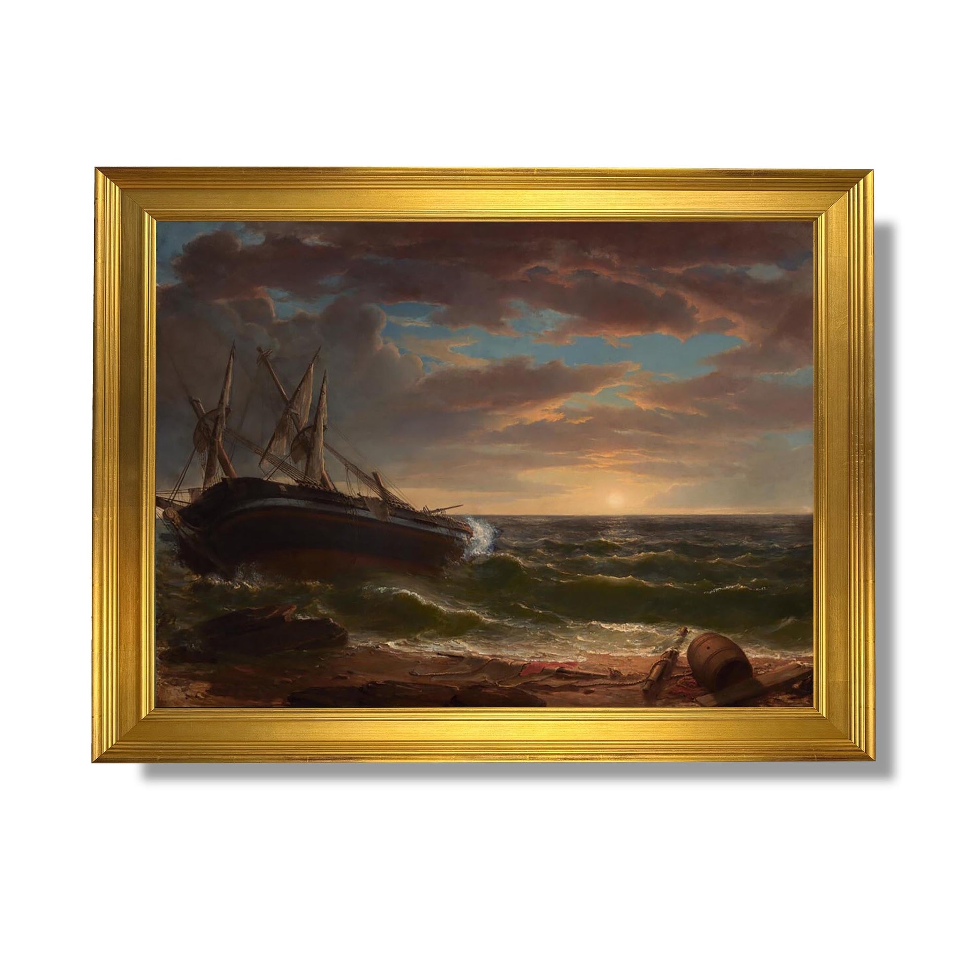 „Das gestrandete Schiff“ von Asher Brown Durand aus dem Jahr 1850 ist ein ikonisches Werk der amerikanischen Romantik. Dieses Gemälde zeigt ein an einen Strand gespültes Schiffswrack, umgeben von üppiger Natur. Durand, ein Meister der Landschaftsmalerei, nutzt kleinste Details, um die wilde Schönheit der Szene einzufangen. Das Werk thematisiert die Verwüstung und den Kampf des Menschen gegen die Kräfte der Natur. Mit dieser Komposition lädt Durand den Betrachter ein, über die Fragilität der menschlichen Existenz angesichts der Unermesslichkeit der natürlichen Welt nachzudenken.