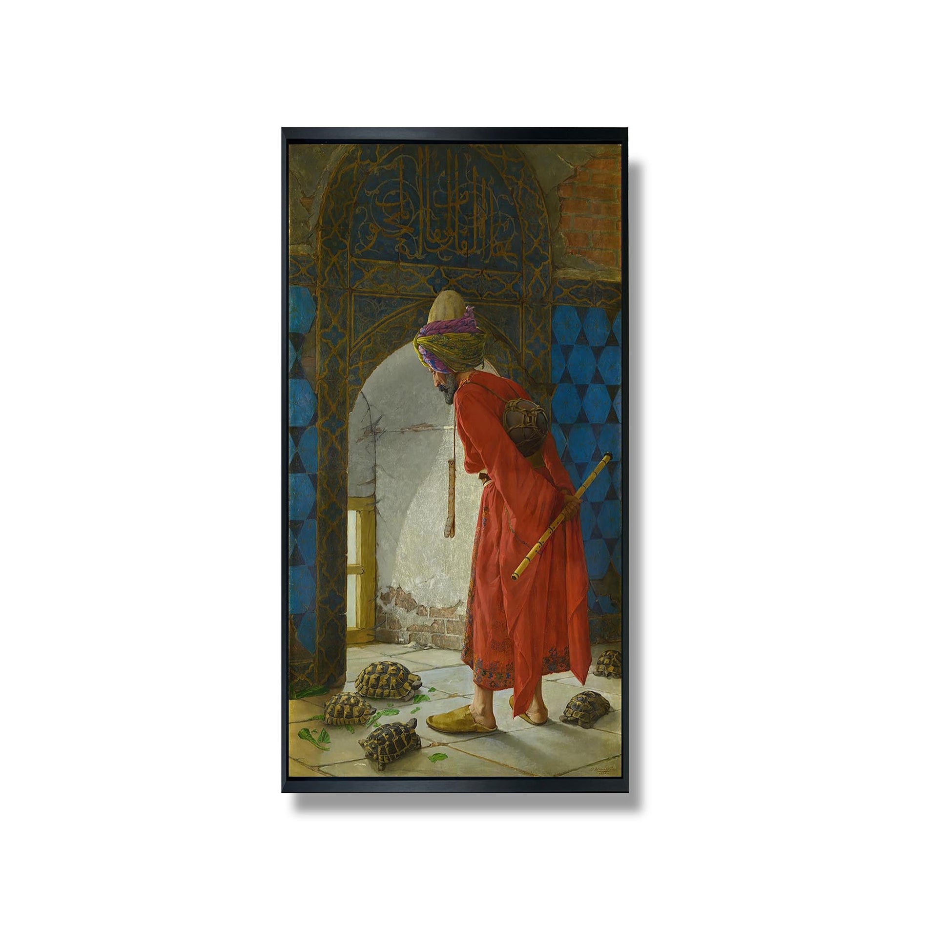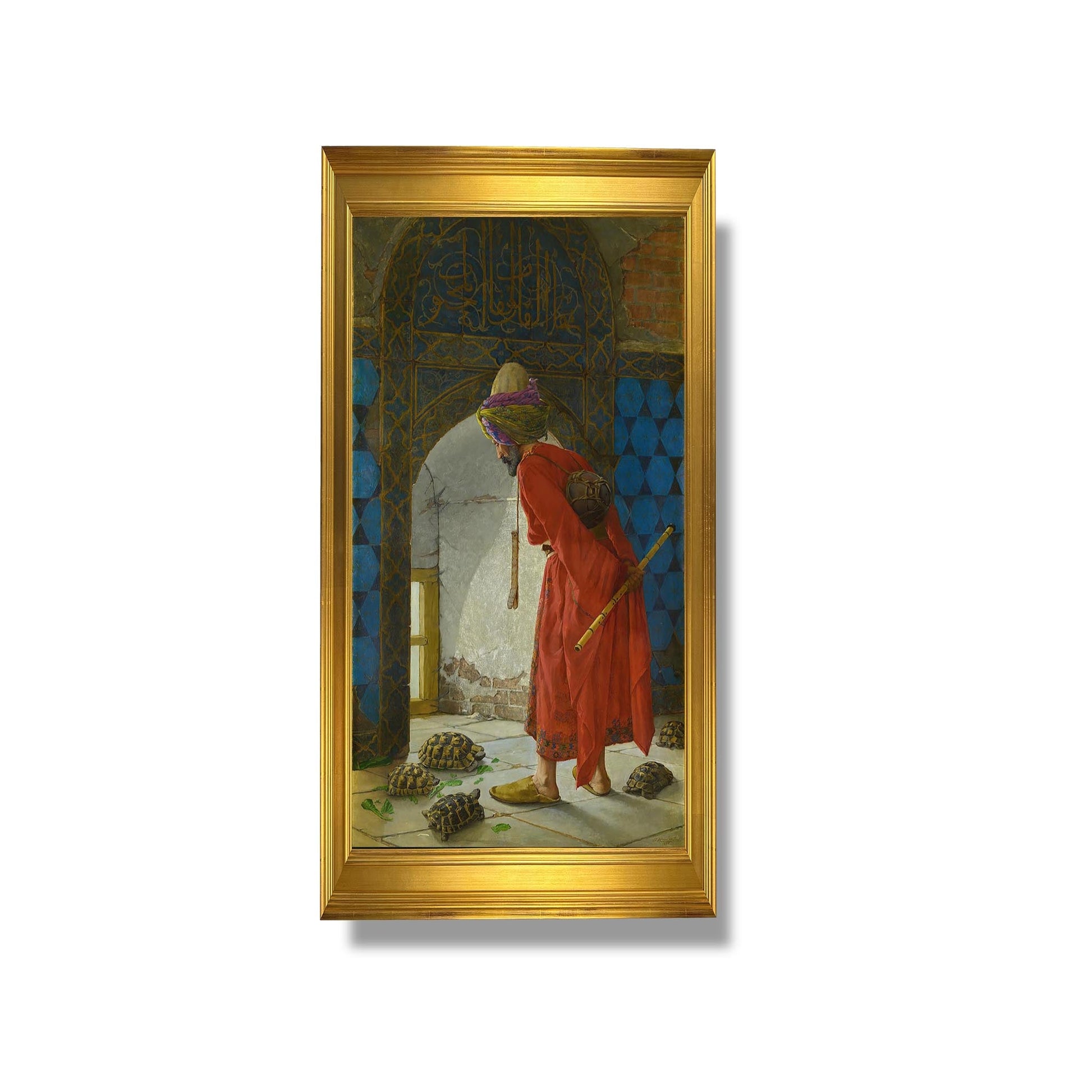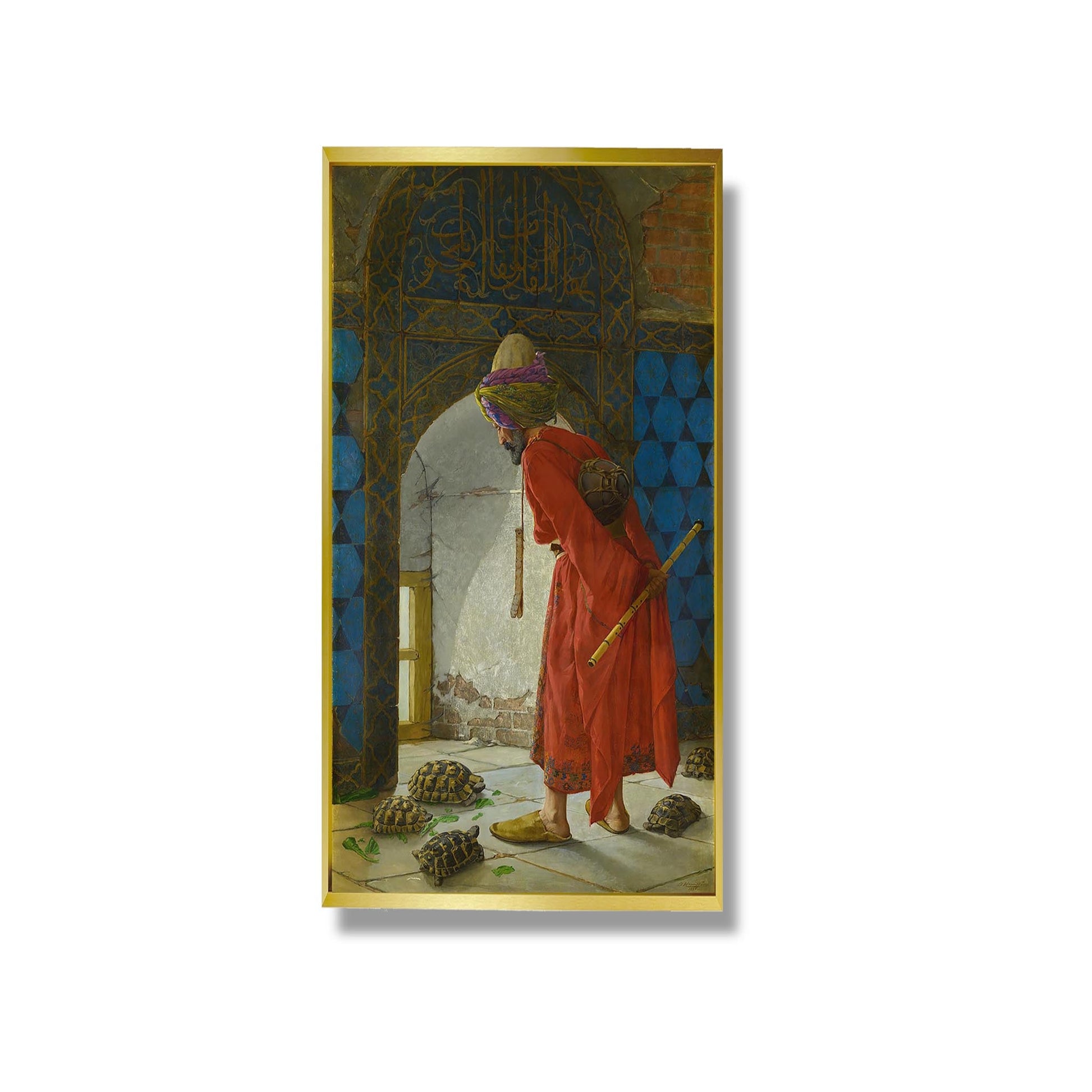 „Der Schildkrötentrainer“ ist ein ikonisches Werk des osmanischen Künstlers Osman Hamdi Bey aus dem Jahr 1906. Das Gemälde zeigt einen Mann in traditioneller Tracht, der auf einer Bank sitzt und aufmerksam eine Schildkröte beobachtet, die er trainiert. Das Werk symbolisiert Geduld und Weisheit und greift Themen der osmanischen Kultur auf. Hamdi Bey, ebenfalls Archäologe und Intellektueller, verwendet Elemente der Natur, um die Beziehung zwischen Mensch und Tier widerzuspiegeln. Die harmonische Komposition und die sorgfältigen Details sind ein Beweis für sein technisches Können und sein Engagement für die türkische kulturelle Identität.