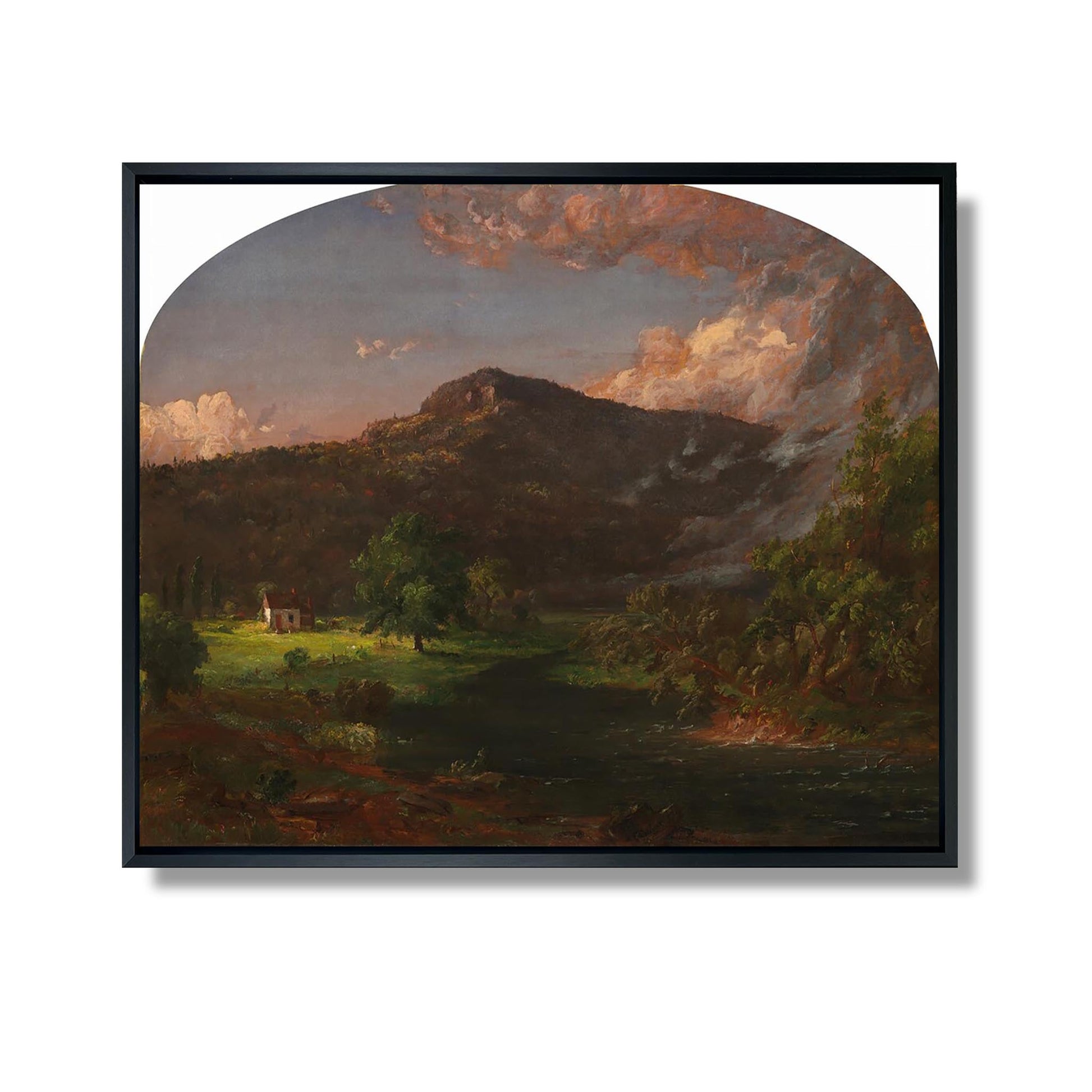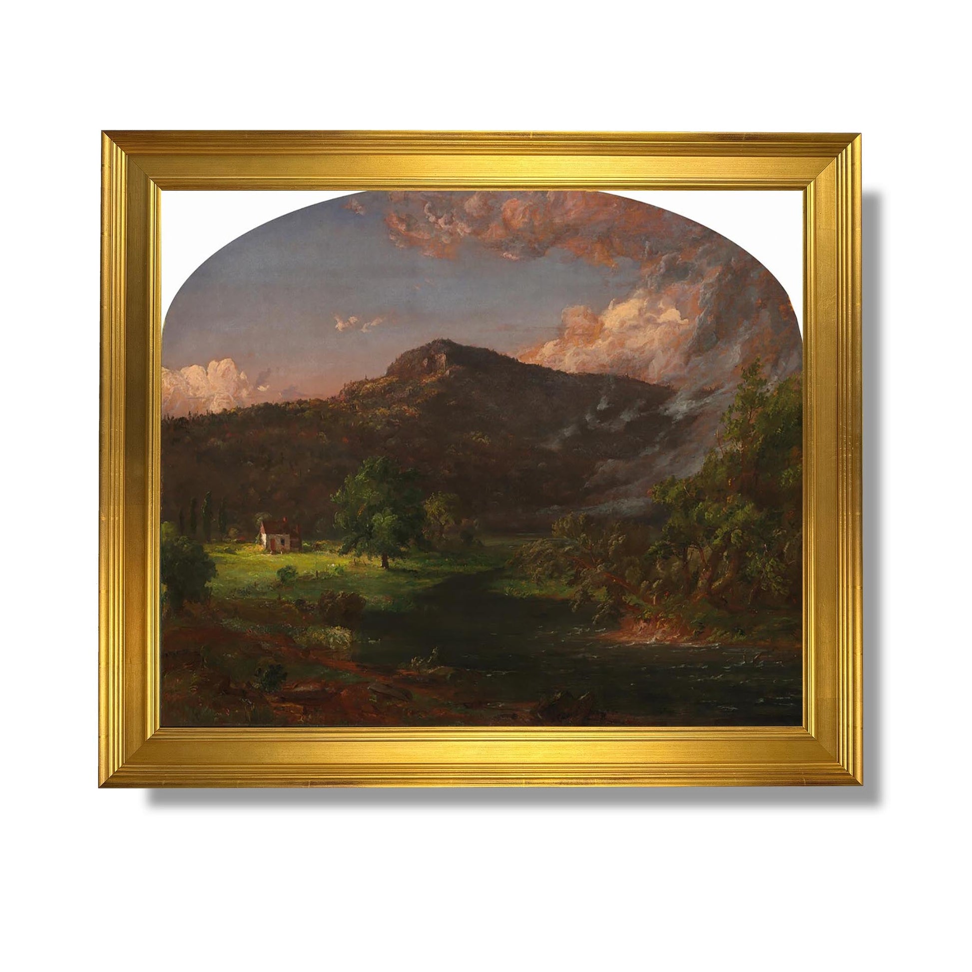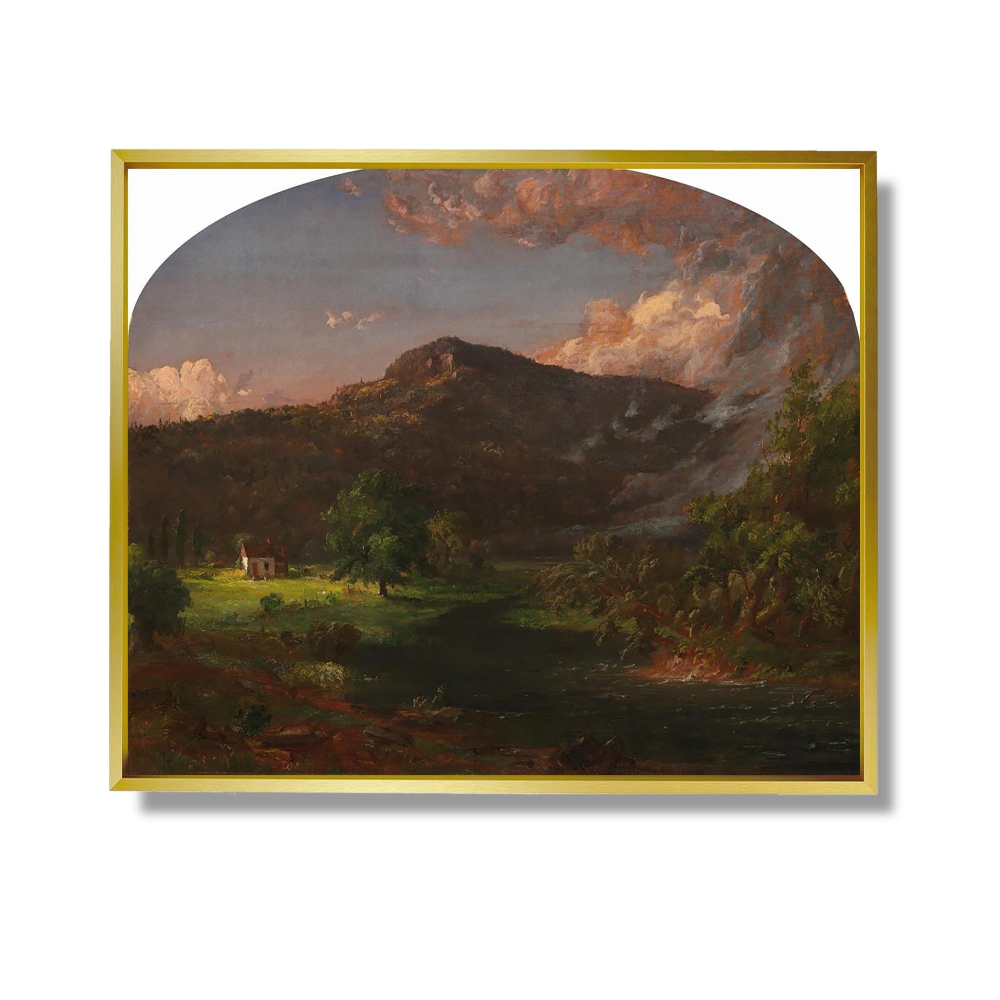 „Tourn Mountain, Head Quarters of Washington, Rockland Co., New York“ ist ein ikonisches Werk von Jasper Francis Cropsey, einem Meister der amerikanischen Landschaftsmalerei des 19. Jahrhunderts. Dieses 1865 gemalte Gemälde fängt die Erhabenheit der Berge und die natürliche Schönheit der Region New York ein. Cropsey, bekannt für seinen lebhaften Einsatz von Farbe und Licht, ruft eine romantische und nostalgische Atmosphäre hervor. Das Werk veranschaulicht nicht nur das Talent des Künstlers zur Darstellung der Natur, sondern auch sein Engagement für die amerikanische Geschichte und verweist auf die Bedeutung dieses Ortes während der Revolution.