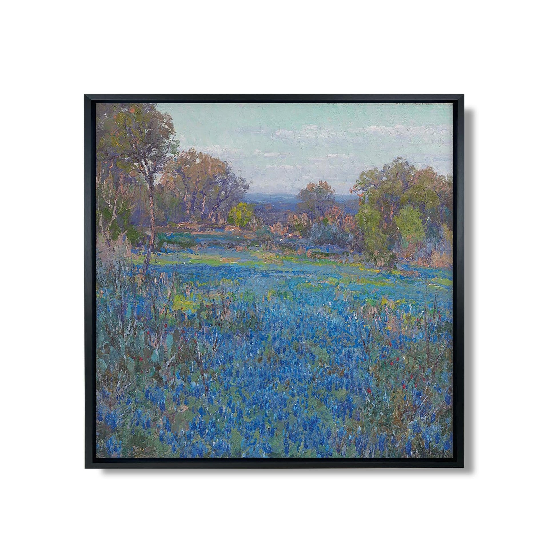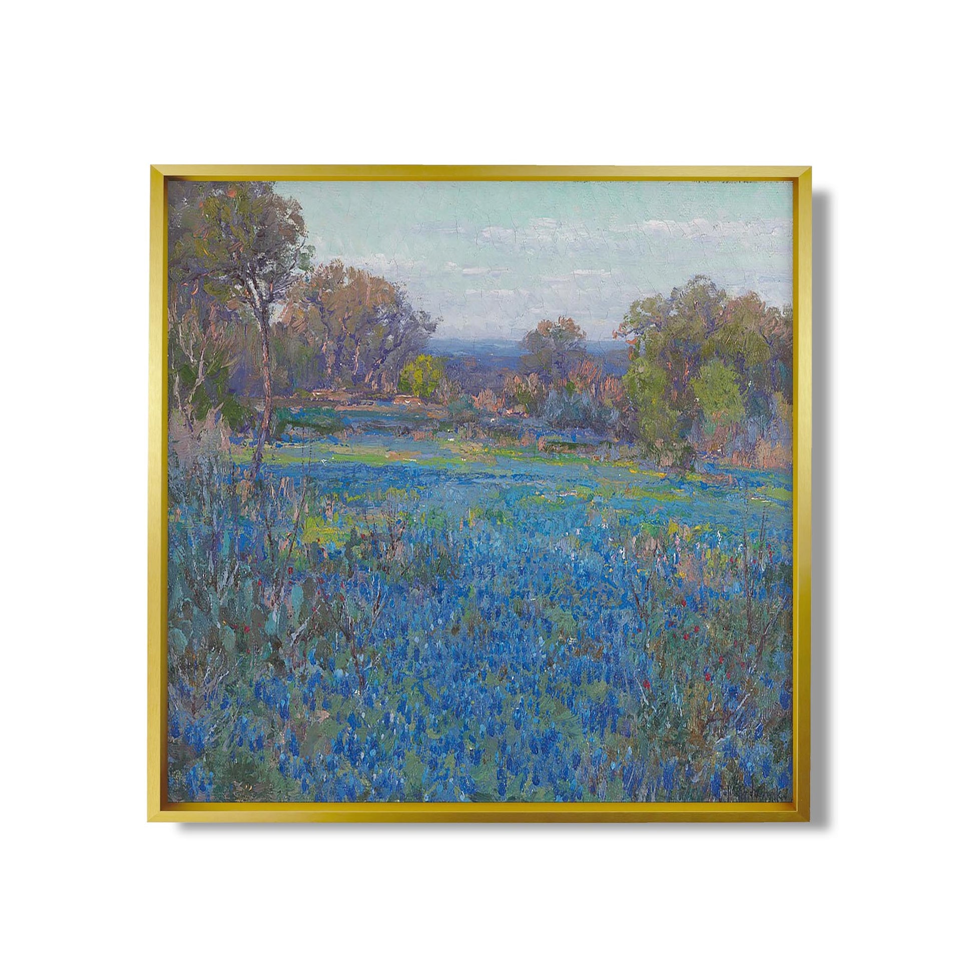 „A Field of Blue Bonnets, Late Afternoon Sun“ ist ein ikonisches Werk von Julian Onderdonk, einem amerikanischen Maler des frühen 20. Jahrhunderts, der für seine Blumenlandschaften bekannt ist. In diesem Gemälde fängt Onderdonk die Schönheit der Blue Bonnets, texanischer Wildblumen, ein, die im goldenen Licht der untergehenden Sonne getaucht sind. Die lebendigen Blau- und Grüntöne erzeugen eine friedliche und heitere Atmosphäre, während die harmonische Komposition zum Nachdenken einlädt. Dieses Werk veranschaulicht perfekt Onderdonks Talent, die texanische Natur zu verewigen und die Pracht der lokalen Landschaften zu feiern.