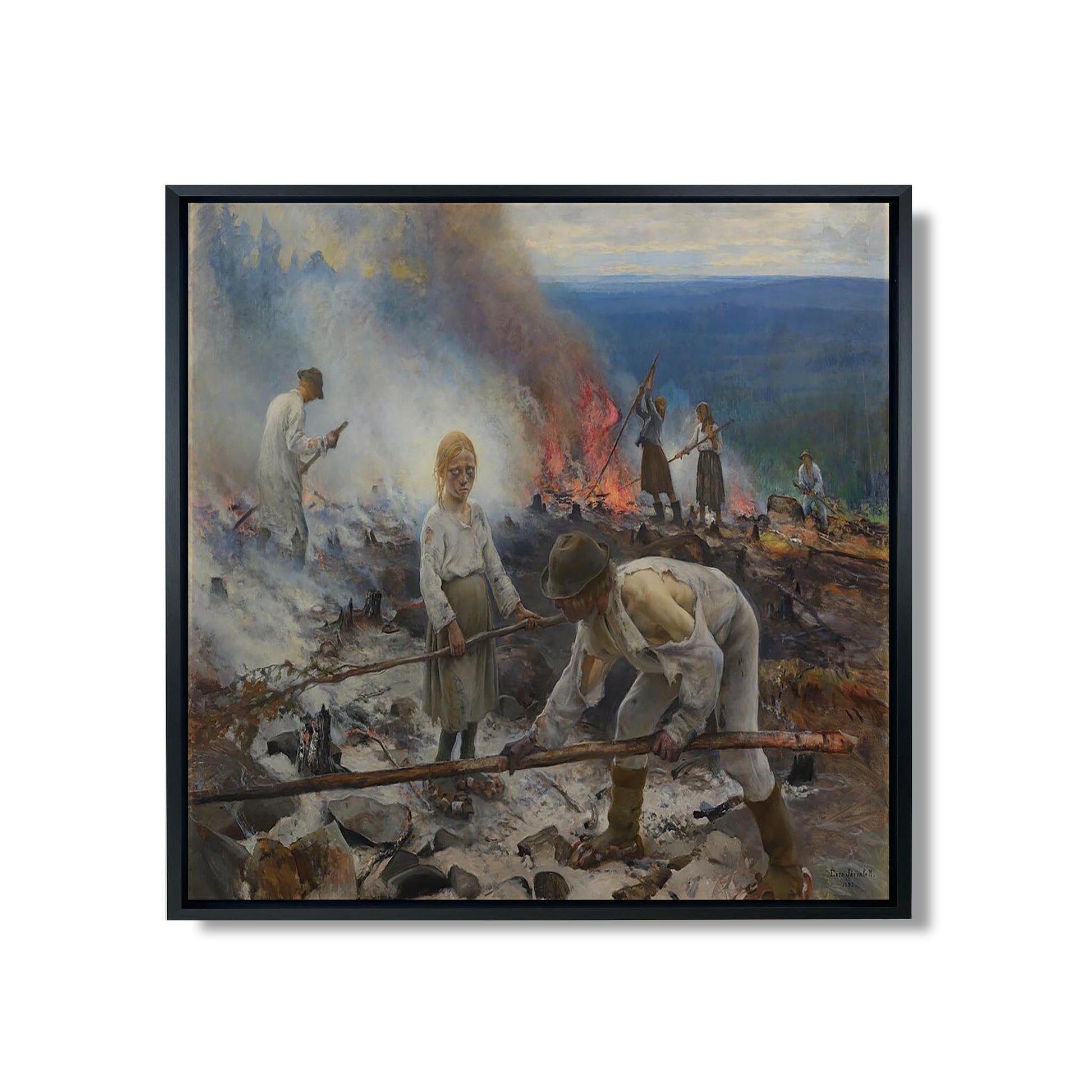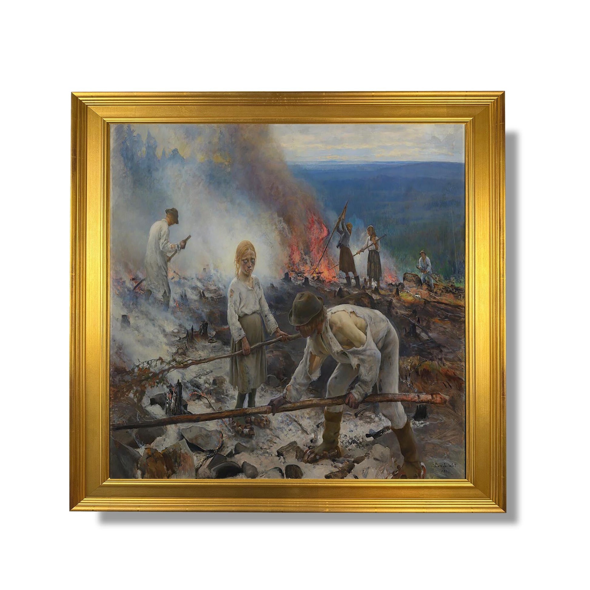„Unter dem Joch (Reisig verbrennen)“ ist ein ikonisches Werk des finnischen Künstlers Eero Järnefelt, gemalt im Jahr 1893. Das Gemälde zeigt eine ländliche Szene mit Bauern, die Reisig verbrennen, was sowohl harte Arbeit als auch den Kampf ums Überleben symbolisiert. Järnefelt, beeinflusst von der naturalistischen Bewegung, fängt Licht und Texturen mit großer Präzision ein und schafft so eine Atmosphäre, die sowohl realistisch als auch poetisch ist. Das Werk spiegelt die Harmonie zwischen Mensch und Natur wider und beleuchtet gleichzeitig die Herausforderungen des Bauernlebens im Finnland des späten 19. Jahrhunderts.