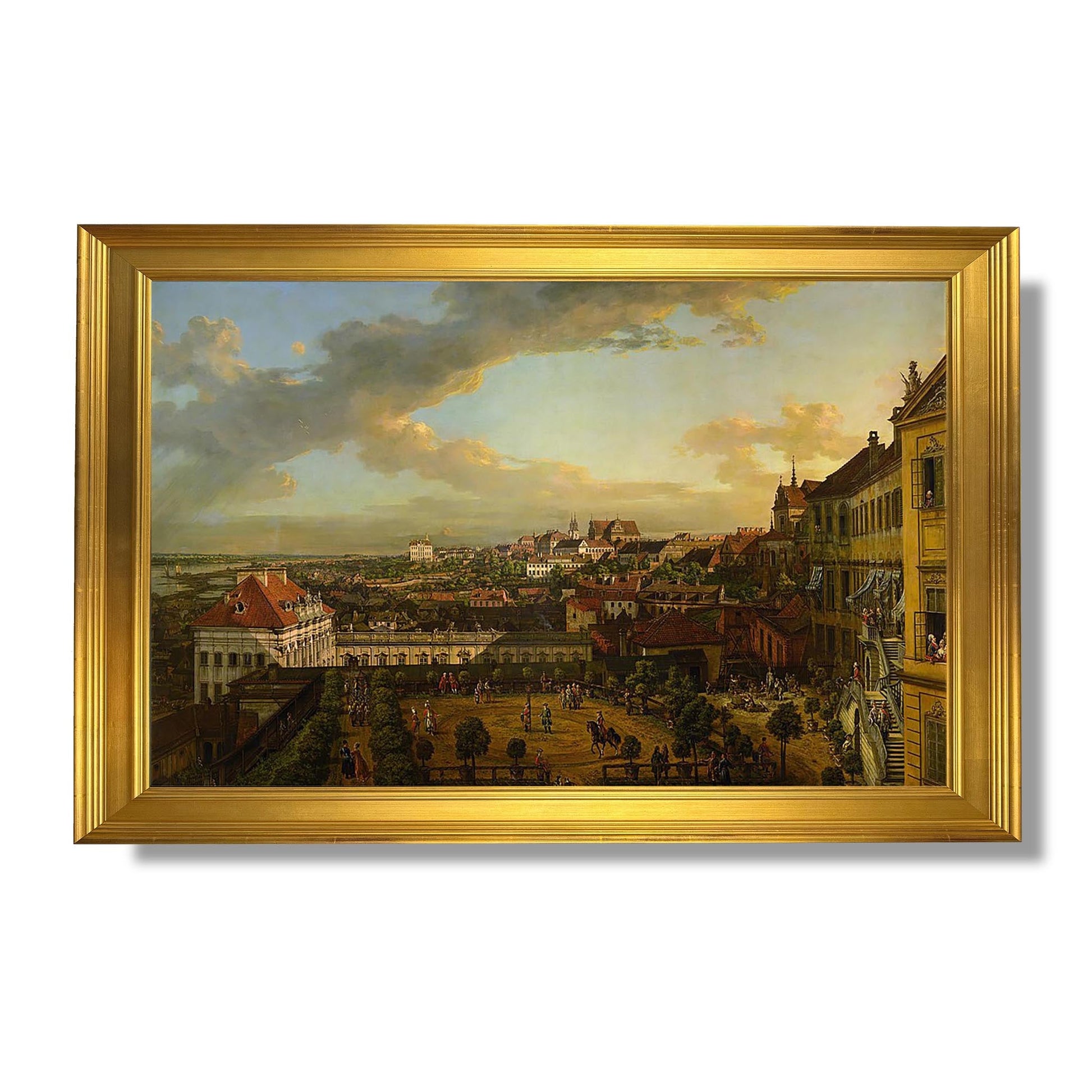 „Blick auf Warschau vom Königsschloss aus“ ist ein ikonisches Werk von Bernardo Bellotto, einem Meister der Stadtlandschaft des 18. Jahrhunderts. Dieses zwischen 1770 und 1775 gemalte Gemälde bietet eine Panoramaperspektive der Stadt Warschau und hebt ihre barocke Architektur und ihre berühmten Monumente hervor. Bellotto, bekannt für seine Liebe zum Detail, fängt das tägliche Leben der Bewohner und das geschäftige Treiben auf den Straßen ein. Licht und Schatten spielen eine entscheidende Rolle und schaffen eine lebendige Atmosphäre. Dieses Werk ist ein Beweis für die Bedeutung Warschaus zu dieser Zeit und für Bellottos Fähigkeit, historische Szenen mit Präzision und Schönheit zu verewigen.