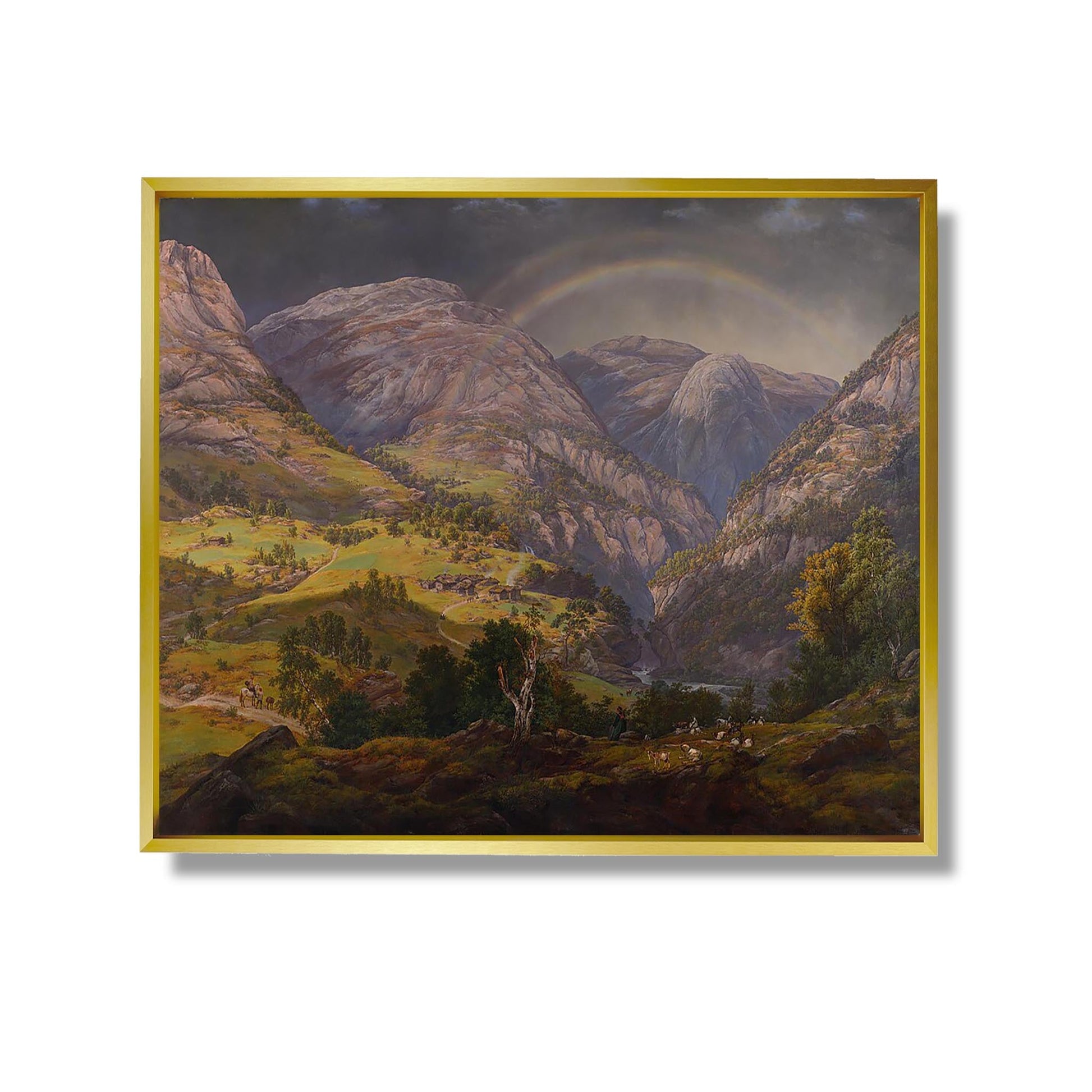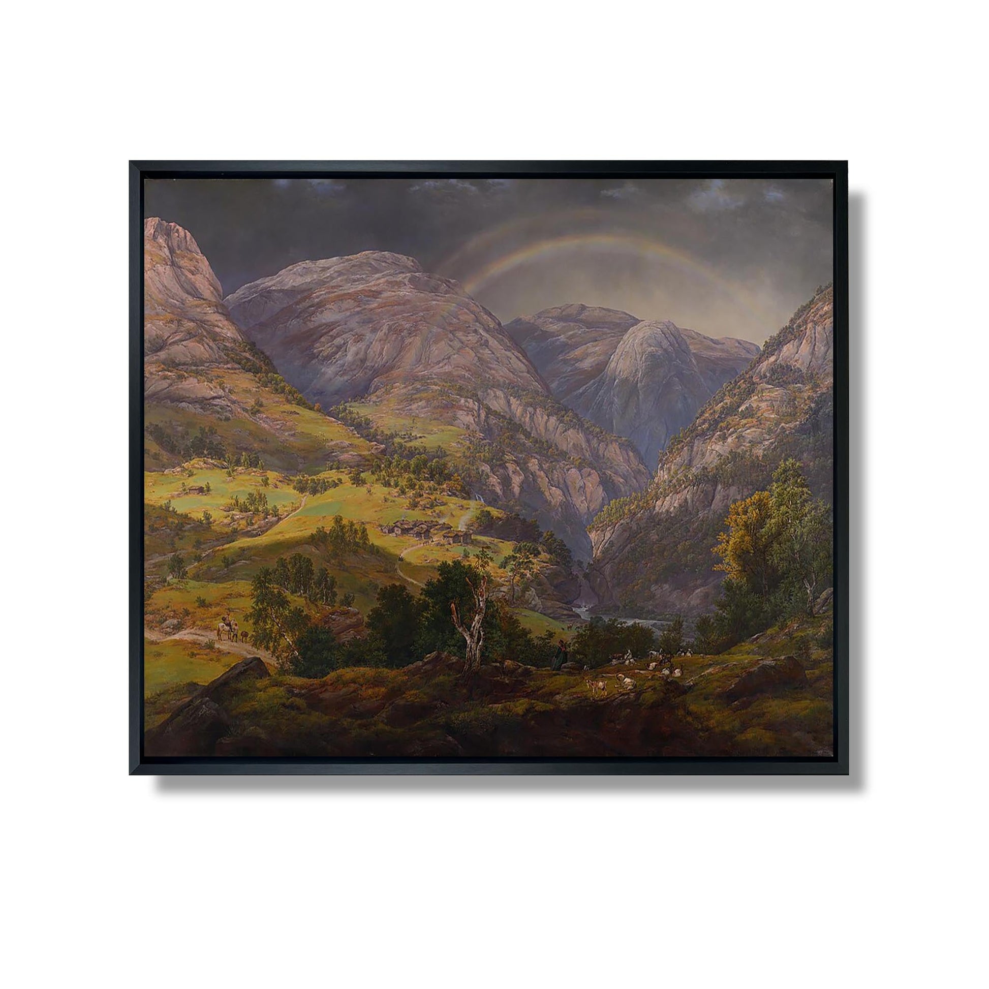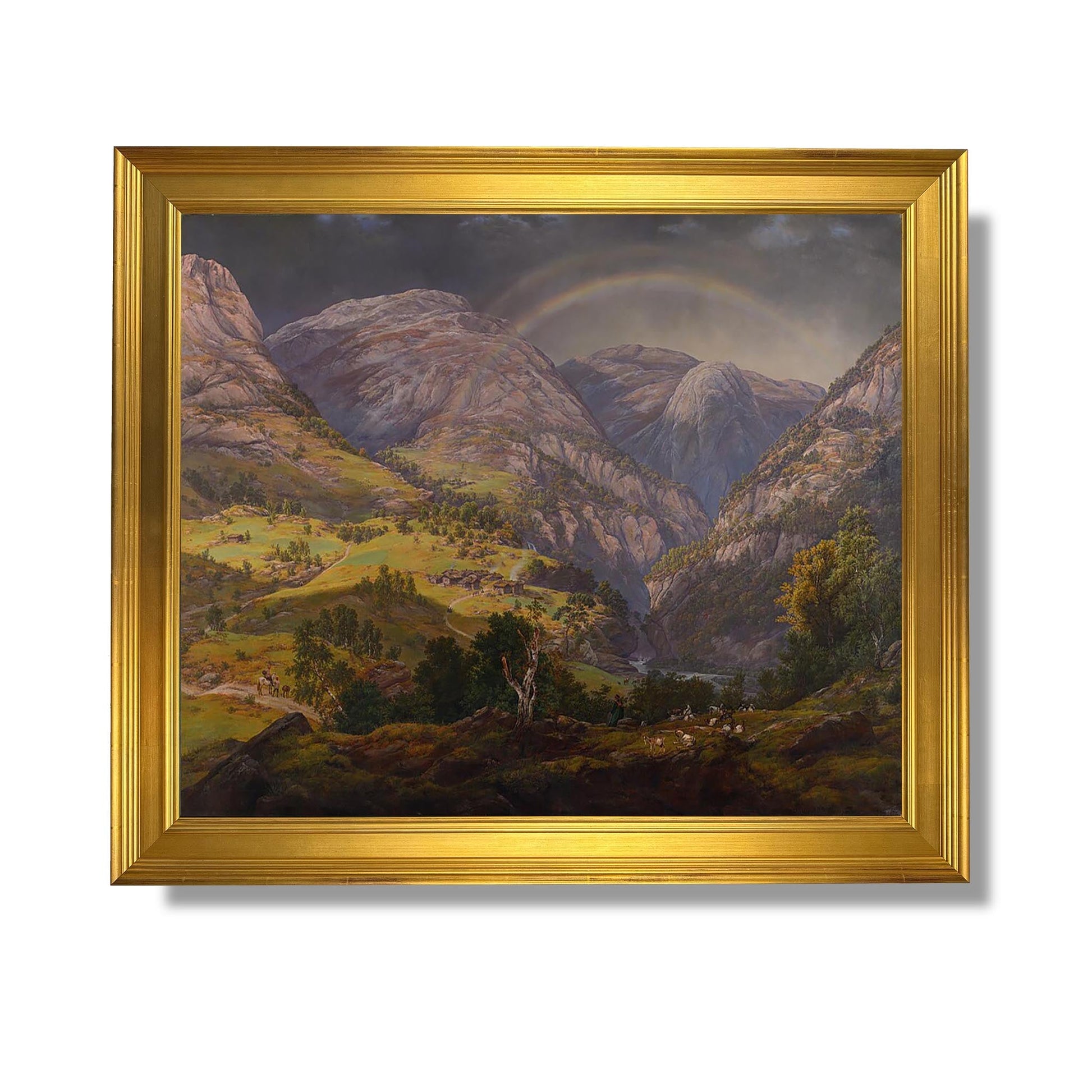 „Blick von Stalheim“ ist ein ikonisches Werk von Johan Christian Claussen Dahl, einem norwegischen Maler des 19. Jahrhunderts, der für seine Rolle in der Romantik bekannt ist. Dieses 1842 gemalte Gemälde fängt die Erhabenheit der norwegischen Landschaft ein und hebt das Nærøyfjordtal hervor. Dahl verwendet leuchtende Farben und auffällige Kontraste, um die Erhabenheit der Natur hervorzurufen. Die Komposition mit ihren imposanten Bergen und dem dramatischen Himmel lädt den Betrachter ein, die Kraft und wilde Schönheit der nordischen Landschaft zu spüren und spiegelt gleichzeitig die romantische Seele ihrer Zeit wider.