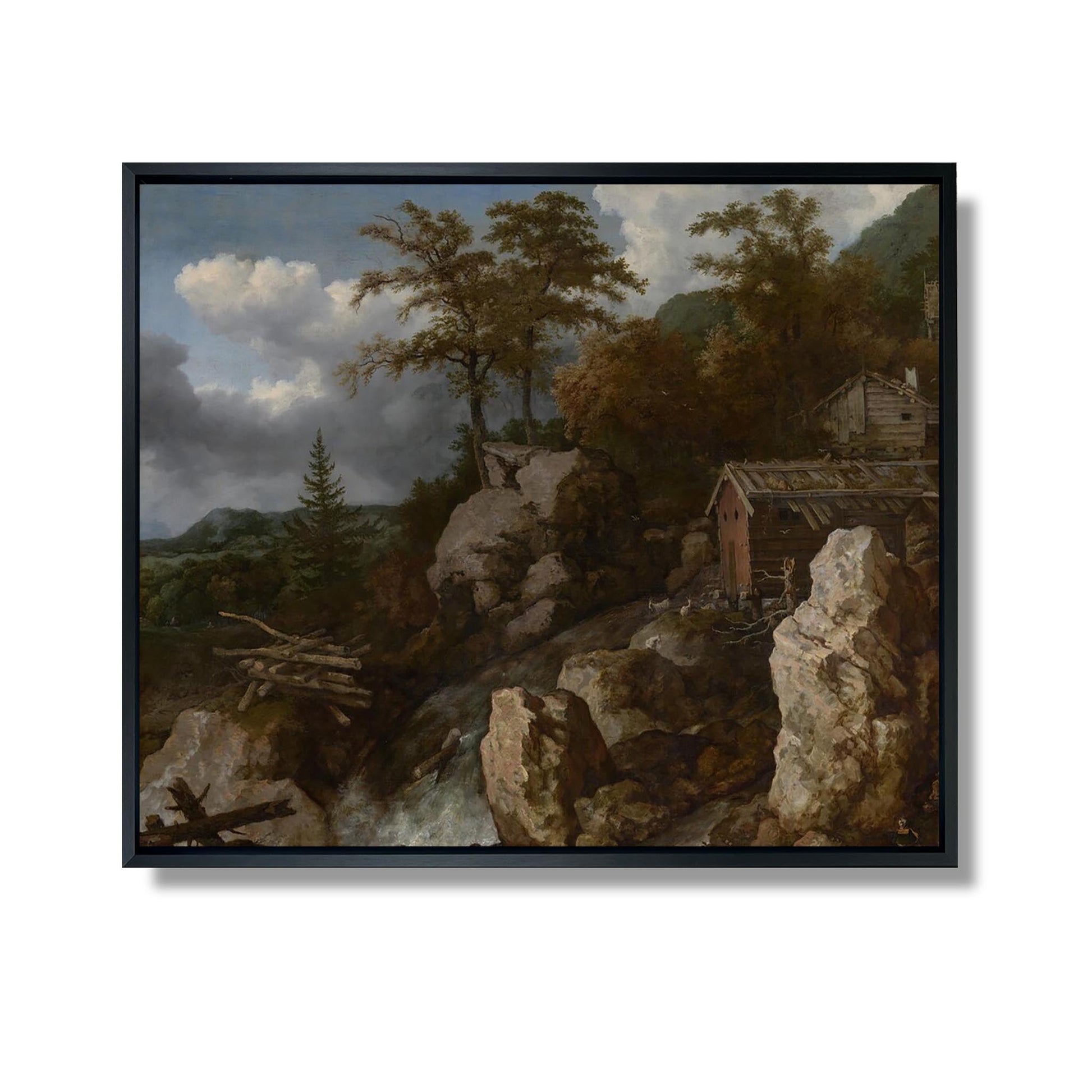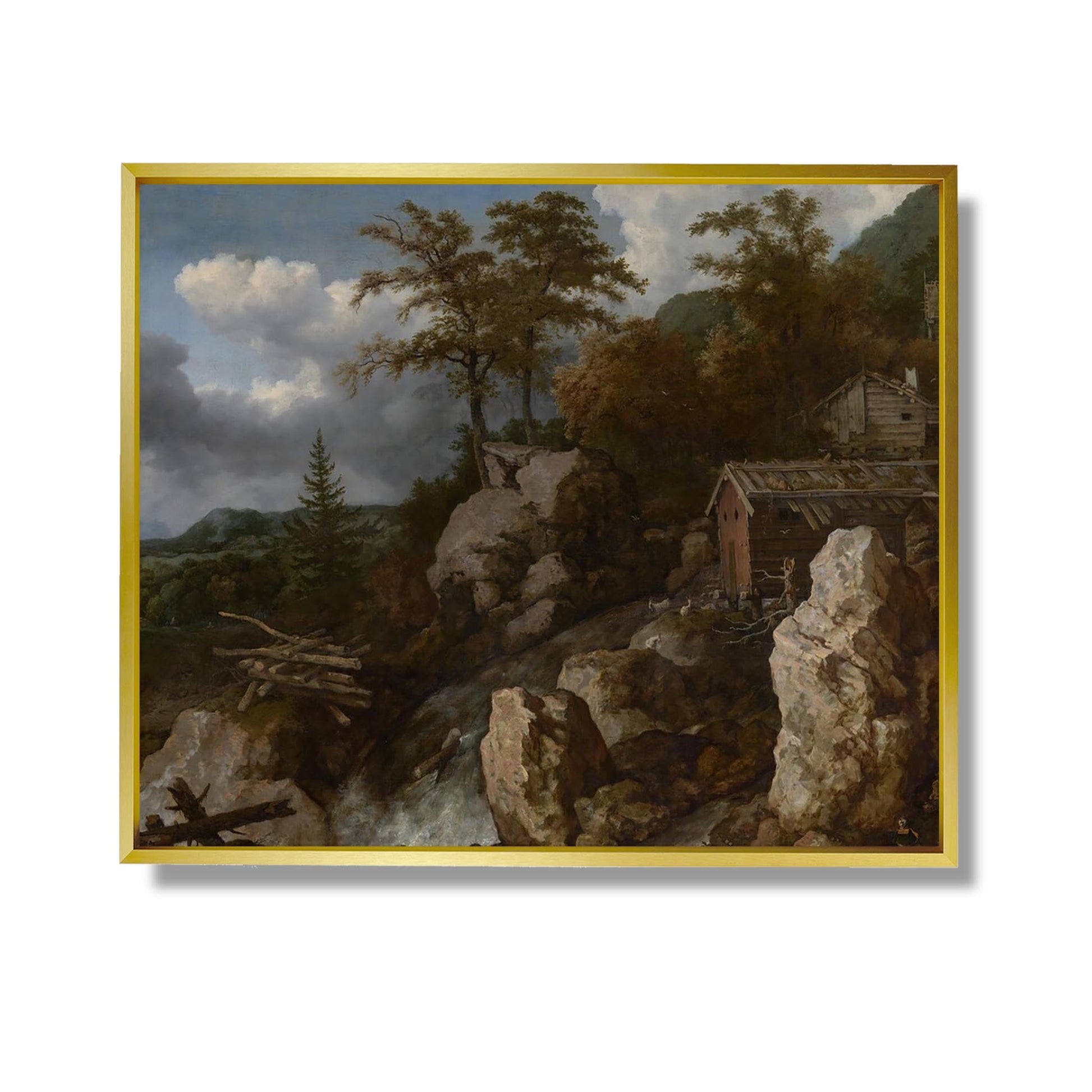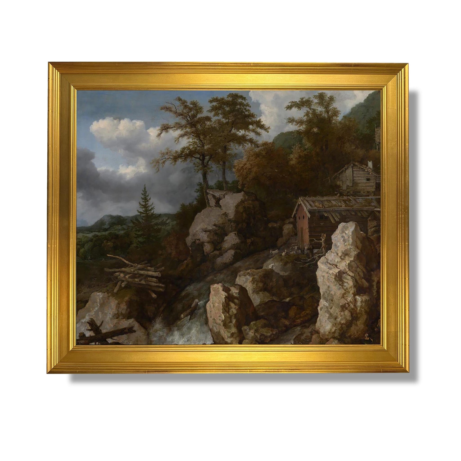 „Wasserfall mit Blockhütten“ ist ein ikonisches Werk des niederländischen Malers Allart van Everdingen, geschaffen im 17. Jahrhundert. Dieses Gemälde zeigt eine romantische und wilde Landschaft, in der ein majestätischer Wasserfall mit voller Kraft herabstürzt, umgeben von malerischen Blockhütten. Van Everdingen, beeinflusst von norwegischen Landschaften, fängt die Schönheit der Natur mit einer reichen Palette und akribischer Detailgenauigkeit ein. Das Werk beschwört sowohl die Kraft der Natur als auch die Ruhe des Landlebens herauf und spiegelt die Harmonie zwischen dem Menschen und seiner Umwelt wider. Es ist ein eindrucksvolles Beispiel des Barockstils, der Realismus und Idealisierung vermischt.