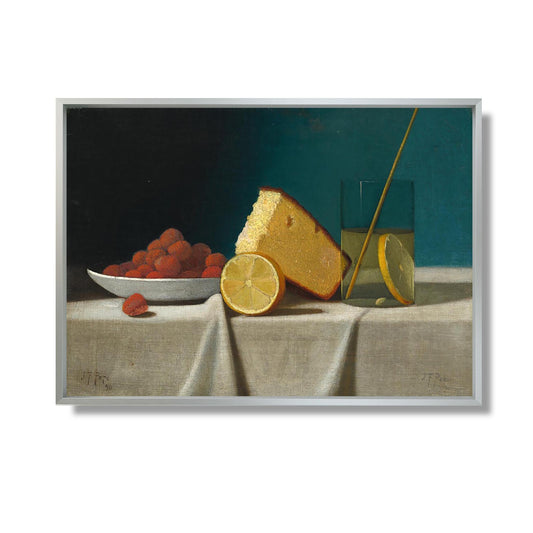 Stillleben mit Kuchen, Zitrone, Erdbeeren und Glas - John Frederick Peto