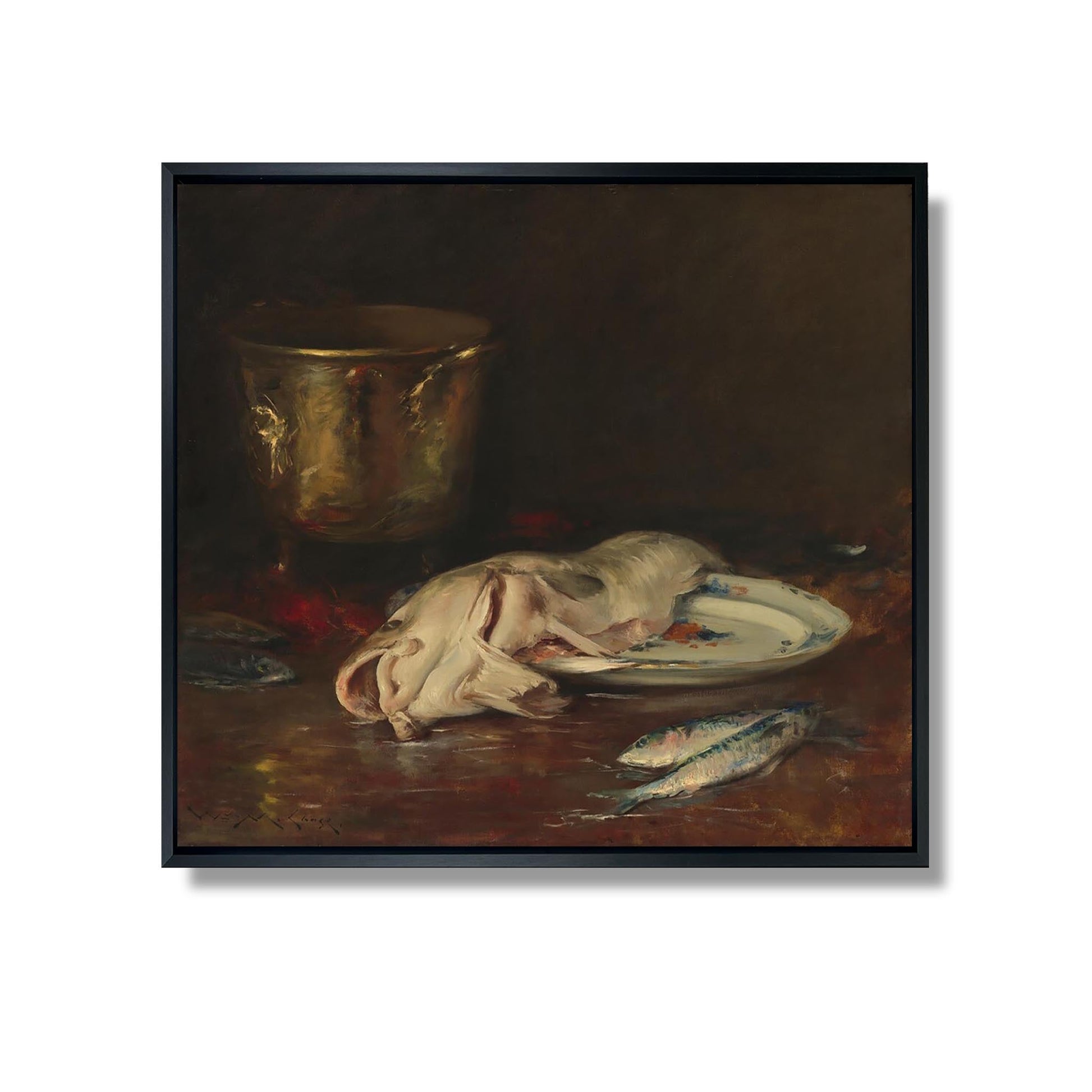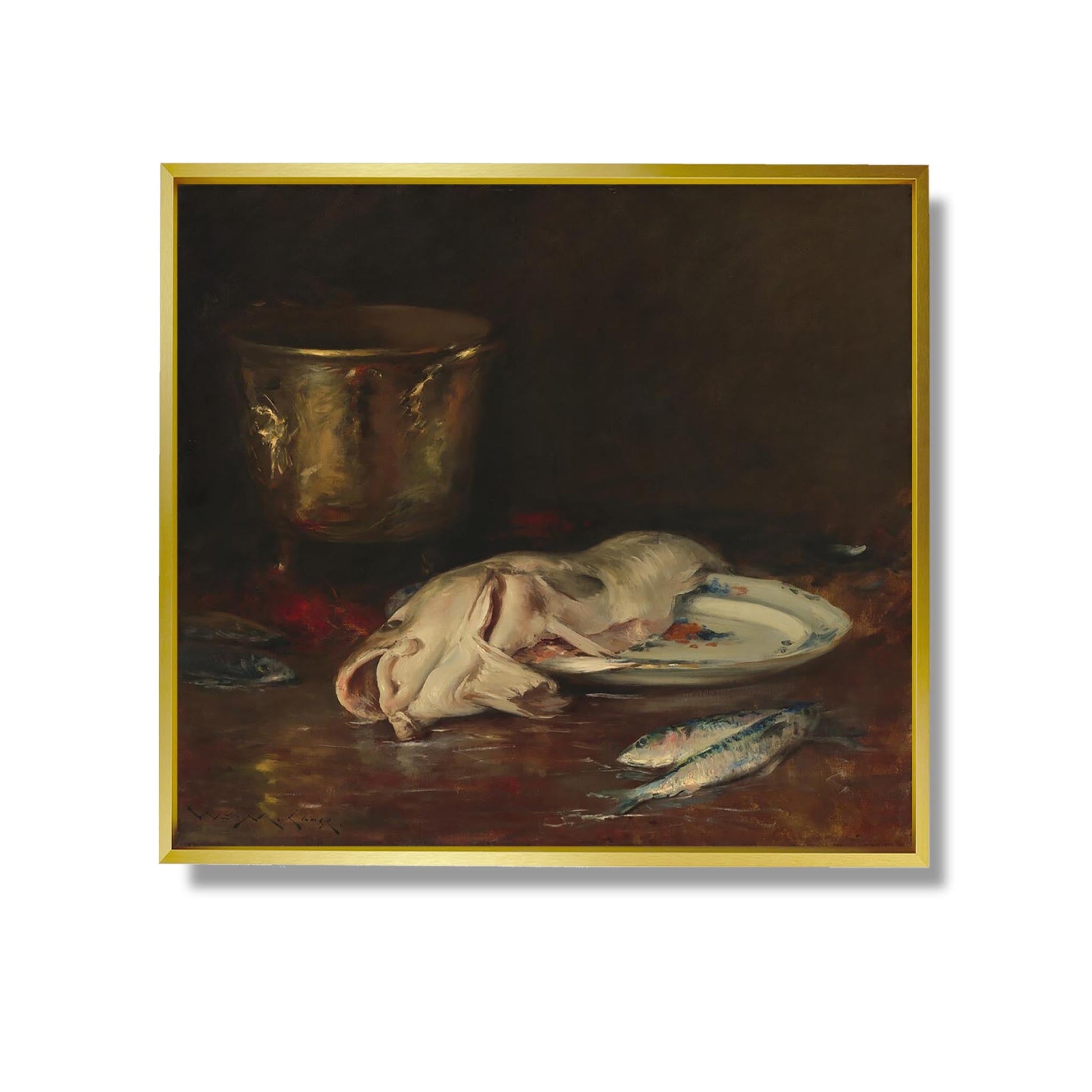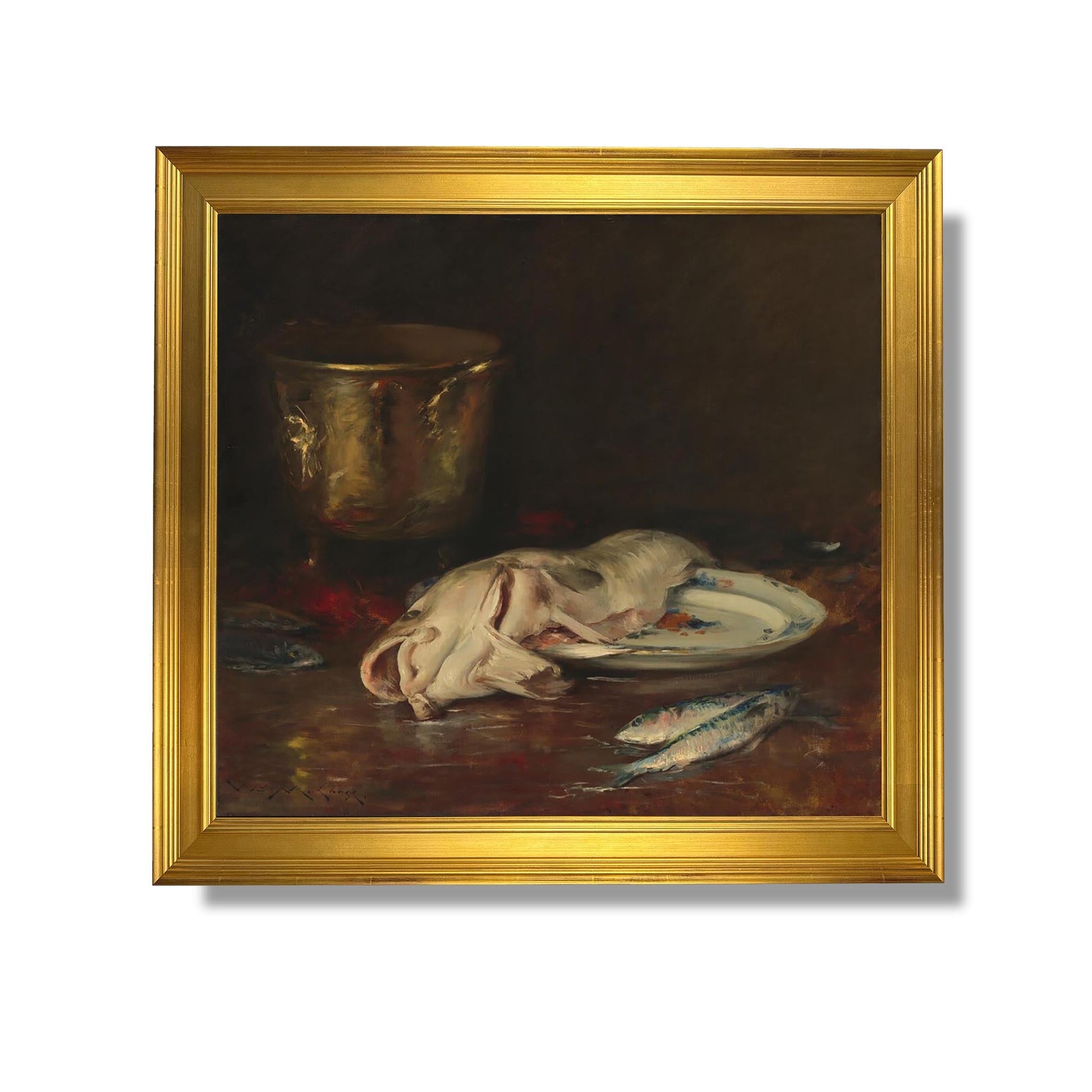 „An English Cod“ von William Merritt Chase ist ein ikonisches Werk der amerikanischen Impressionismus-Bewegung und entstand 1880. Dieses Gemälde zeigt einen Fisch, einen Kabeljau, der auf einem Tisch liegt, umgeben von Alltagsgegenständen. Die Komposition unterstreicht Chases Meisterschaft bei der Darstellung von Texturen und Lichtern und schafft eine Atmosphäre, die sowohl realistisch als auch poetisch ist. Der für seine Stillleben und Landschaften bekannte Künstler verwendet leuchtende Farben und dynamische Pinselstriche, um die flüchtige Schönheit der Natur einzufangen. Dieses Werk veranschaulicht sein Interesse am alltäglichen Leben und sein Talent, gewöhnliche Themen in außergewöhnliche Kunst zu verwandeln.