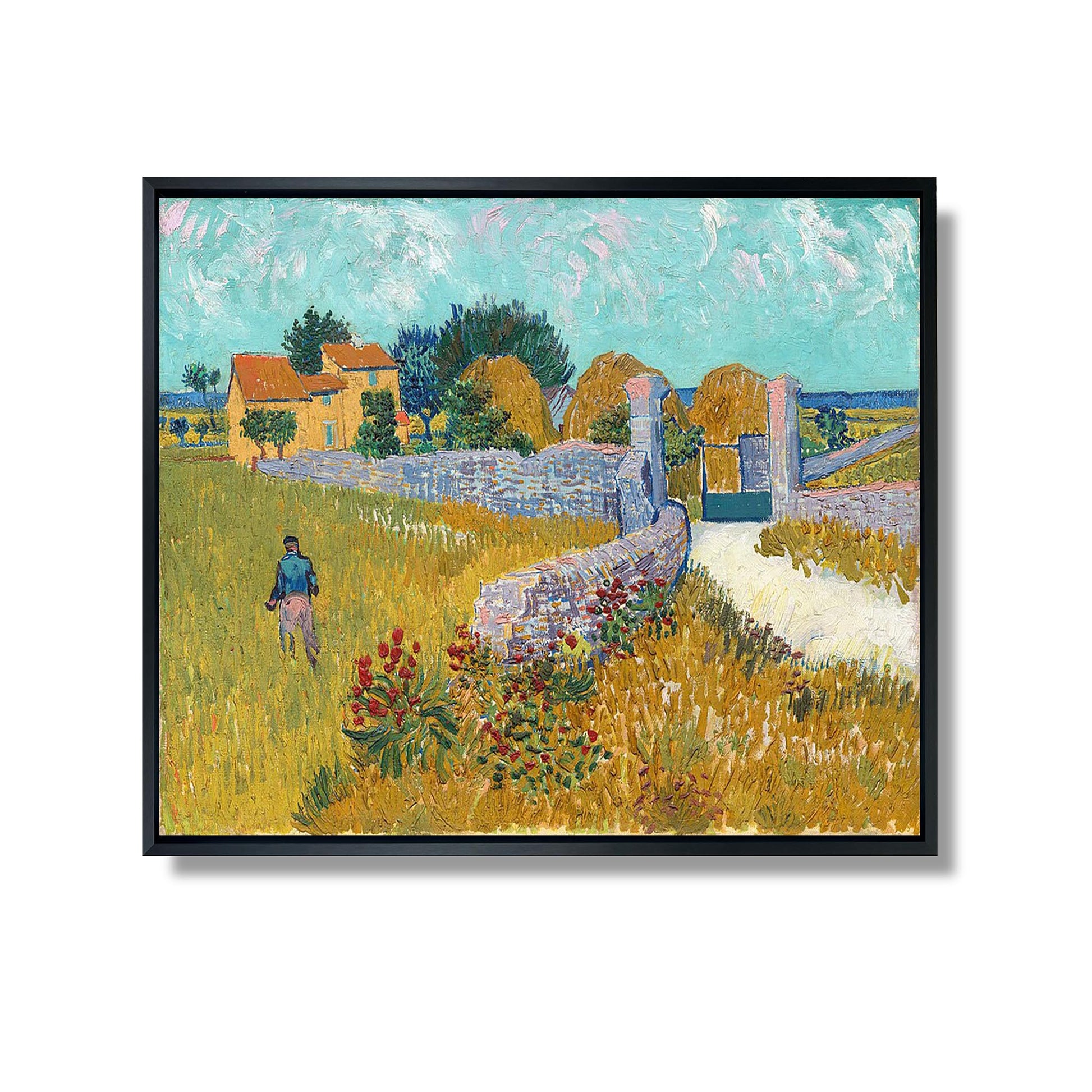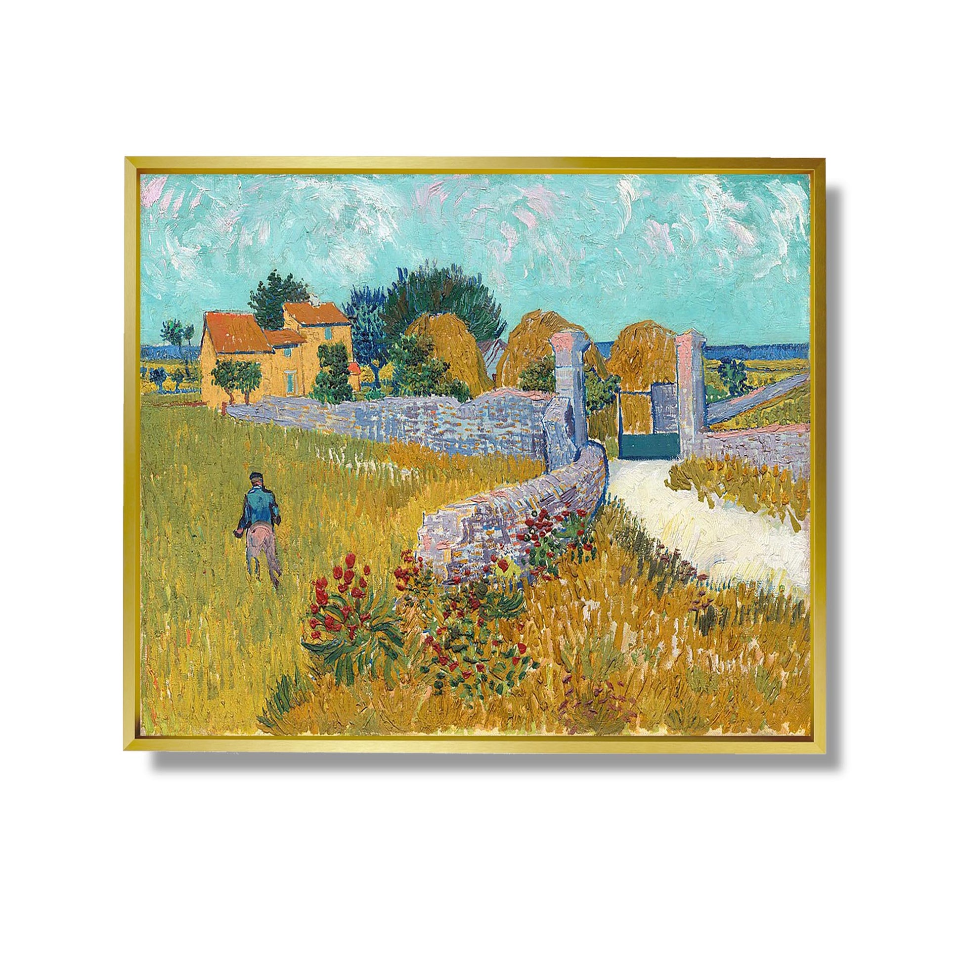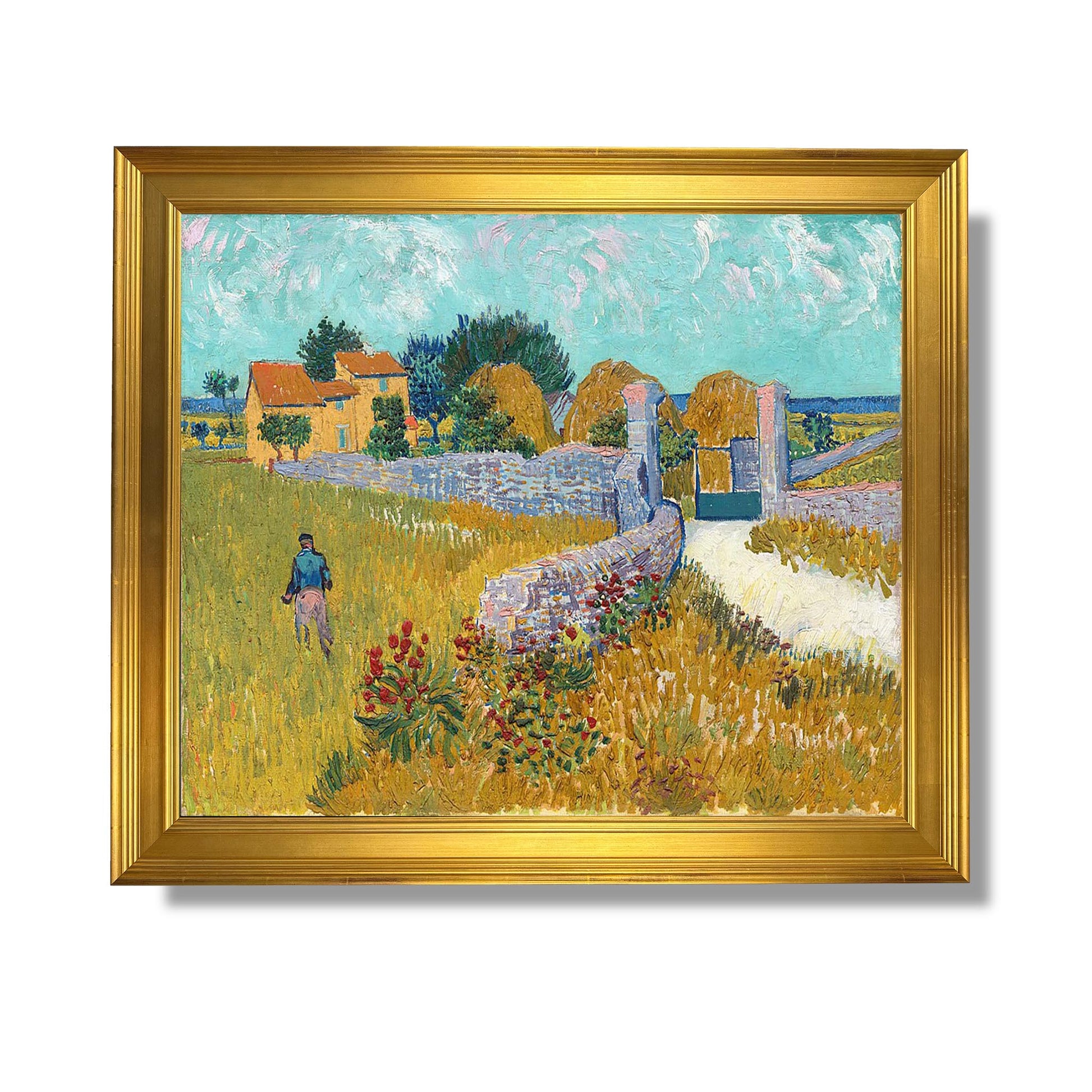 „Bauernhof in der Provence“ ist ein ikonisches Werk von Vincent Van Gogh, das er 1888 während seines Aufenthalts im französischen Arles malte. Dieses Gemälde illustriert das ländliche Leben und die Schönheit der provenzalischen Landschaften, wie es für Van Goghs Kunst charakteristisch ist. Die Komposition zeigt einen von Feldern umgebenen Bauernhof in leuchtenden Farben und mit dynamischen Pinselstrichen, die typisch für seinen postimpressionistischen Stil sind. Die Arbeit spiegelt seine Bewunderung für die Natur und seinen Wunsch wider, die Essenz des alltäglichen Lebens einzufangen. Durch dieses Gemälde drückt Van Gogh seine tiefe Verbundenheit mit der Erde und seine Sehnsucht nach innerem Frieden aus.