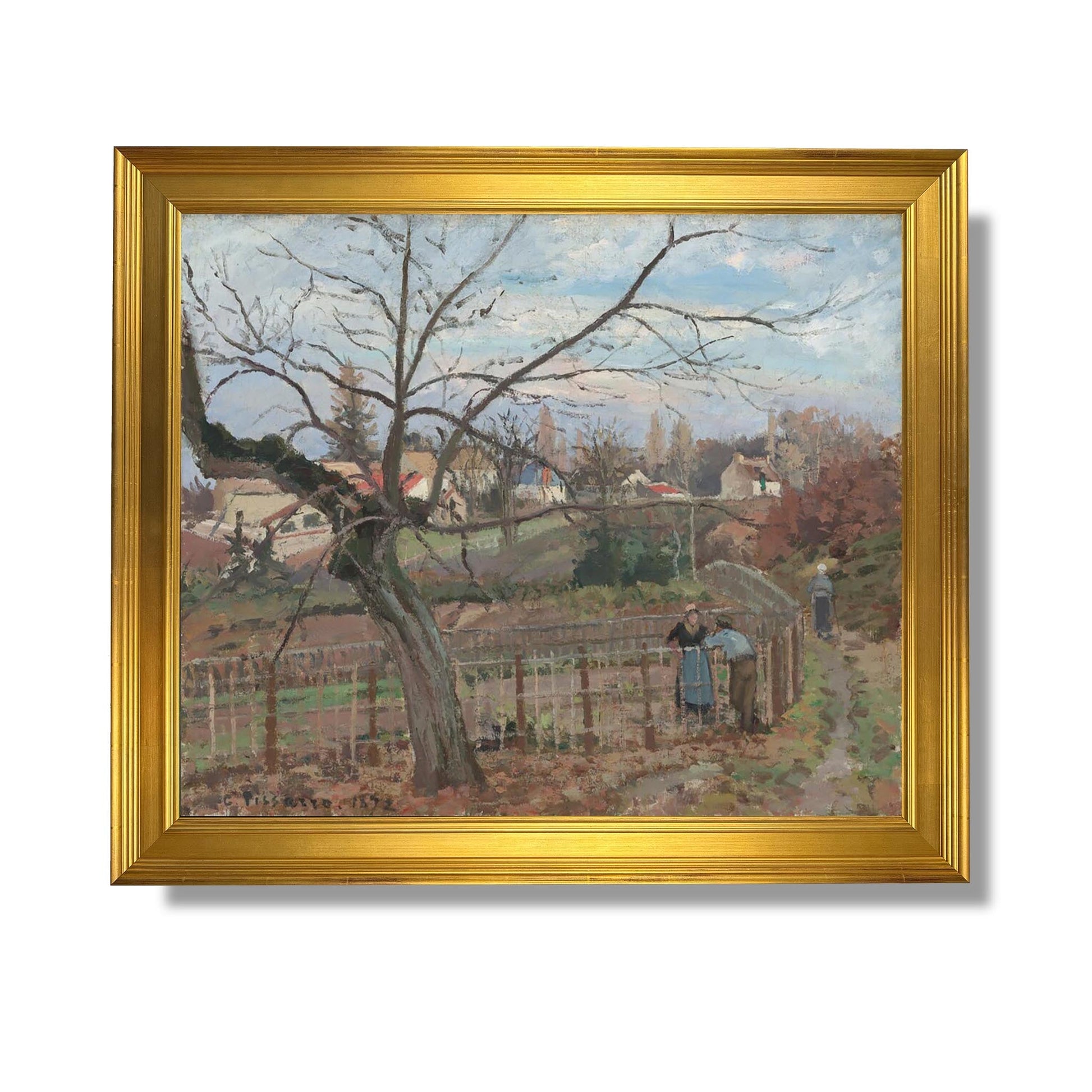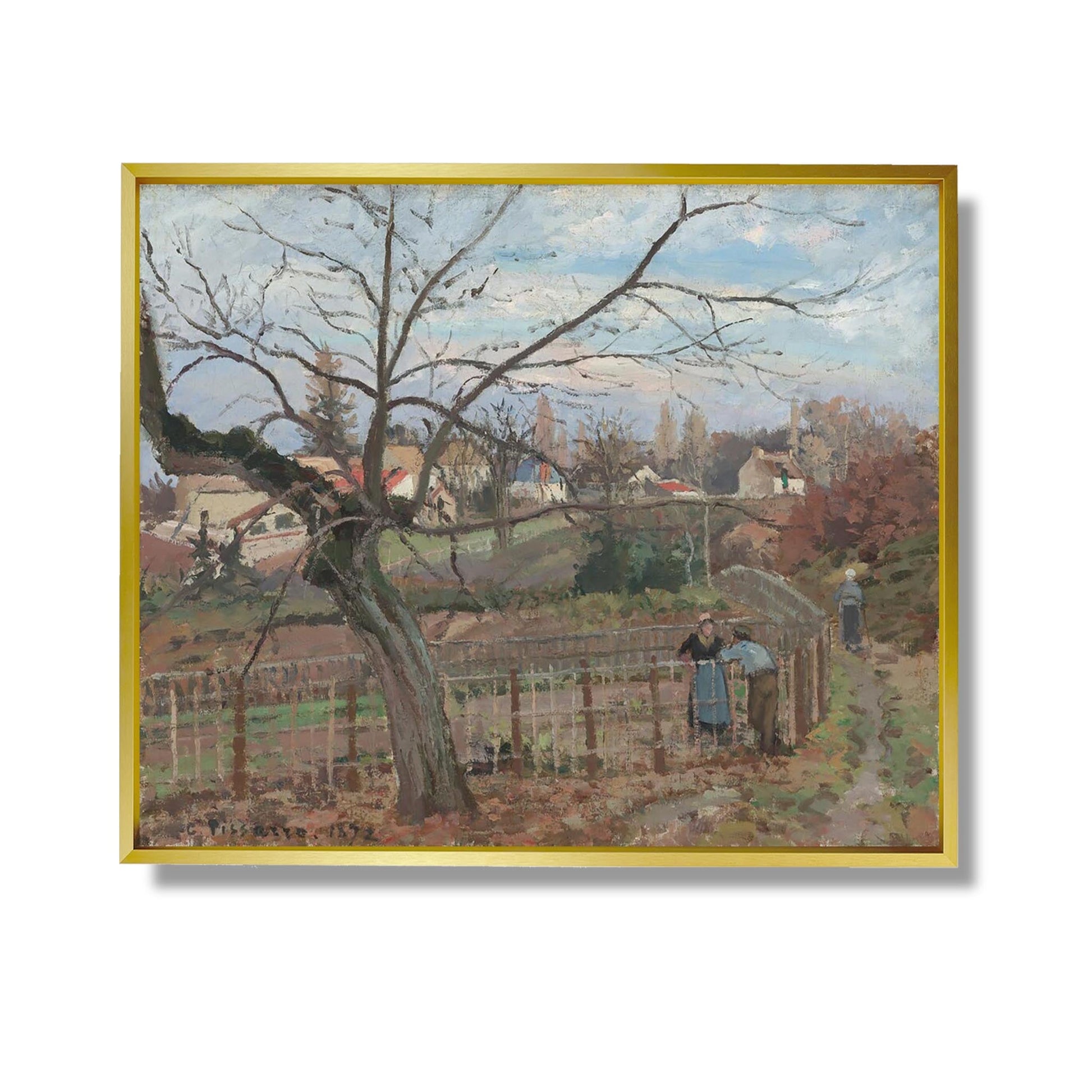 „Der Zaun“ von Camille Pissarro, gemalt im Jahr 1873, ist ein emblematisches Werk der impressionistischen Bewegung. Dieses Gemälde zeigt eine bukolische Szene, in der ein Holzzaun ein grünes Feld abgrenzt und die Ruhe des Landlebens heraufbeschwört. Pissarro verwendet kräftige Farbtupfer und Lichtspiele, um die friedliche Atmosphäre eines sonnigen Nachmittags einzufangen. Die ebenso einfache wie eindrucksvolle Komposition zeigt das Interesse des Künstlers an der Natur und dem alltäglichen Leben. Dieses Werk veranschaulicht perfekt Pissarros Fähigkeit, gewöhnliche Szenen in Momente zeitloser Schönheit zu verwandeln.