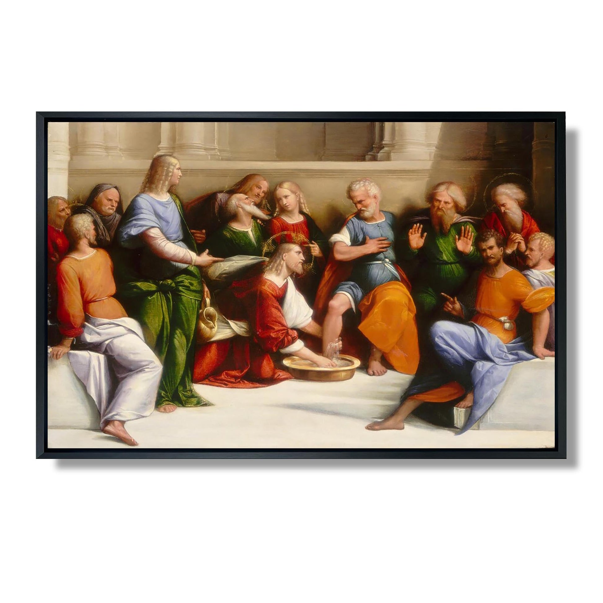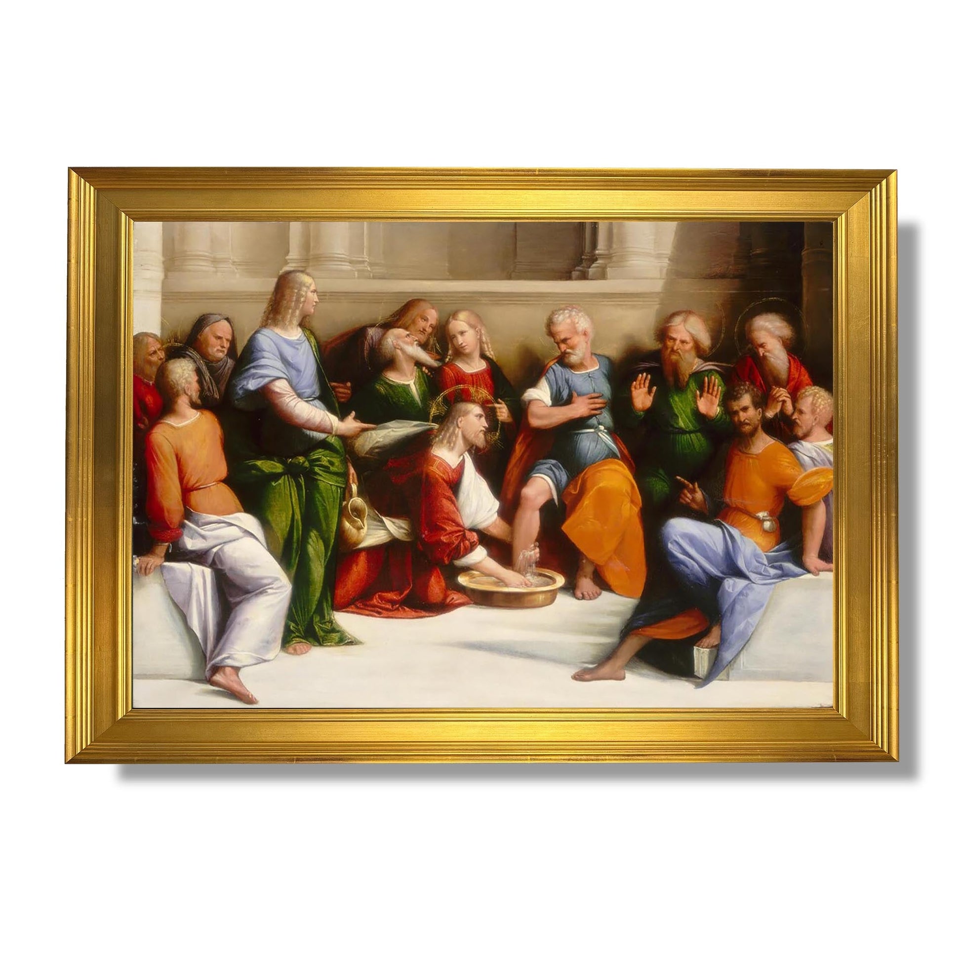 „Christus wäscht die Füße seiner Jünger“ ist ein ikonisches Werk des italienischen Künstlers Garofalo, das im 16. Jahrhundert entstand. Dieses Gemälde illustriert einen Schlüsselmoment des Neuen Testaments, als Jesus als Zeichen der Demut und Dienstbereitschaft seinen Jüngern vor dem letzten Abendmahl die Füße wäscht. Garofalo, beeinflusst von der Renaissance, verwendet leuchtende Farben und eine dynamische Komposition, um die Emotionen dieser heiligen Szene zu vermitteln. Der Ausdruck der Jünger, in dem sich Überraschung und Respekt mischen, verstärkt die Botschaft der Liebe und Demut. Dieses Werk lädt zum Nachdenken über Dienst und Menschenwürde ein.