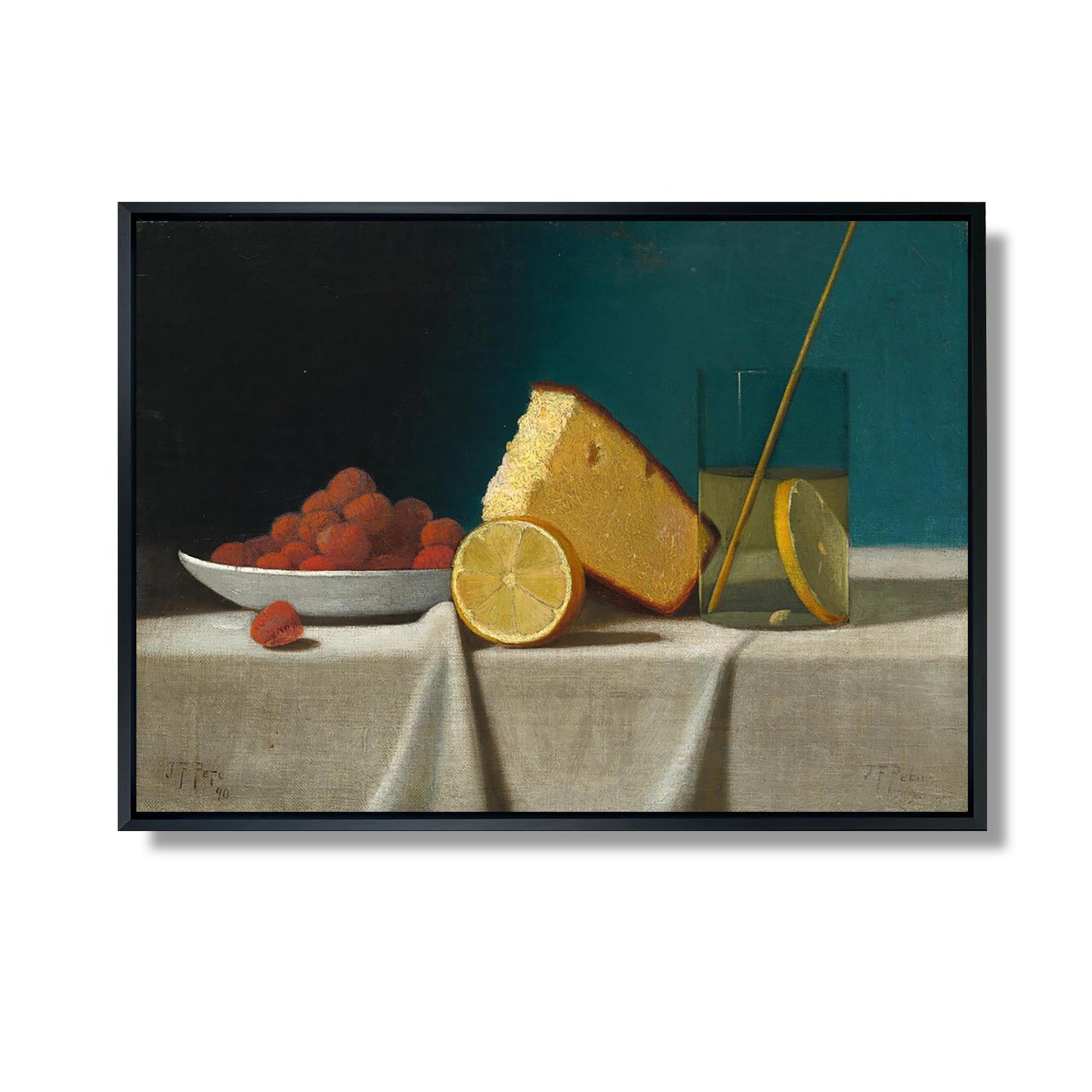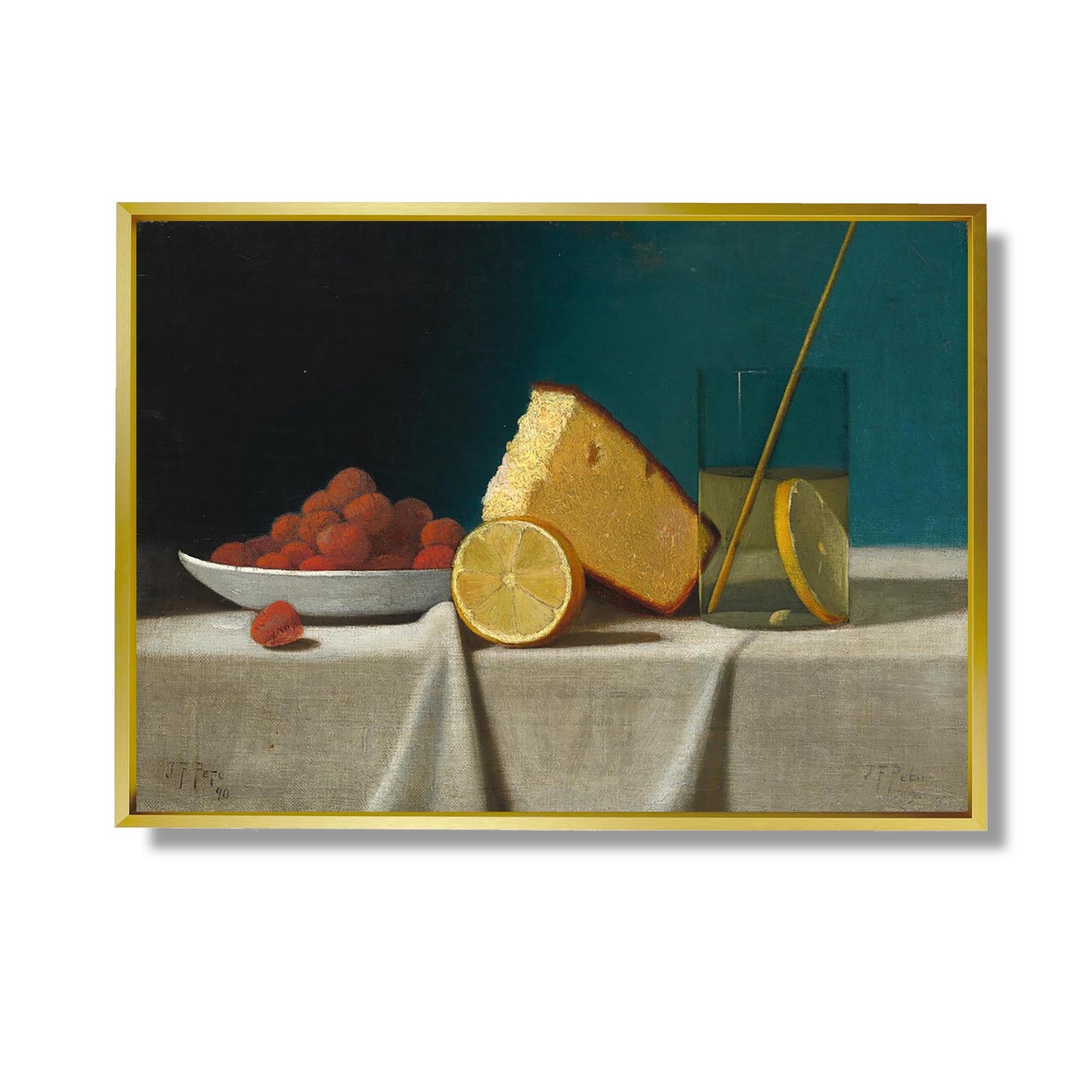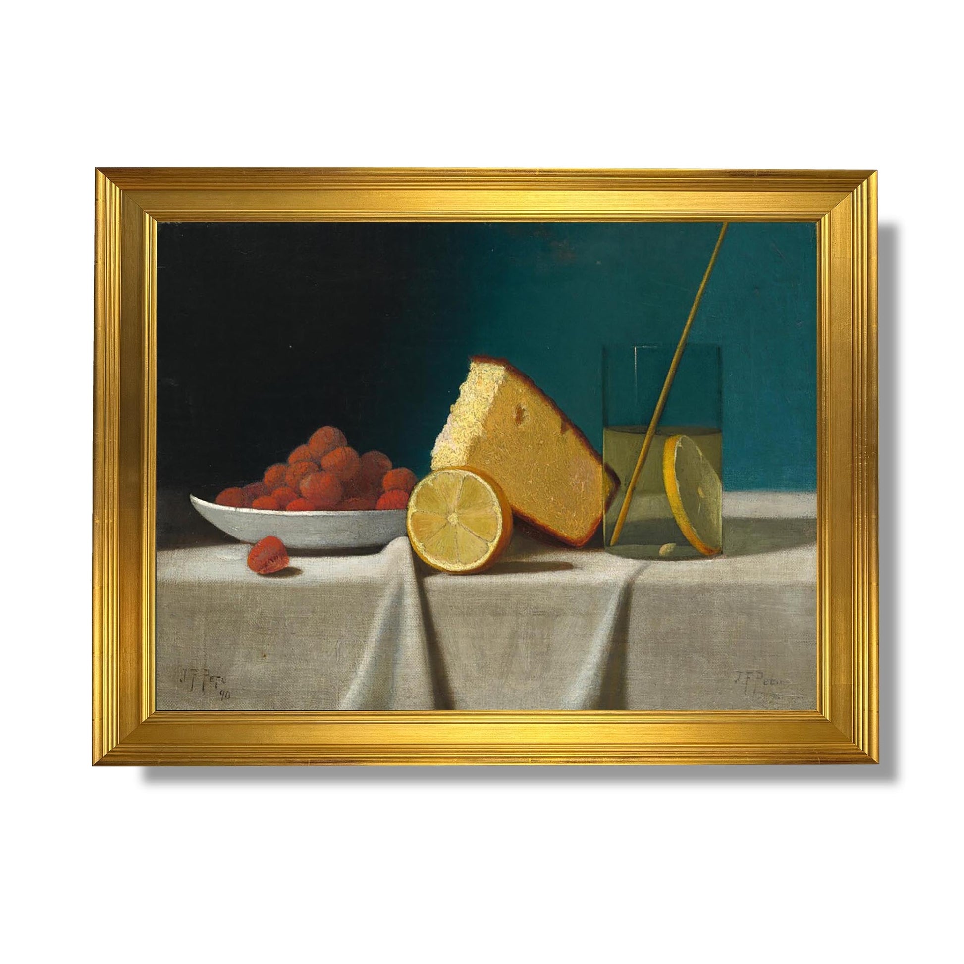 „Stillleben mit Kuchen, Zitrone, Erdbeeren und Glas“ von John Frederick Peto ist ein ikonisches Werk der Trompe-l’œil-Bewegung, das im späten 19. Jahrhundert entstand. Peto, bekannt für seine meisterhafte Detailliertheit, fängt eine filigrane Komposition ein, in der ein Kuchen, eine Zitrone, Erdbeeren und ein Glas sorgfältig arrangiert sind. Licht spielt auf Oberflächen und erzeugt Reflexionen und Schatten, die eine realistische Dimension verleihen. Dieses Gemälde erinnert sowohl an die vergängliche Schönheit der Natur als auch an den Reichtum einfacher Freuden und lädt den Betrachter gleichzeitig ein, über die Zerbrechlichkeit des Lebens nachzudenken.