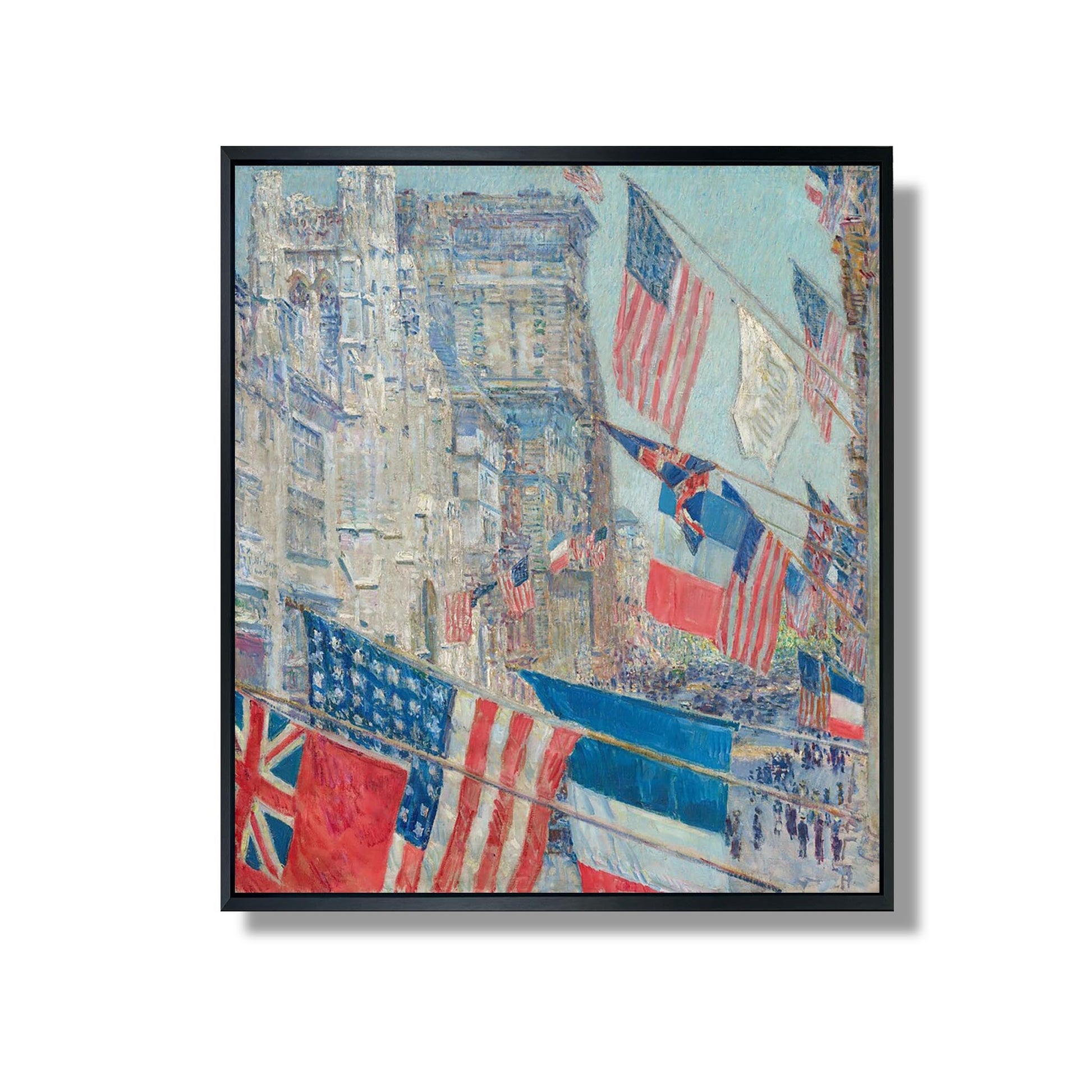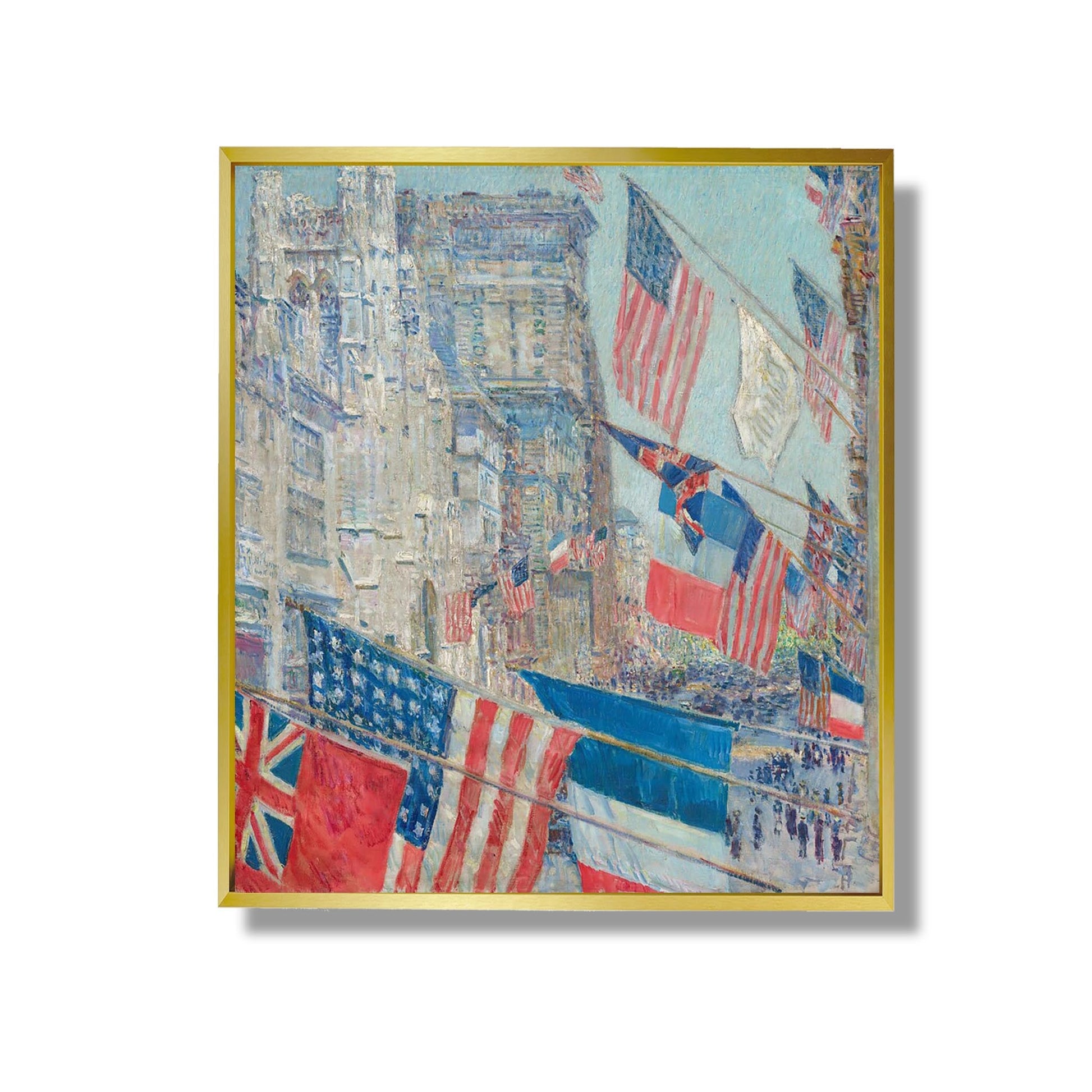 „The Avenue of the Allies and Victory“ ist ein ikonisches Werk von Childe Hassam aus dem Jahr 1918. Das Gemälde ist Teil seiner Serie „Amerikanische Flagge“ und fängt den patriotischen Geist der Zeit mitten im Ersten Weltkrieg ein. Hassam, bekannt für seinen impressionistischen Stil, verwendet kräftige Pinselstriche, um wehende Flaggen entlang einer New Yorker Avenue darzustellen. Die dynamische Komposition und die leuchtenden Farben vermitteln ein Gefühl von Nationalstolz und Einheit. Dieses Werk veranschaulicht nicht nur das Talent des Künstlers, sondern auch die Auswirkungen des Krieges auf die amerikanische Gesellschaft.