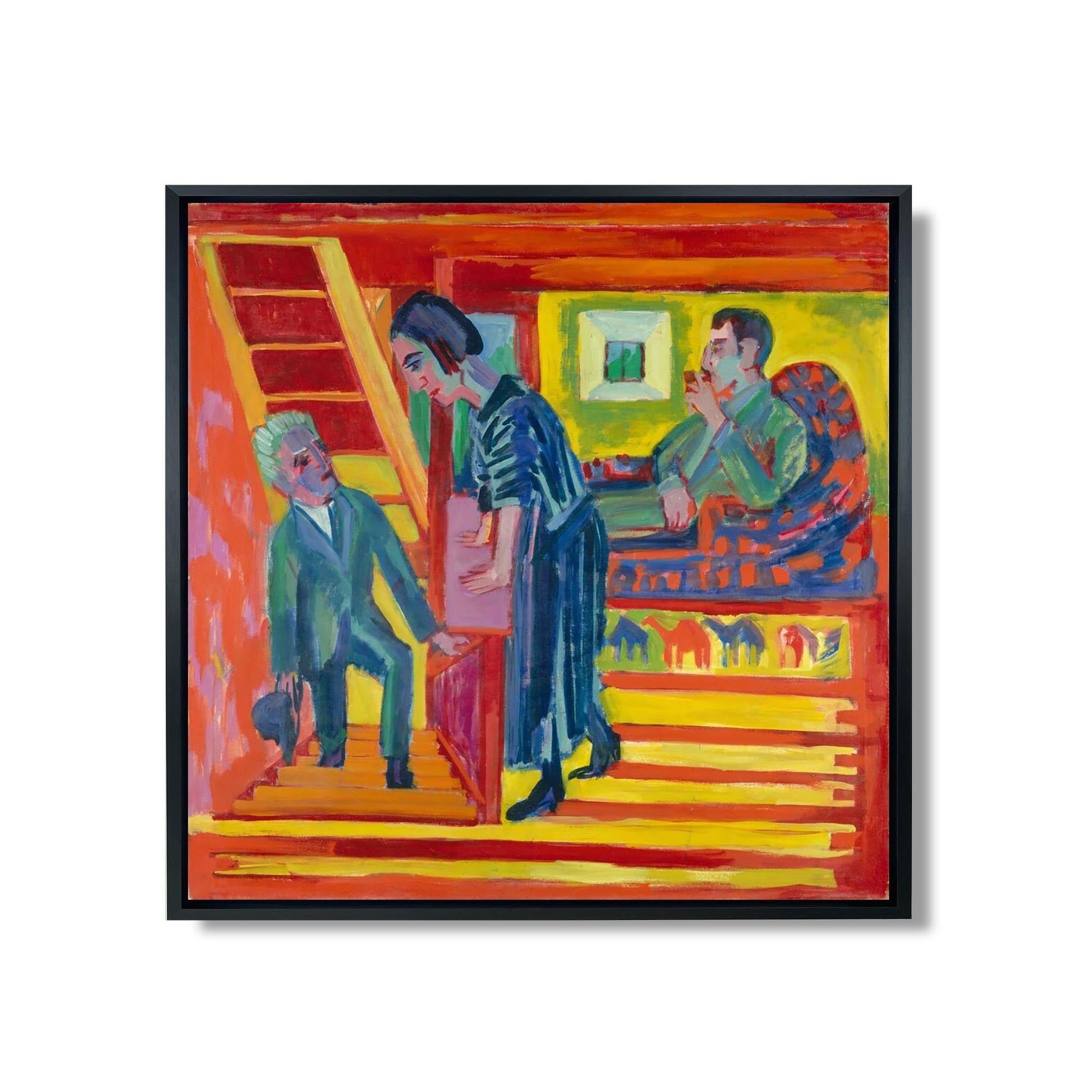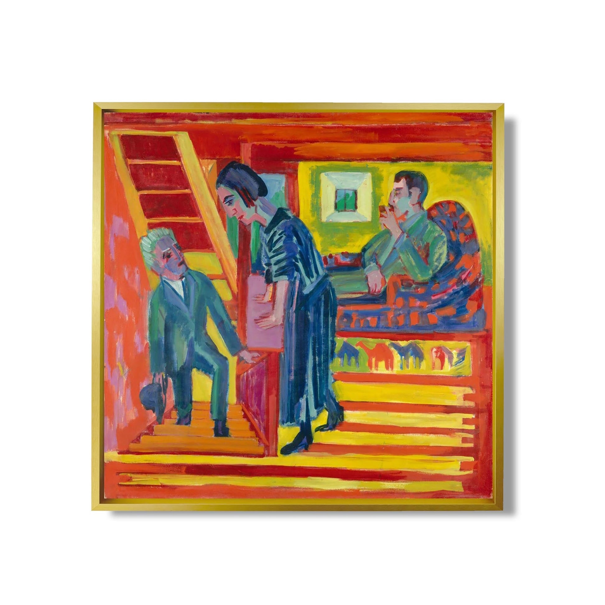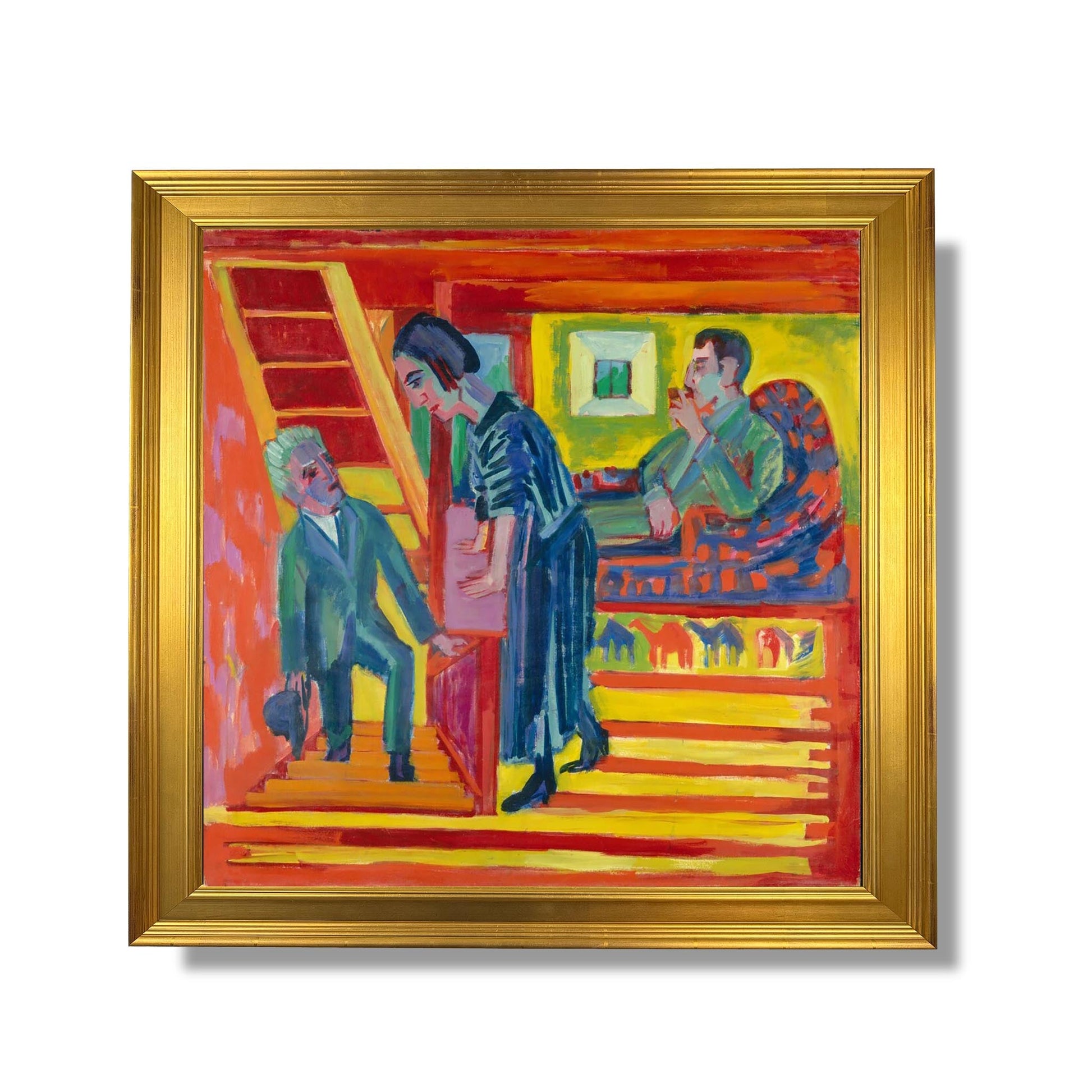 Ernst Ludwig Kirchners „Der Besuch – Paar und Neuankömmling“ aus dem Jahr 1913 veranschaulicht die sozialen und psychologischen Spannungen der Zeit. Dieses expressionistische Werk stellt ein Paar und einen Neuankömmling in einer intimen Umgebung dar, wobei die Figuren stilisiert sind und die hellen Farben die Emotionen betonen. Kirchner bringt durch seinen kühnen Einsatz von Farben und Formen die Angst und Entfremdung zum Ausdruck, die in der modernen Gesellschaft spürbar sind. Die oft verzerrten Gesichter spiegeln einen inneren Kampf wider, während die Umgebung eine Atmosphäre der Desorientierung hervorruft. Dieses Gemälde verkörpert die Suche nach Identität und komplexen menschlichen Beziehungen.
