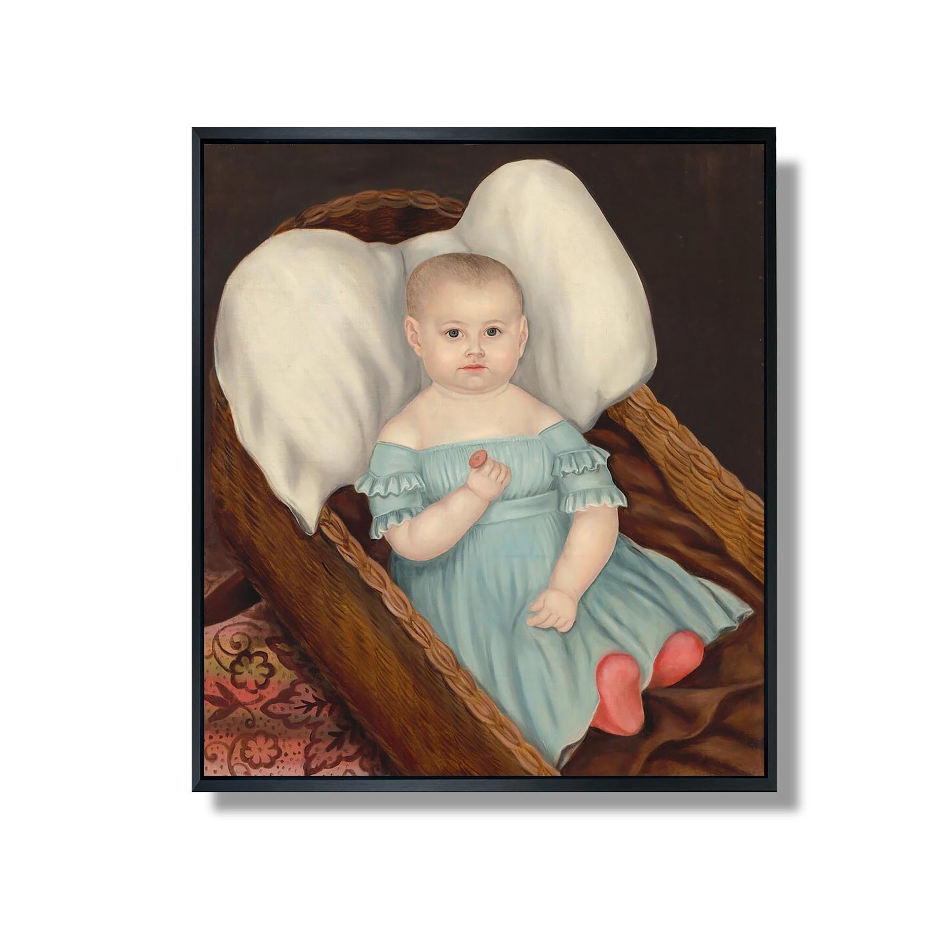 "Baby in Wicker Basket" is an iconic work by Joseph Whiting Stock, a 19th-century American artist. Painted in 1847, the painting depicts an infant peacefully ensconced in a wicker basket, surrounded by delicate linens. The work is notable for its realism and ability to capture the innocence of childhood. Stock, known for his portraits and scenes of everyday life, uses soft colors and subtle light to create a warm atmosphere. The painting evokes tenderness and vulnerability, while also reflecting the importance of family in the society of the time.