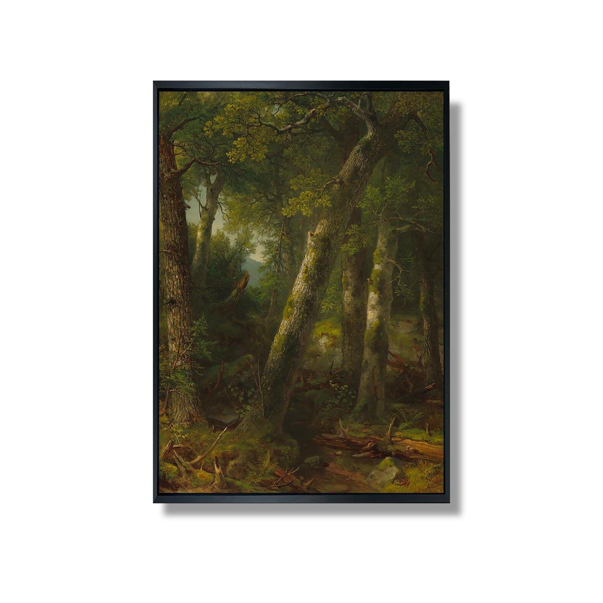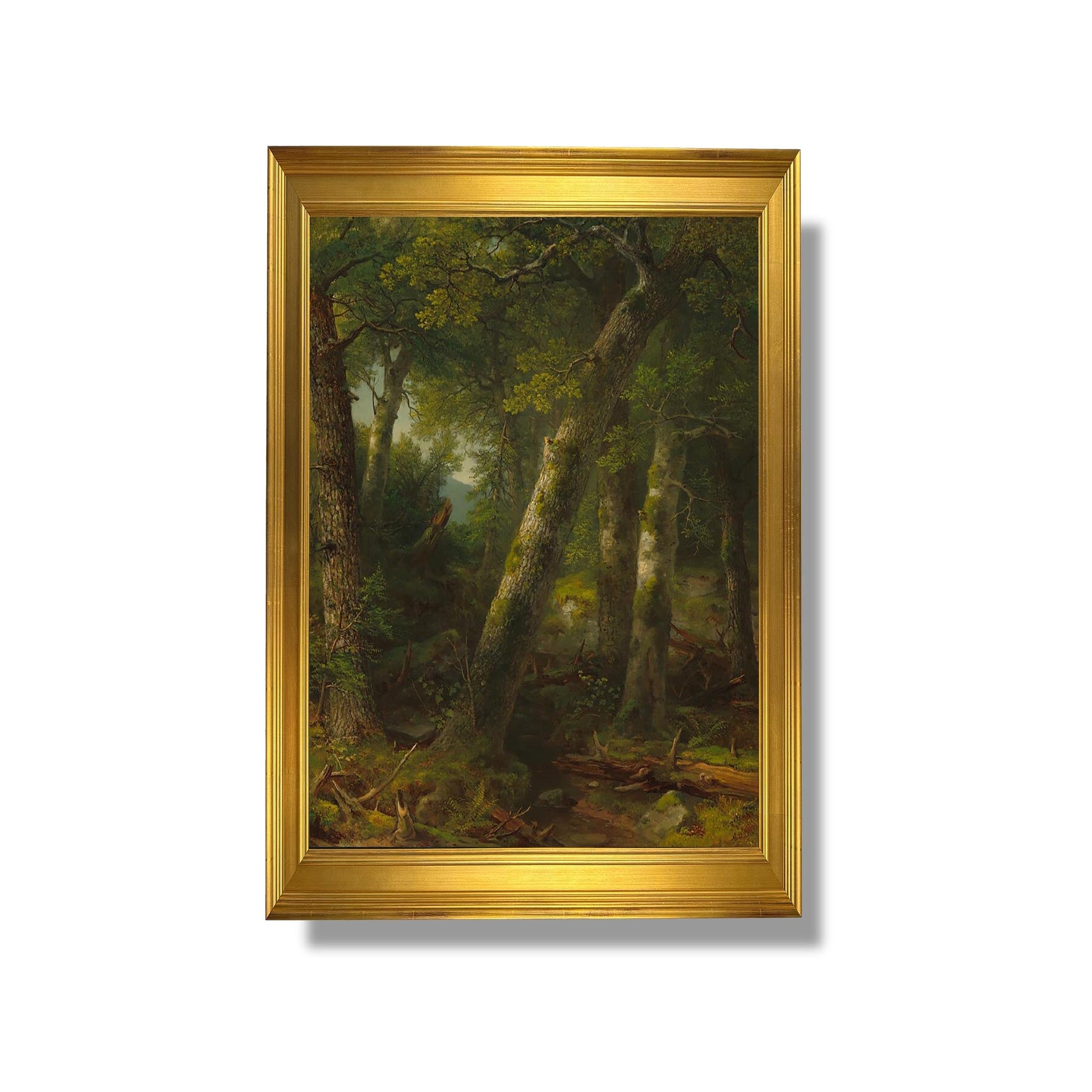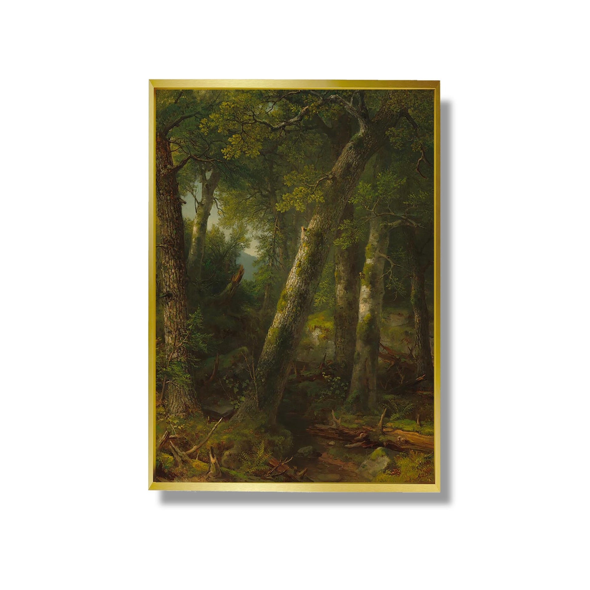 "Forest in the Morning Light" is an iconic work by Asher Brown Durand, a master of the 19th-century American landscape. Painted in 1855, this canvas captures the serene beauty of a forest bathed in the soft light of morning. Durand, a member of the Hudson River School, uses meticulous detail and a rich palette to evoke the majesty of nature. The play of light and shadow creates a peaceful atmosphere, inviting the viewer to contemplate the splendor of the natural world. This work illustrates the harmony between man and nature, reflecting the Romantic ideals of the time.