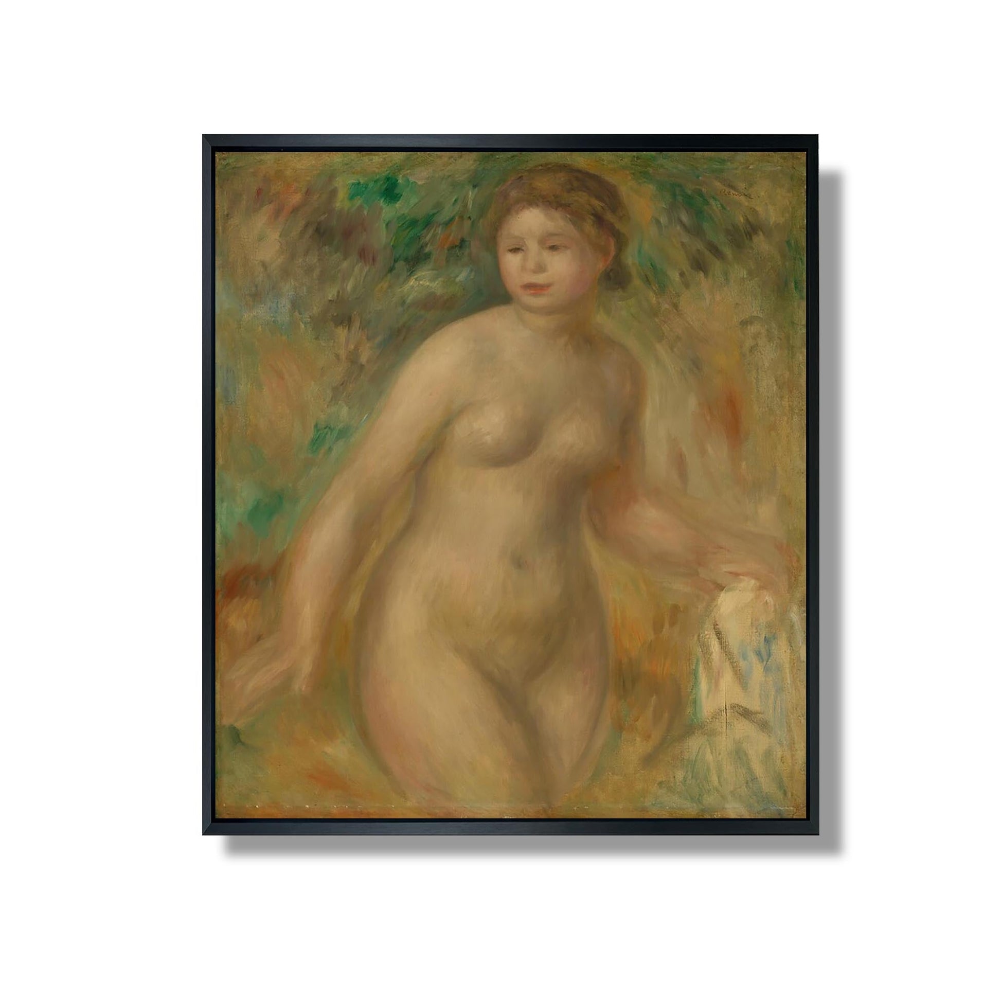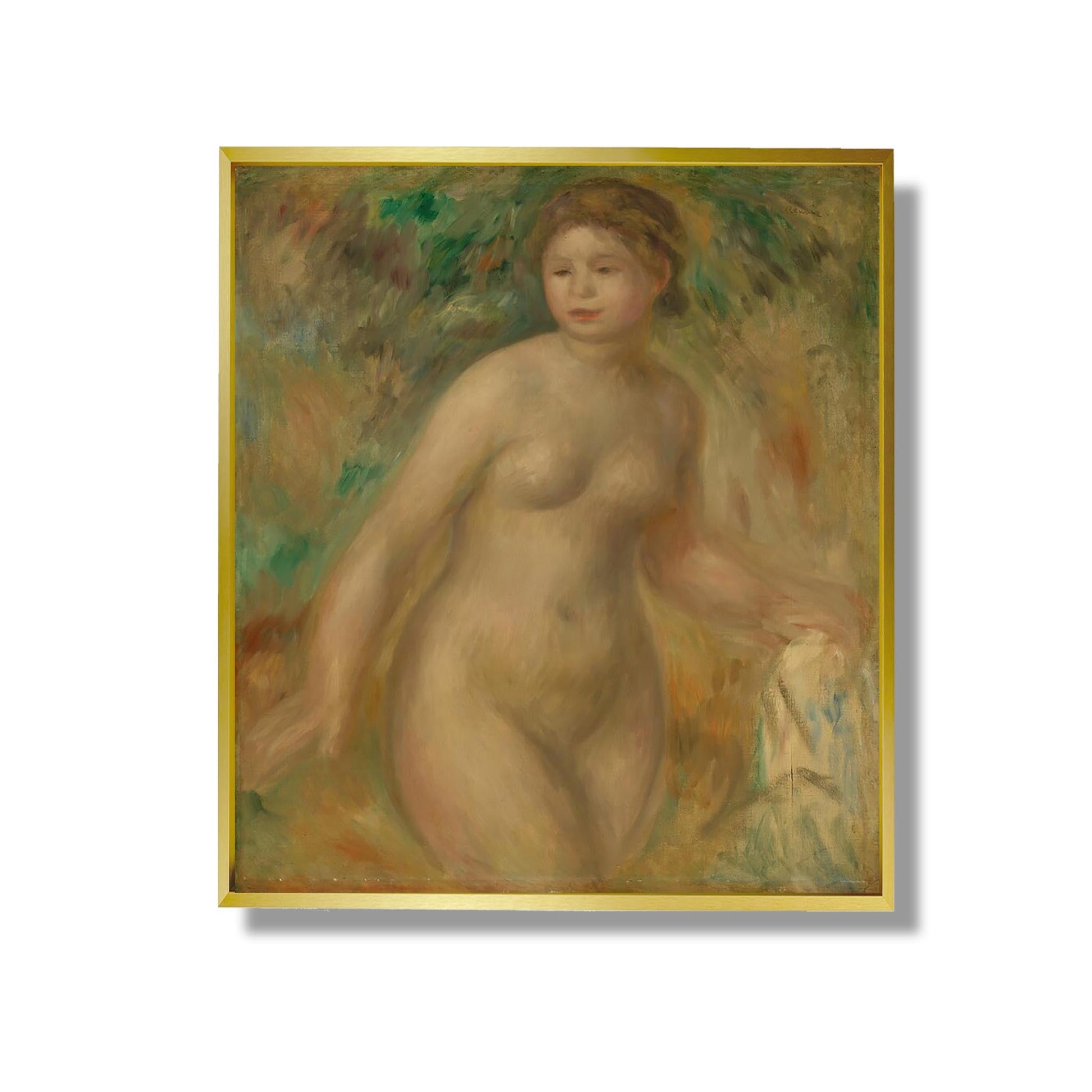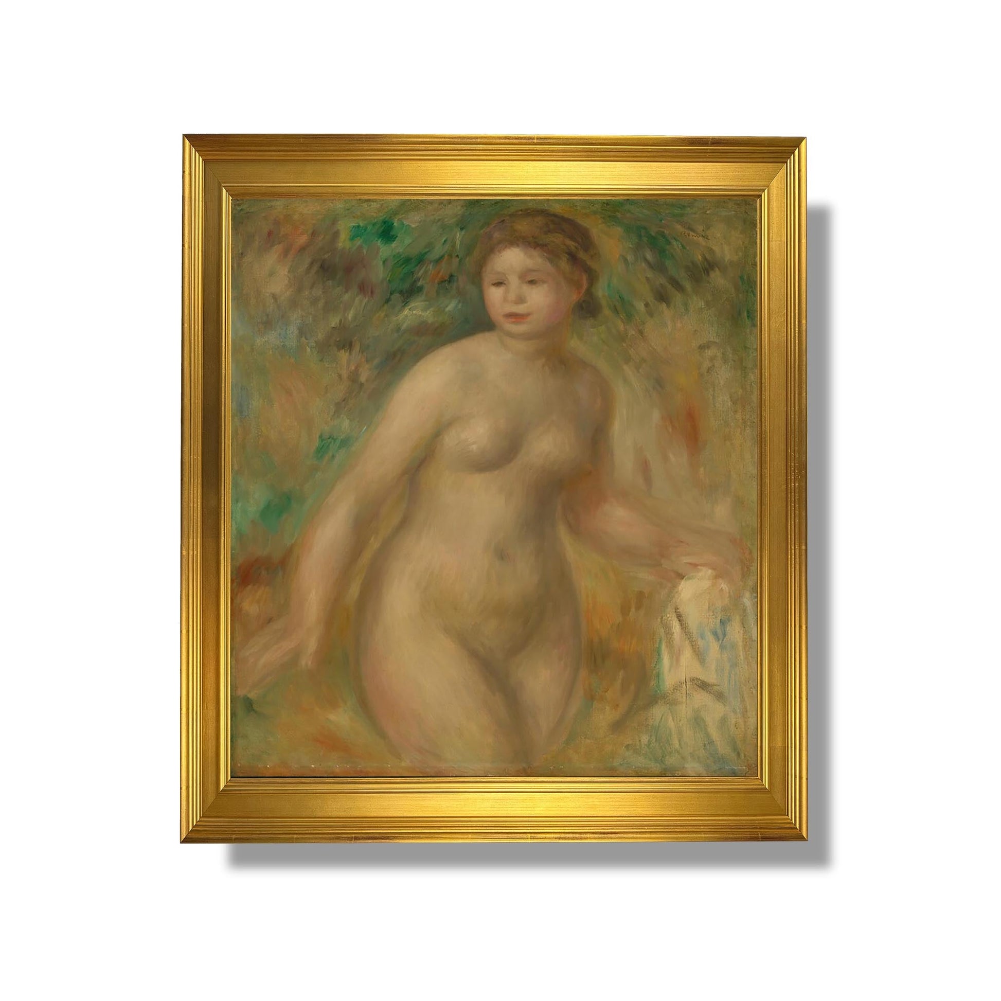 "Nude" is an iconic work by Auguste Renoir, painted in 1876, which perfectly illustrates his impressionist style. This painting depicts a nude woman, lying on a sheet, bathed in a soft and warm light. Renoir captures the beauty of the female body with remarkable delicacy, highlighting the curves and nuances of the skin. The composition, both intimate and sensual, testifies to the artist's admiration for natural beauty. Through "Nude", Renoir explores the themes of sensuality and light, while affirming his talent for rendering life and emotion on canvas.