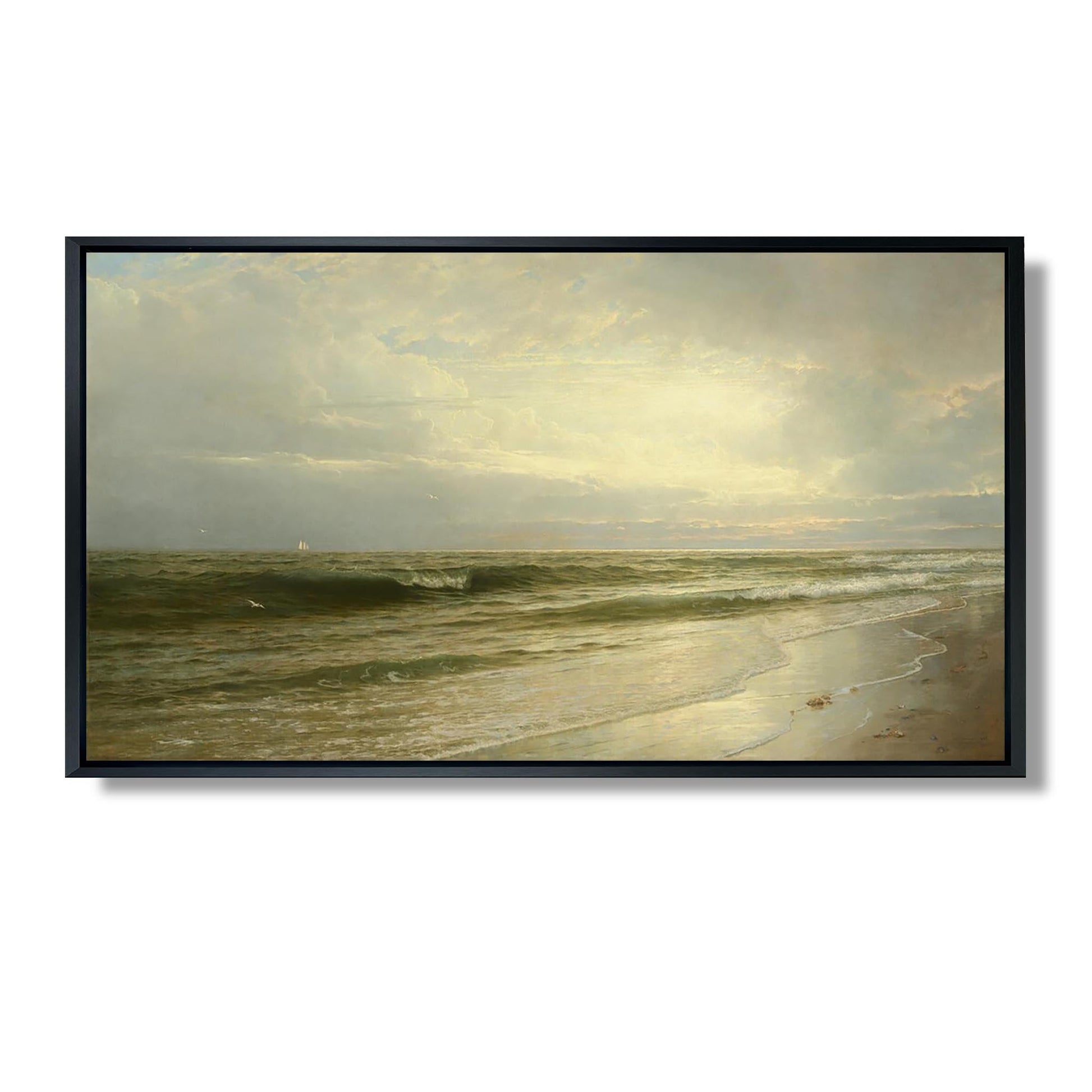 William Trost Richards' "On the Coast of New Jersey" is an iconic piece of 19th-century American landscape art. Painted in 1869, this painting captures the rugged, serene beauty of the Jersey Shore, emphasizing the meeting of land and sea. Richards, known for his attention to detail and subtle use of light, creates an atmosphere of tranquility. The crashing waves and cloudy sky evoke both the power of nature and the fragility of human existence. This work is a testament to the harmony between man and his environment, while celebrating the natural splendor of the United States.