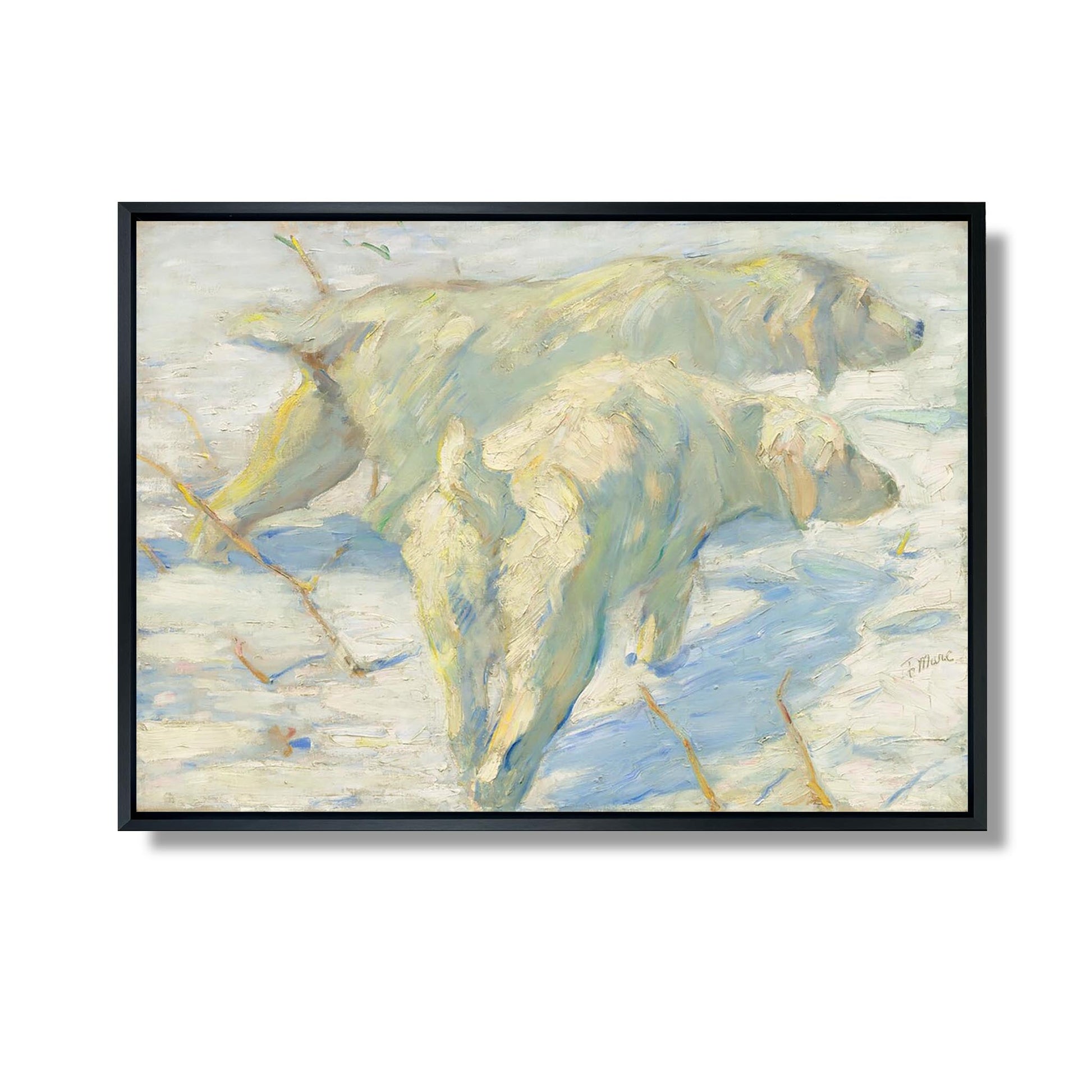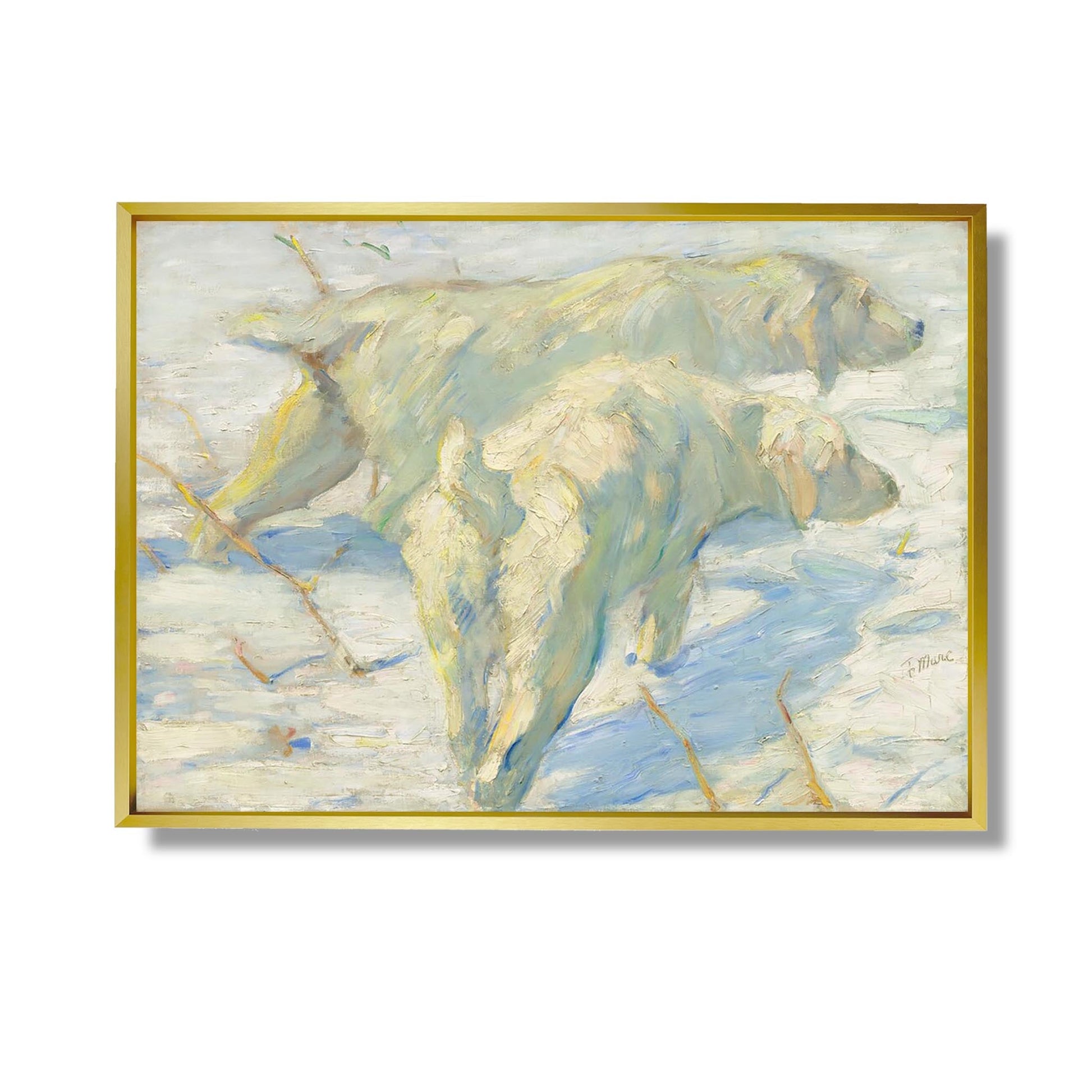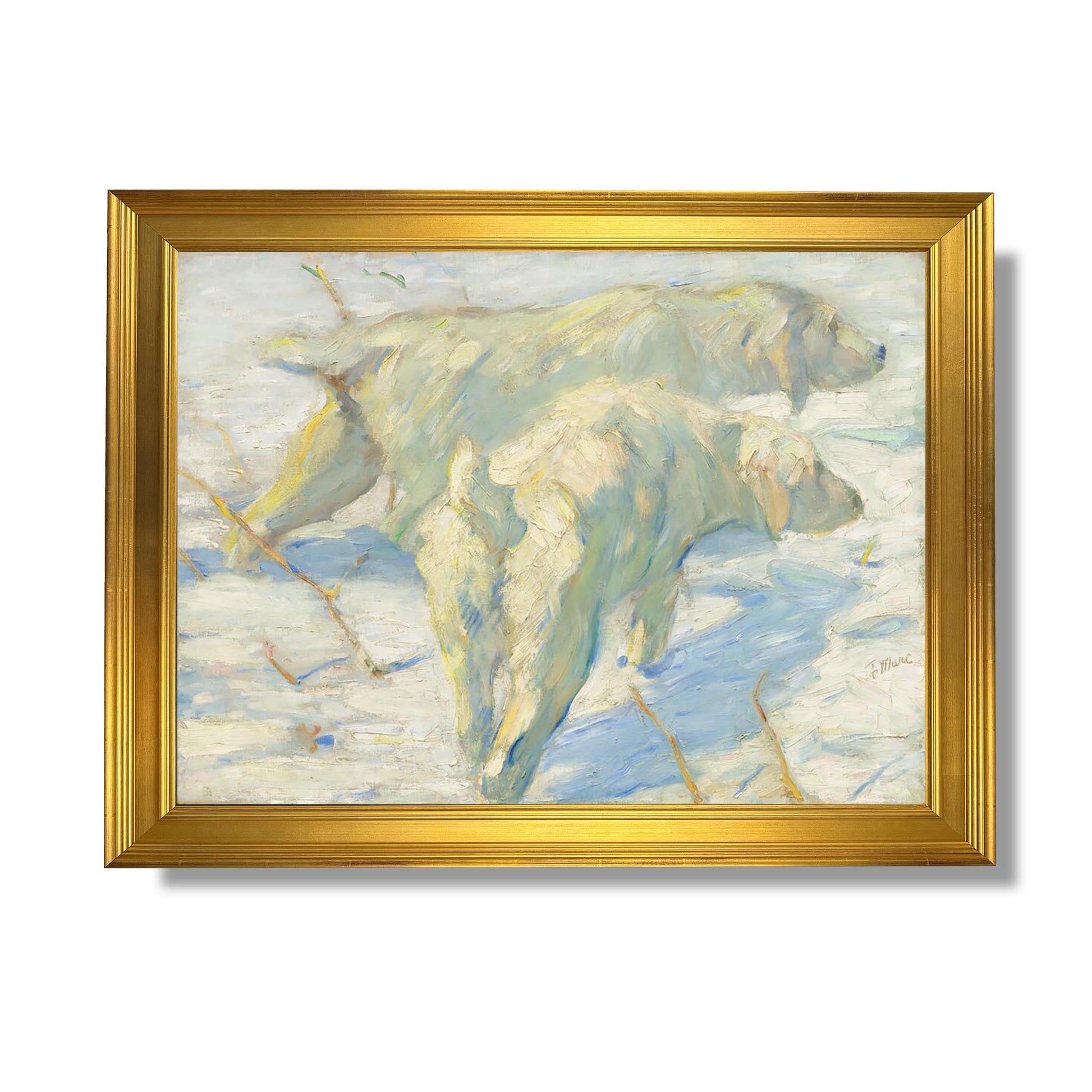 "Siberian Dogs in the Snow" is an iconic work by Franz Marc, a German painter from the early 20th century, known for his role in the Expressionist movement. Painted in 1912, this painting depicts sled dogs moving through a snowy landscape, symbolizing the strength and beauty of nature. Marc uses bright colors and stylized forms to express the harmony between the animal and its environment. The work reflects his interest in the spirituality of nature and his desire to transcend reality, while also foreshadowing the artistic upheavals to come.