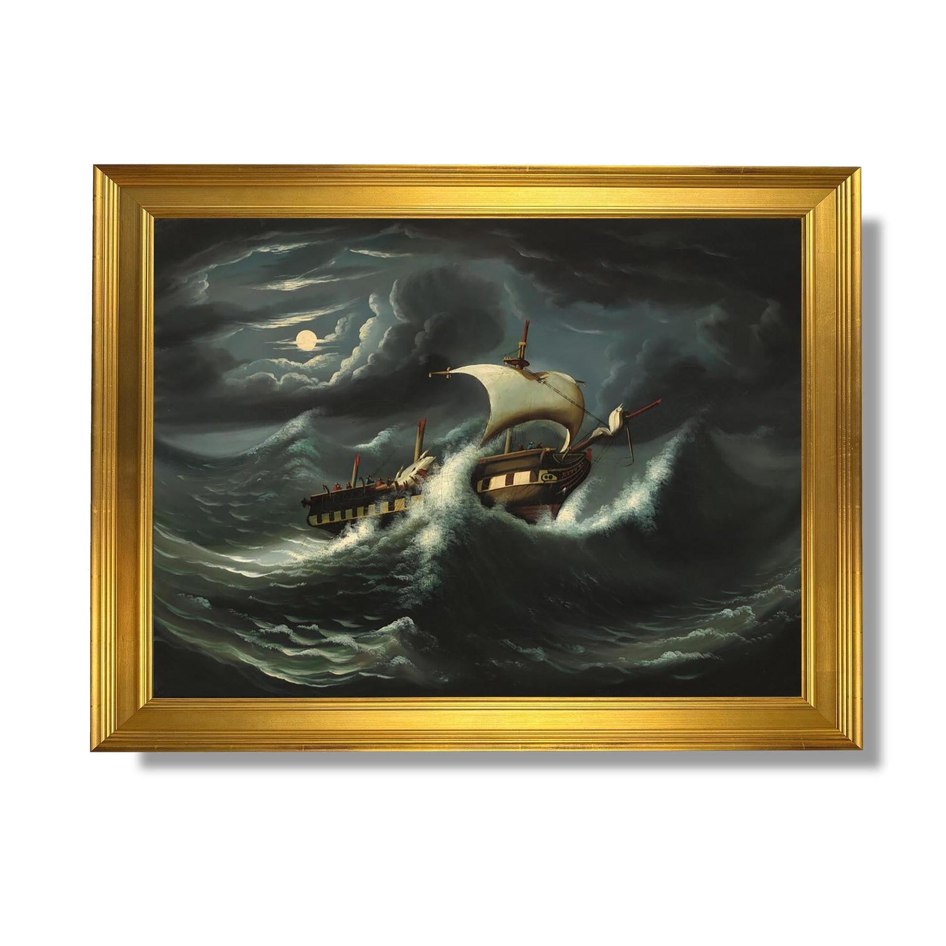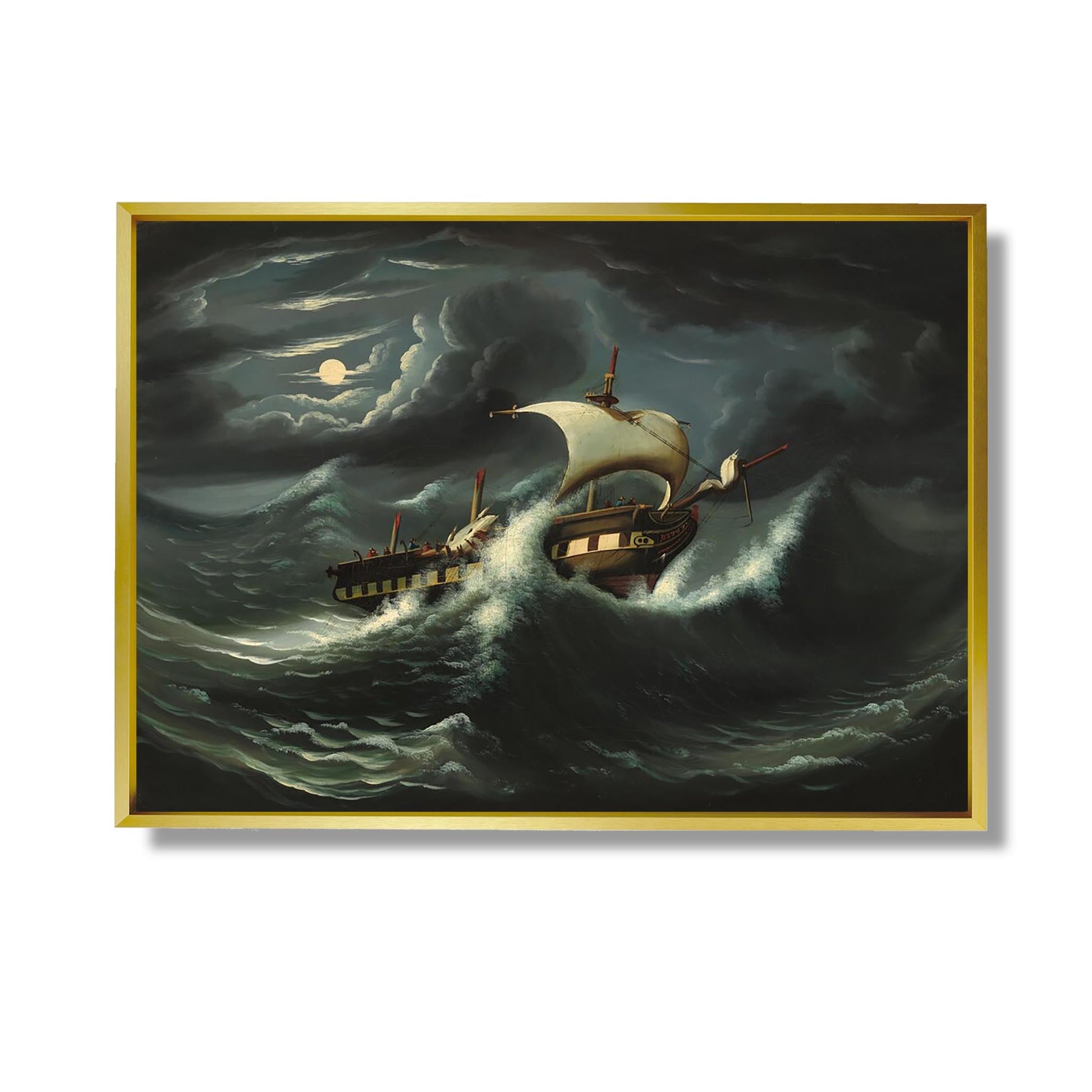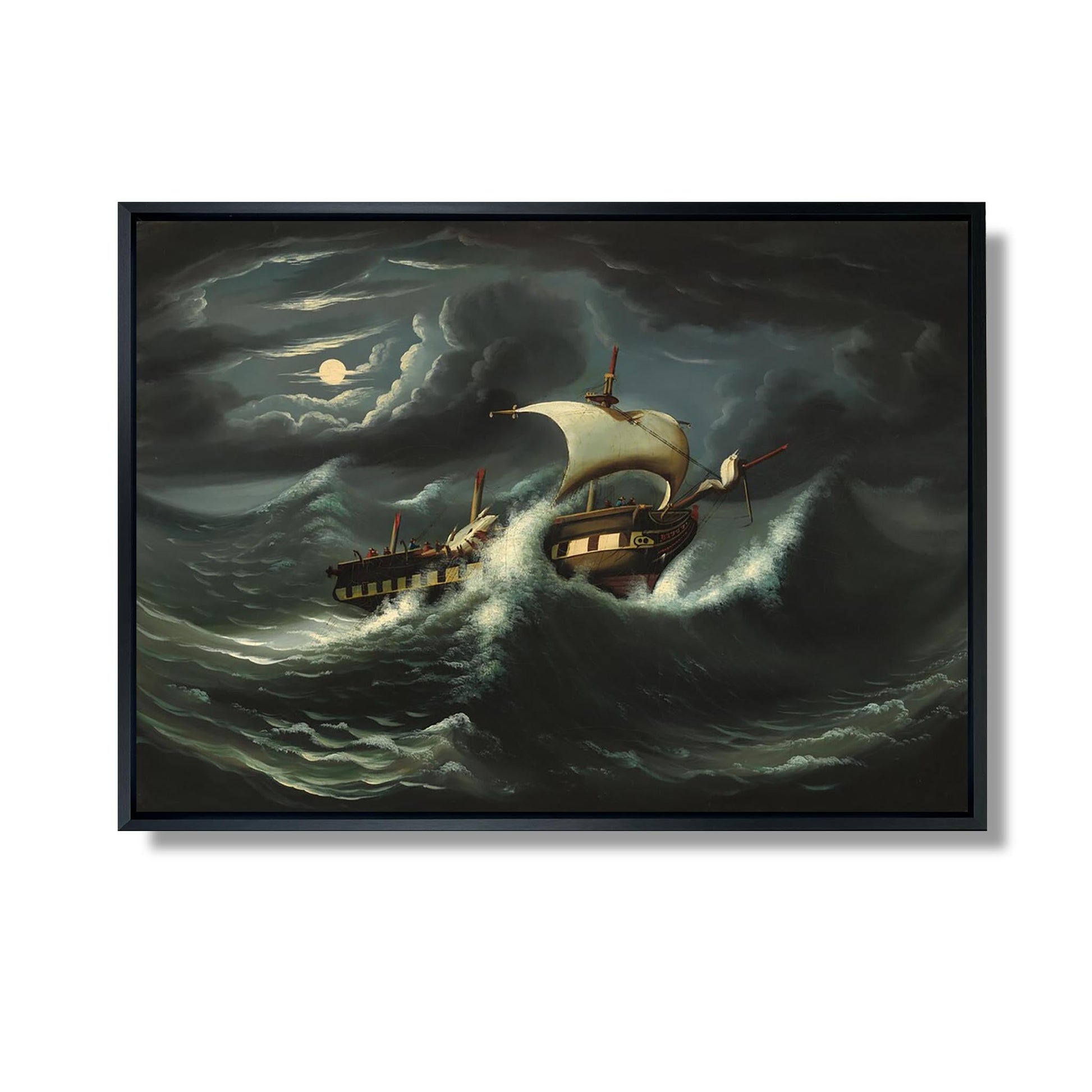 "Storm-Tossed Frigate" is an iconic work by Thomas Chambers, a 19th-century American painter known for his seascapes. In this painting, Chambers captures the power and beauty of stormy seas, depicting a ship in the grip of a storm. The tumultuous waves and stormy sky create a dramatic atmosphere, as the frigate, with its white sails, struggles against the elements. The work illustrates not only Chambers' technical mastery, but also his interest in wilderness and human resilience in the face of adversity. It is a celebration of the maritime spirit.