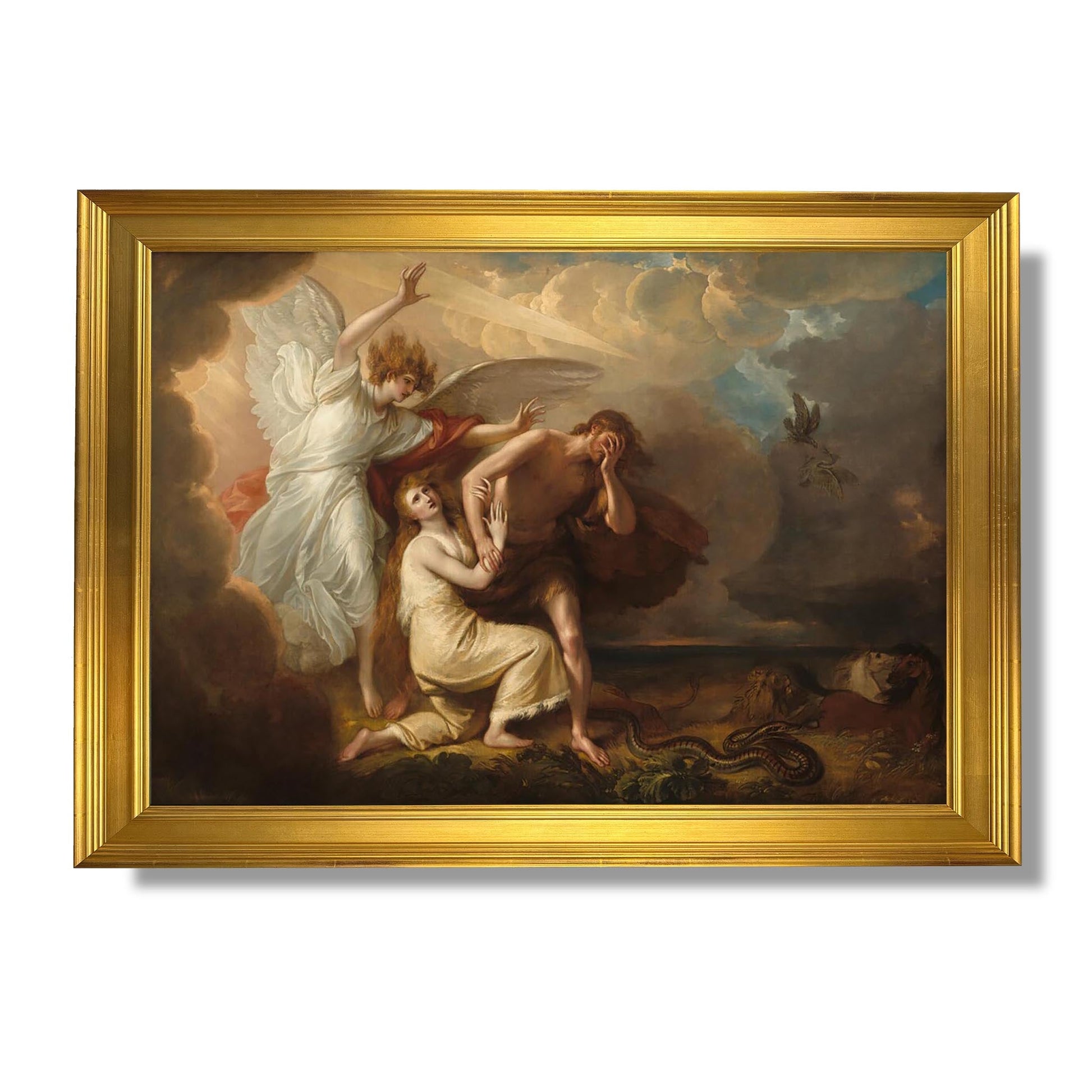 Benjamin West's "The Expulsion of Adam and Eve from Paradise" is a landmark Neoclassical painting, created in 1791. The painting depicts the tragic moment when Adam and Eve are expelled from the Garden of Eden, symbolizing the loss of innocence. West uses dynamic composition and vivid colors to heighten the emotion of the scene. The expressive, muscular figures embody the struggle between desire and desolation. The work invites us to reflect on the human condition, guilt, and redemption, while demonstrating West's talent for fusing story and emotion in a grandiose style.