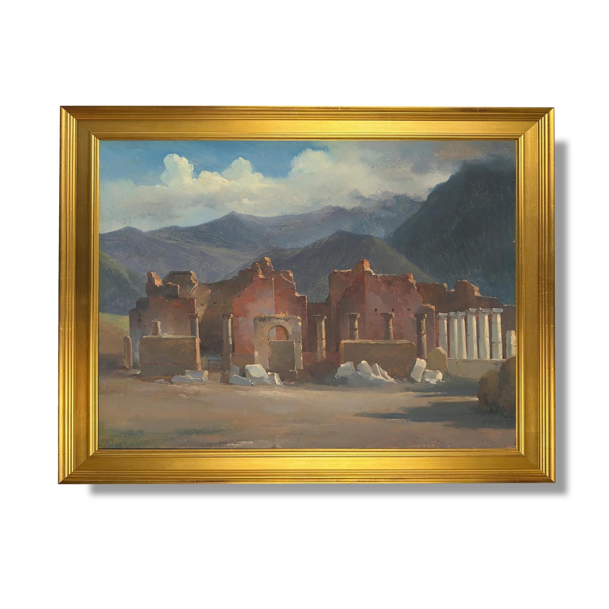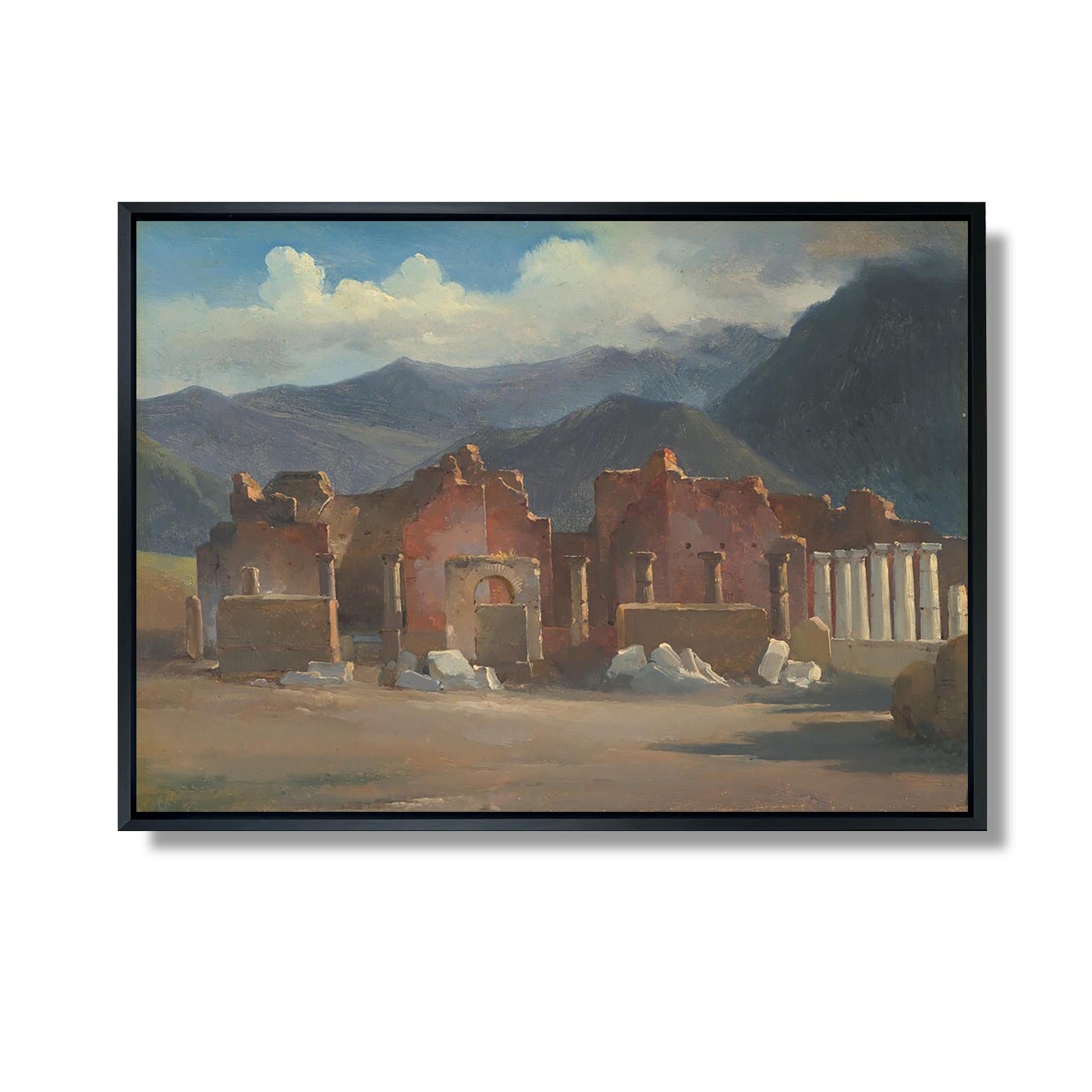 "The Forum at Pompeii" by Achille-Etna Michallon is an emblematic work of the 19th century French Romantic landscape. Painted in 1820, it captures the majesty of the ruins of Pompeii, testifying to the fascination with Antiquity. Michallon, through a harmonious composition, highlights the architectural remains, while integrating human figures that animate the site. The soft light and warm colors create a melancholic atmosphere, evoking the past grandeur of this buried city. The work invites reflection on time and memory, while celebrating the beauty of the ruins.