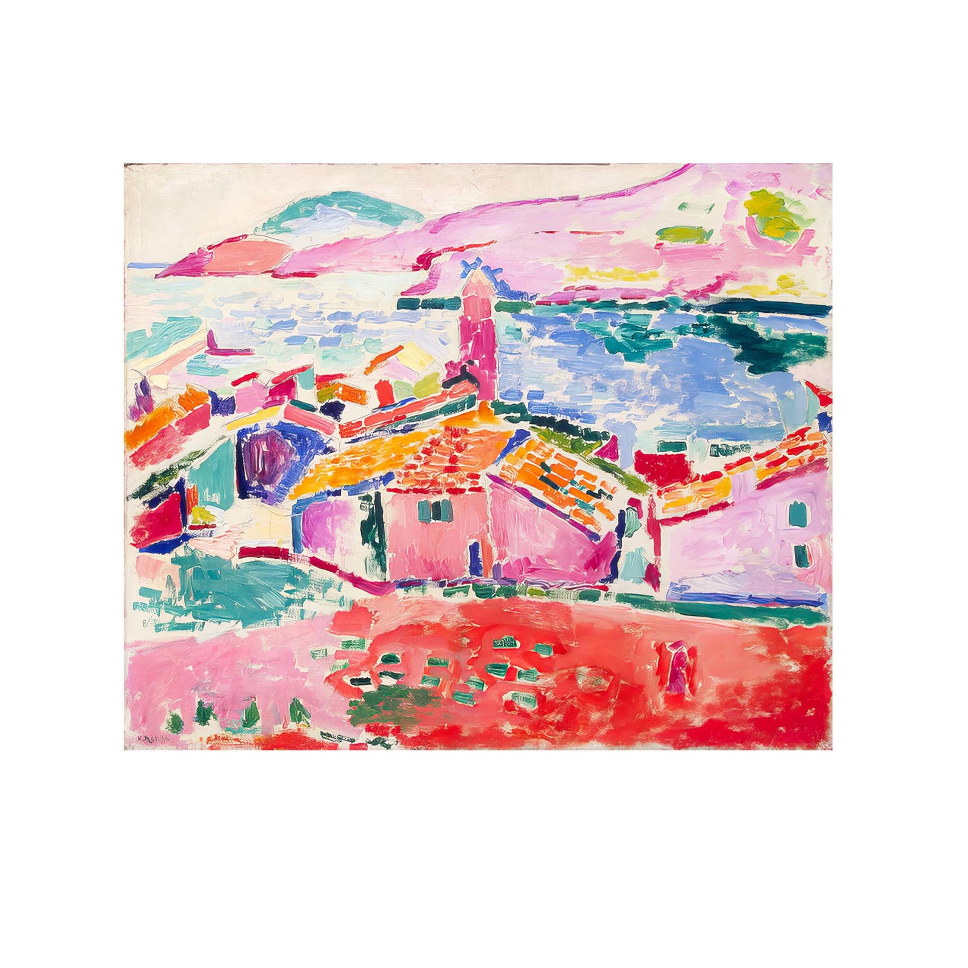 "View of Collioure" is an iconic work by Henri Matisse, painted in 1905, that exemplifies the Fauvist style. This canvas captures the beauty of the village of Collioure, with its colorful houses and bustling harbor. Matisse uses bright, bold colors, juxtaposing tones of blue, red, and yellow to create a vibrant atmosphere. The dynamic composition, with simplified shapes and sharp contours, reflects emotion and Mediterranean light. This work embodies Matisse's quest to express sensation rather than reality, marking a turning point in modern art.