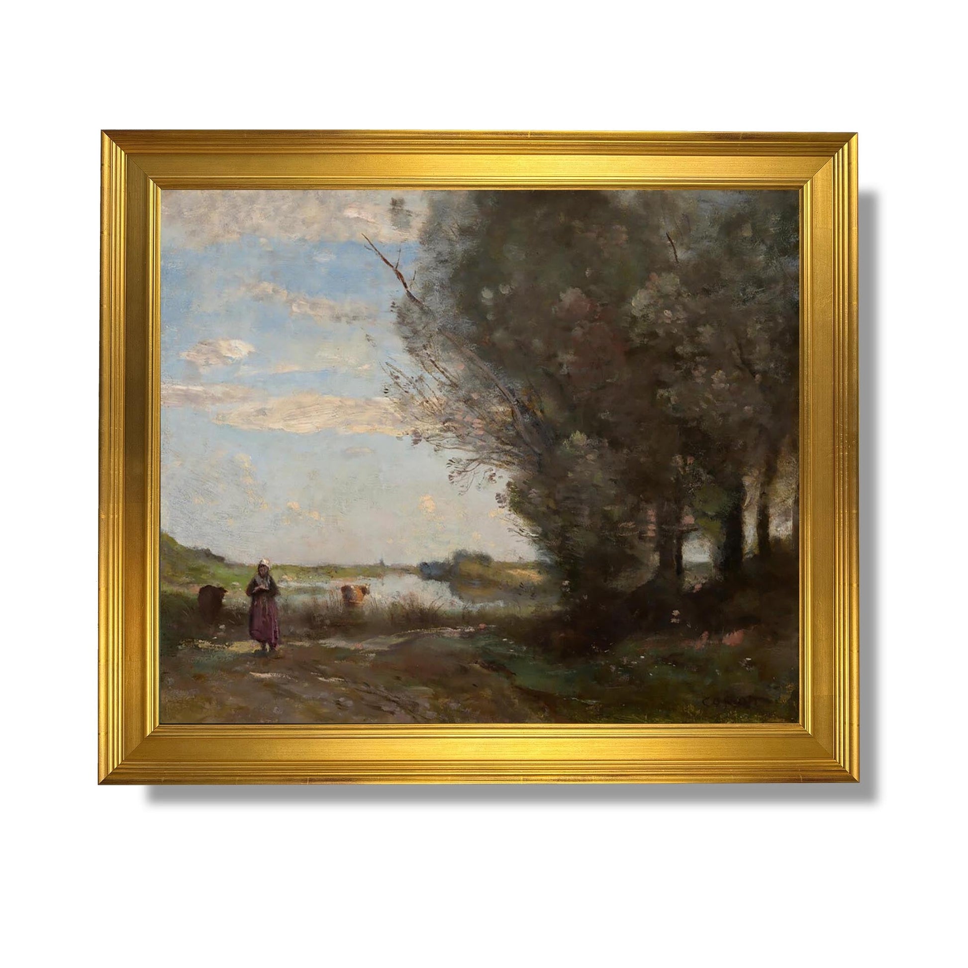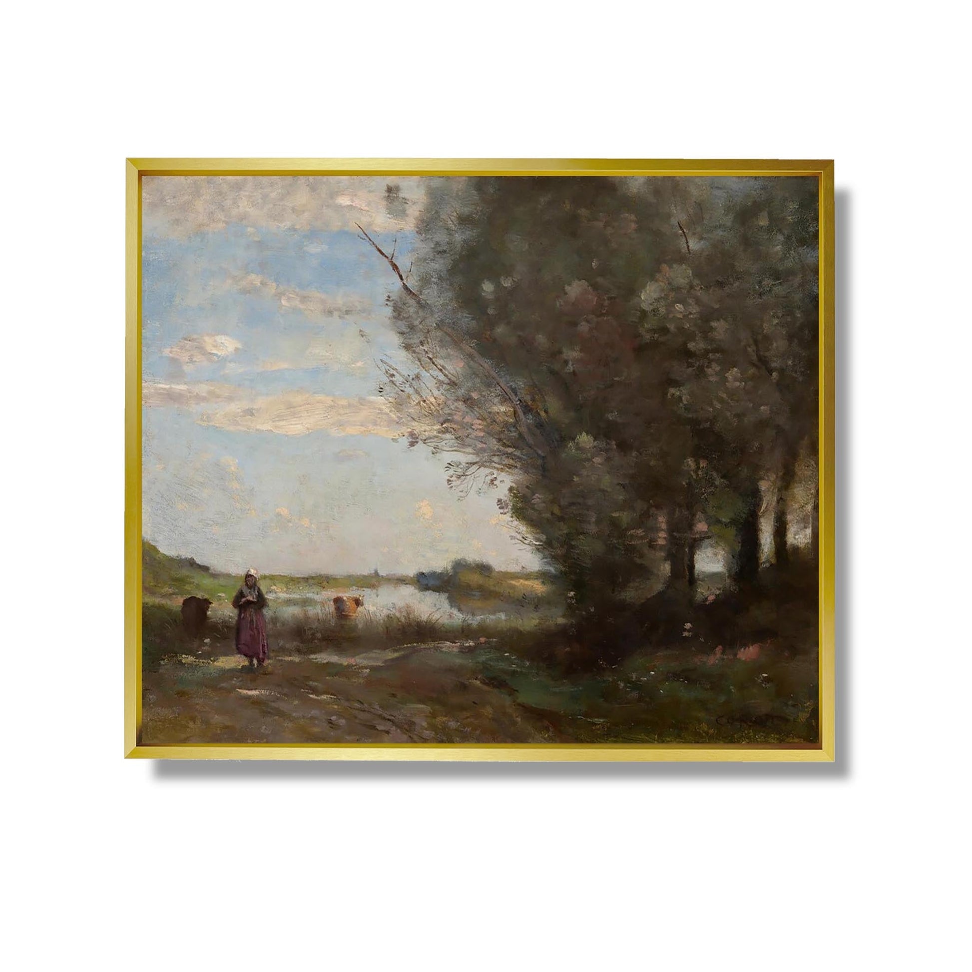"View of the River" is an iconic work by Jean-Baptiste-Camille Corot, a master of 19th-century landscape painting. Painted in 1865, this canvas illustrates the serene beauty of nature, characteristic of Corot's style. The composition highlights a peaceful river, surrounded by majestic trees and soft light, creating an atmosphere of tranquility. The artist uses delicate touches of color and subtle hues to capture the reflections of the water and the surrounding vegetation. This work is a testament to the harmony between man and nature, a central theme in Corot's work.
