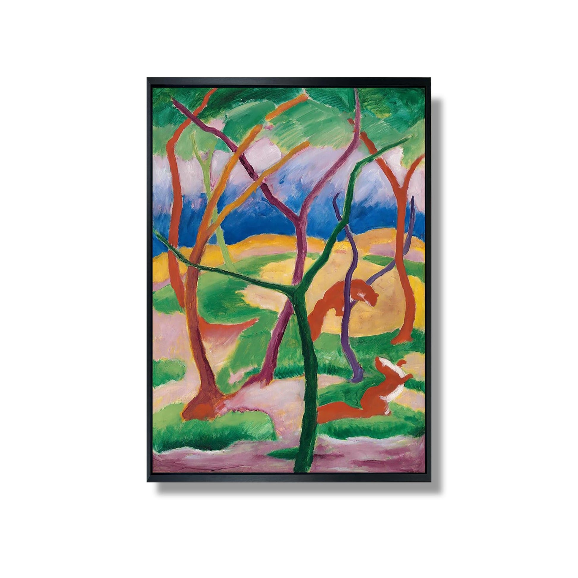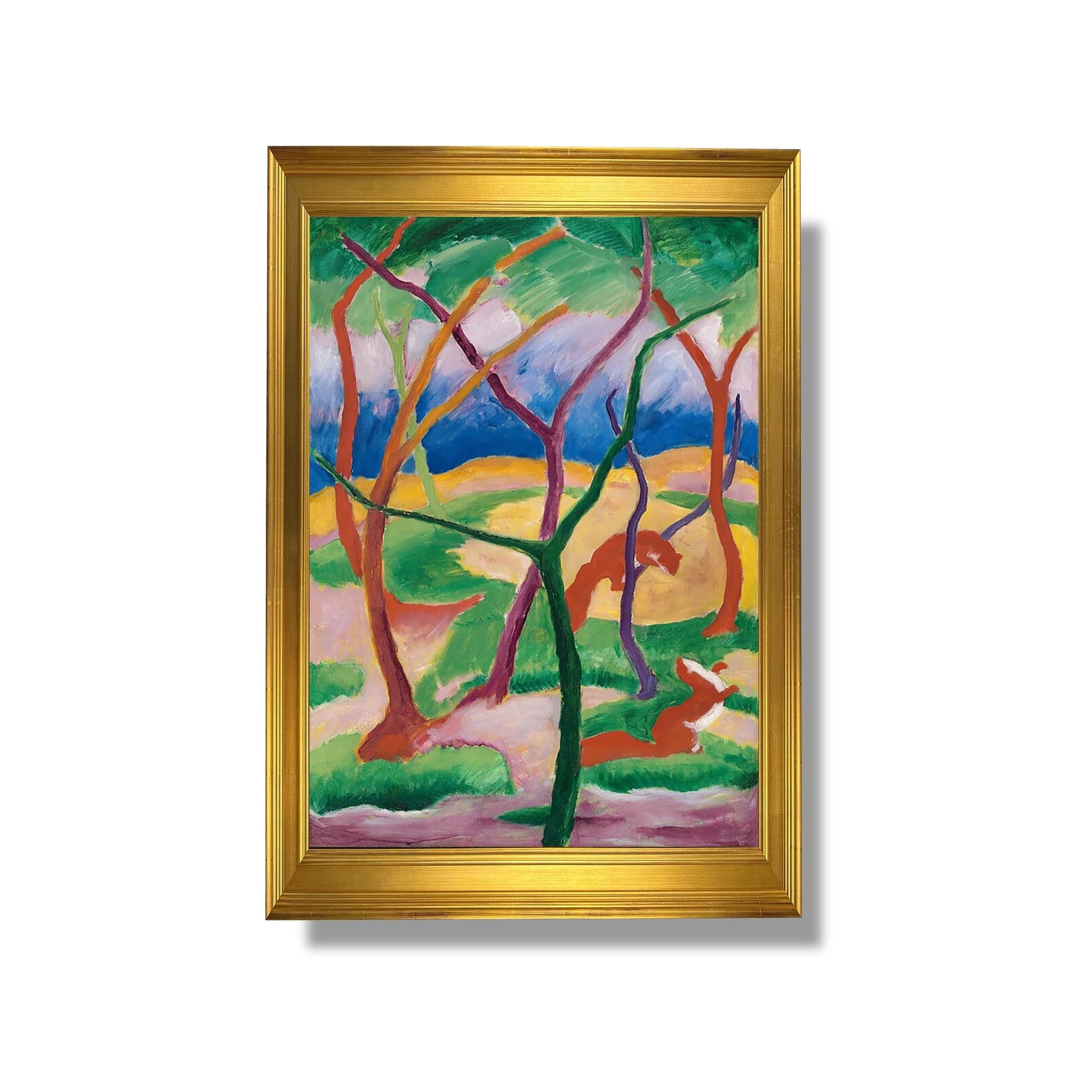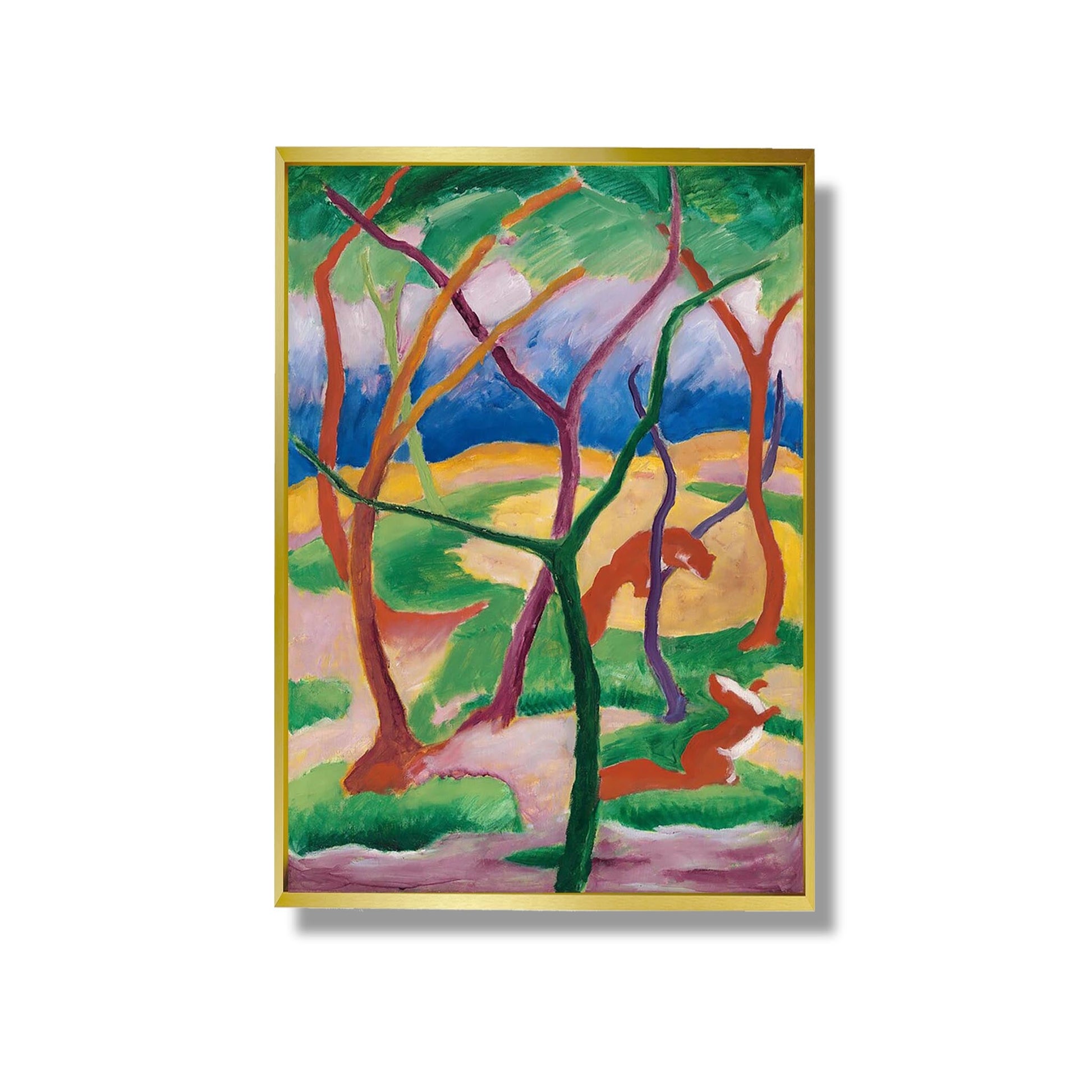 "Weasels at Play" is an iconic work by Franz Marc, a German painter from the early 20th century, known for his role in the Expressionist movement. Painted in 1913, this painting illustrates the artist's fascination with nature and animals, symbolizing the harmony between man and the animal world. The weasels, depicted in bright colors and stylized forms, evoke a playful and joyful dynamic. Marc uses vibrant hues to express deep emotions, while seeking to transcend reality. This work demonstrates his commitment to the spirituality of nature and his desire to capture the essence of animal life.