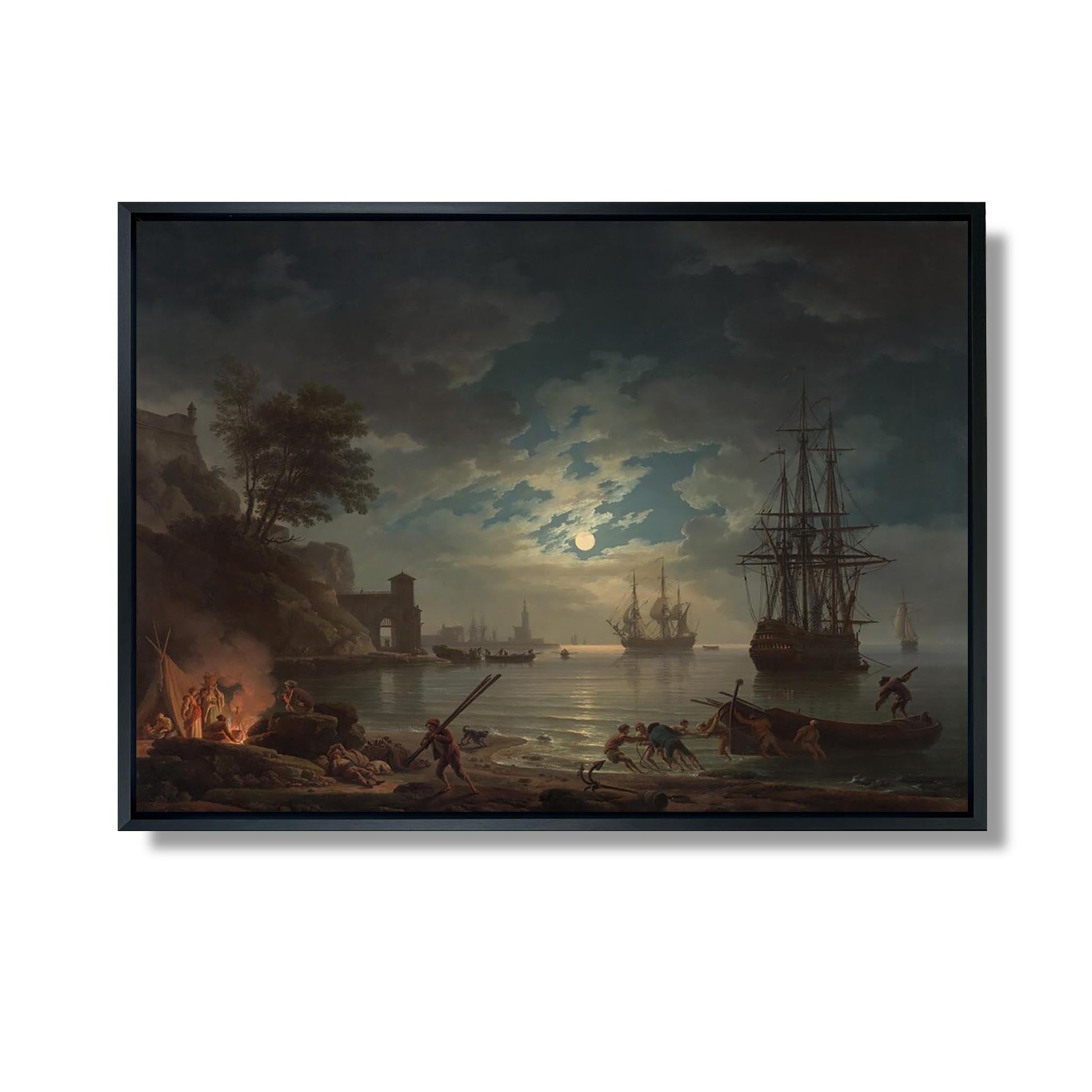 "Moonlight" by Claude-Joseph Vernet is an iconic 18th-century work, illustrating the painter's mastery in depicting nocturnal landscapes. This canvas depicts a romantic scene where moonlight gently illuminates a seascape, creating a poetic and melancholic atmosphere. Vernet, known for his seascapes, uses shades of blue and silver highlights to capture the magic of the night. The work evokes both the beauty of nature and the fragility of human existence, inviting the viewer to contemplate the serenity and grandeur of the nocturnal world.