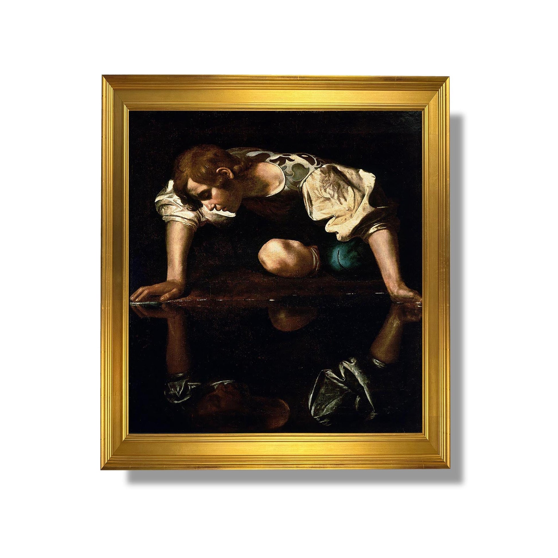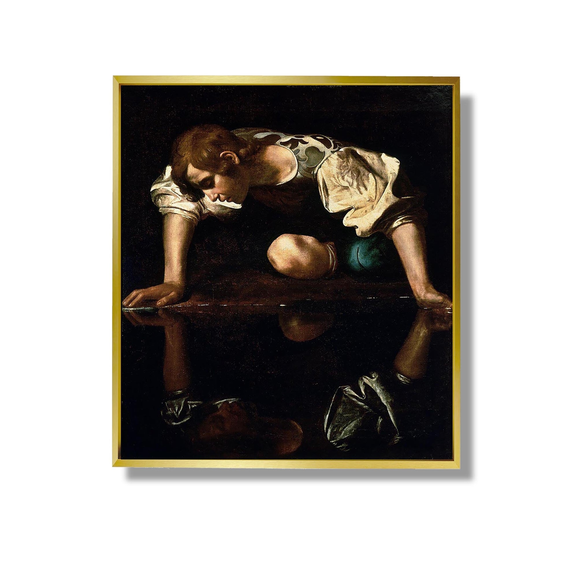 Caravaggio's "Narcissus", painted around 1599-1600, illustrates the Greek myth of Narcissus, a young man who falls in love with his own reflection. In this painting, the painter uses dramatic lighting and striking contrasts, characteristic of the Baroque style, to accentuate the beauty and tragedy of the character. Narcissus, leaning over a spring, is captivated by his image, symbolizing obsession and self-centeredness. The realism of the details and Narcissus' melancholic expression underline the psychological depth of the work, inviting the viewer to reflect on the nature of love and identity.