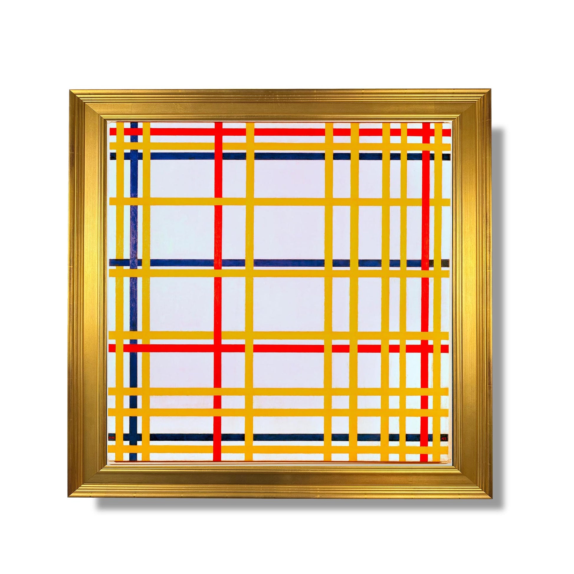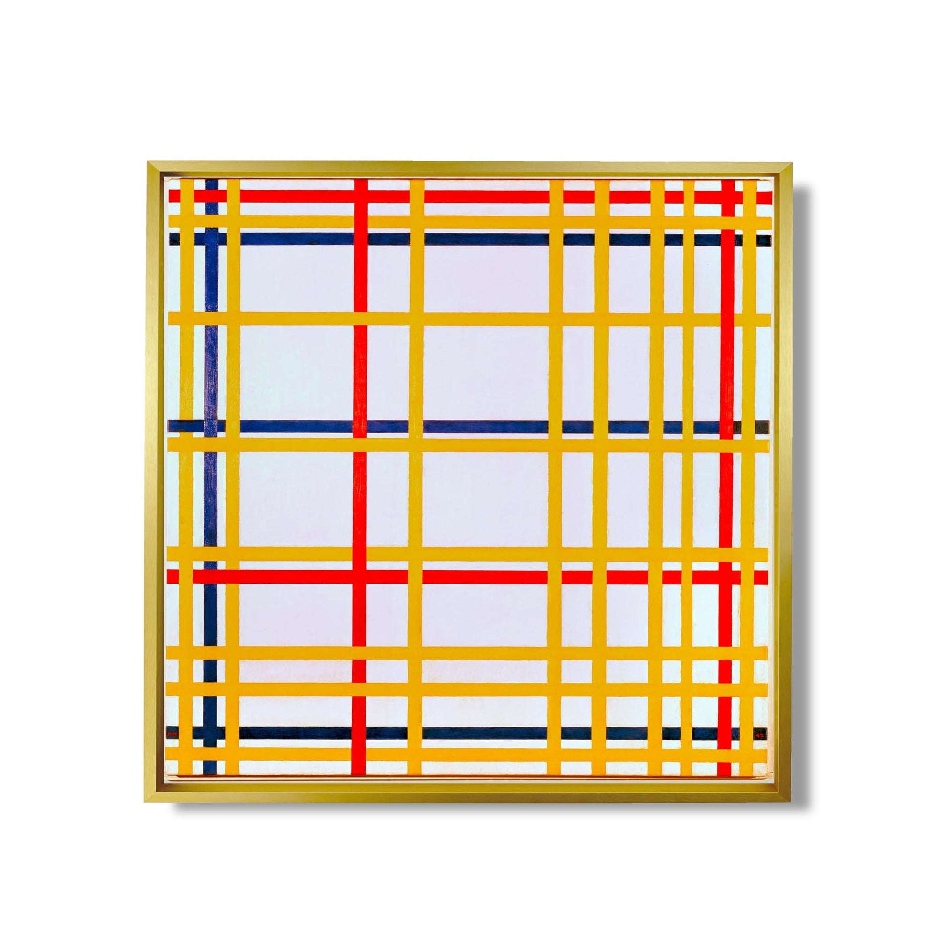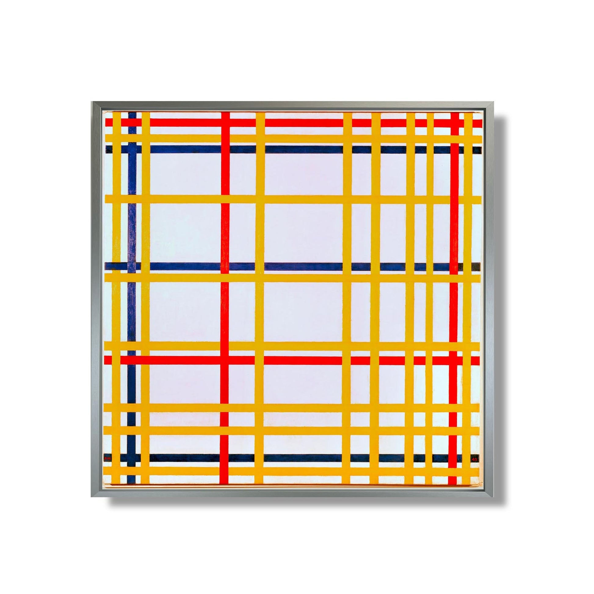 New York City by Piet Mondrian is a dynamic and striking abstraction that reflects the energy and rhythm of the modern city. The painting uses a grid of straight lines, with blocks of primary colors—red, blue, and yellow—set against a white background. This composition is a clear departure from natural forms, embracing Mondrian’s signature style of geometric abstraction. The structured grid evokes the architecture and grid-like streets of New York, while the bold color contrasts mirror the vibrancy and motion of city life. It encapsulates Mondrian’s vision of harmony and order through abstraction, celebrating the modern world.