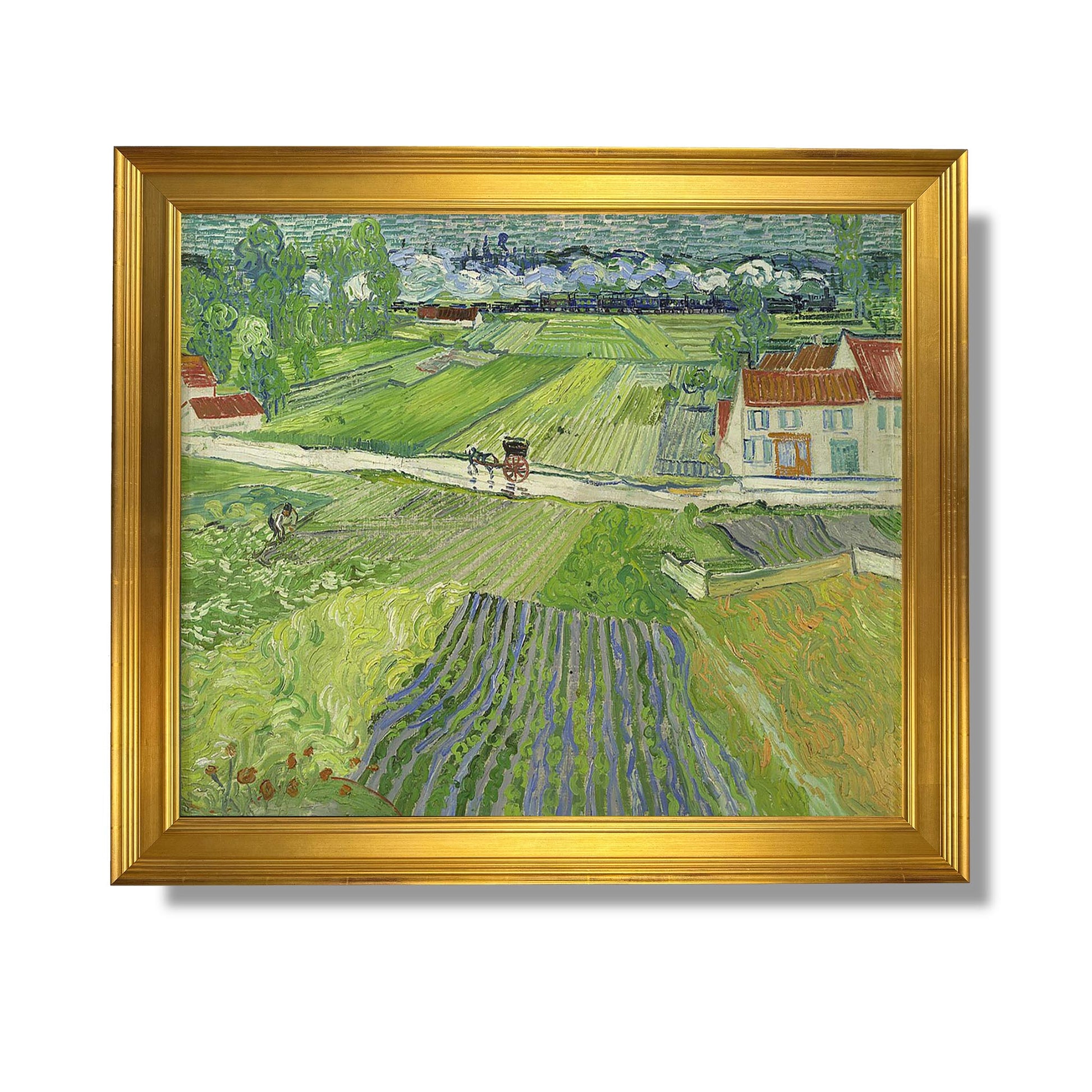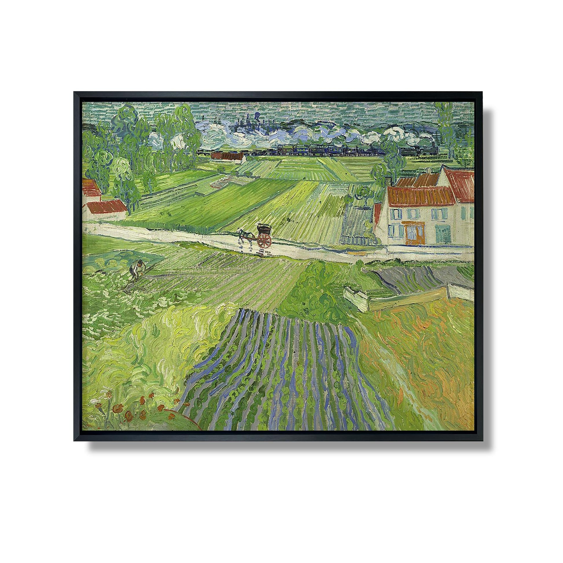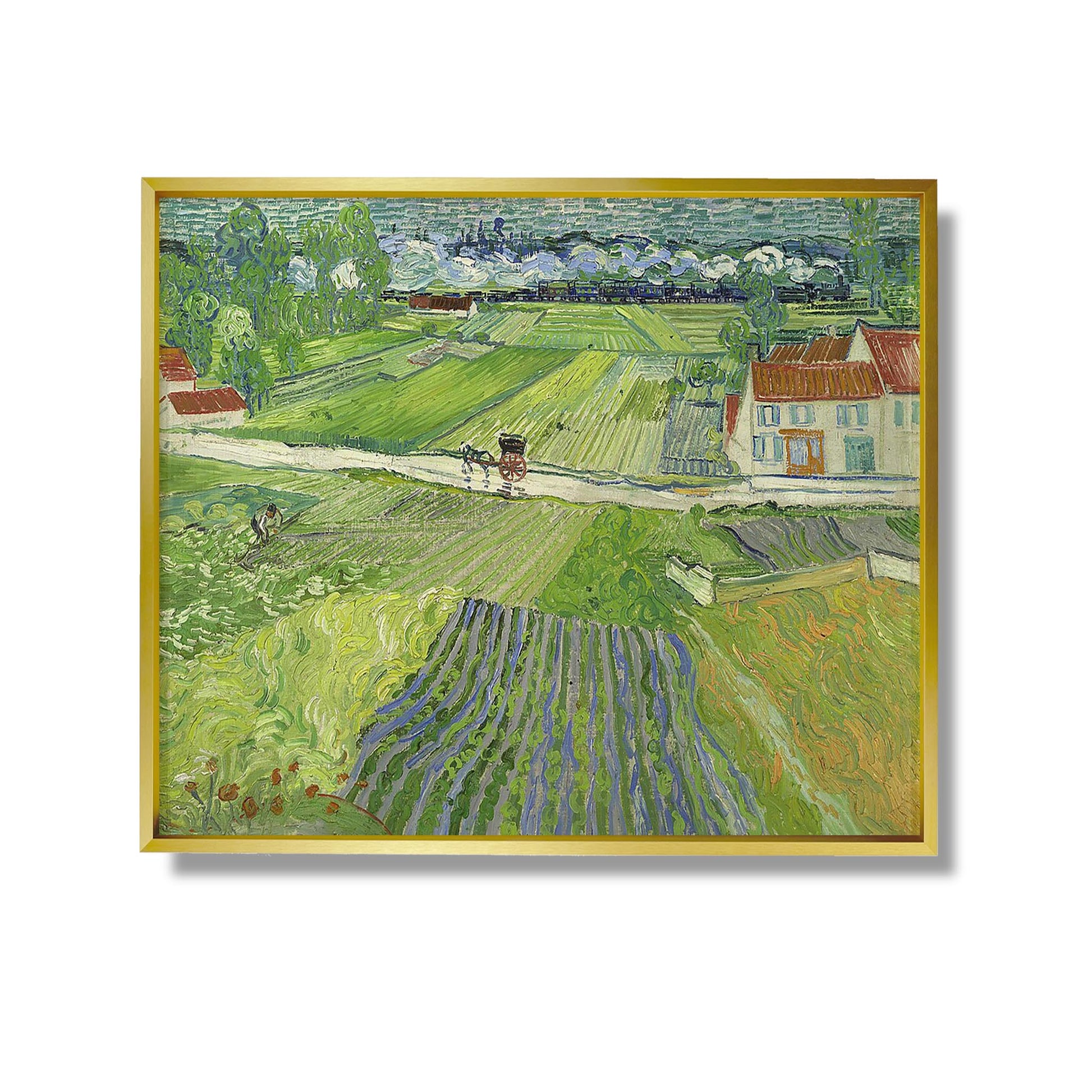 "Landscape with Carriage and Train in the Background" (1890) is an iconic work by Vincent Van Gogh, exemplifying his unique post-impressionist style. In this painting, Van Gogh captures a vibrant rural scene, where a horse-drawn carriage and train stand out against a bustling landscape. The bright colors and dynamic brushstrokes convey a sense of movement and energy. The work reflects the artist's interest in modernity and change, while remaining deeply rooted in nature. This painting speaks to the duality between industrial progress and the beauty of traditional landscapes.