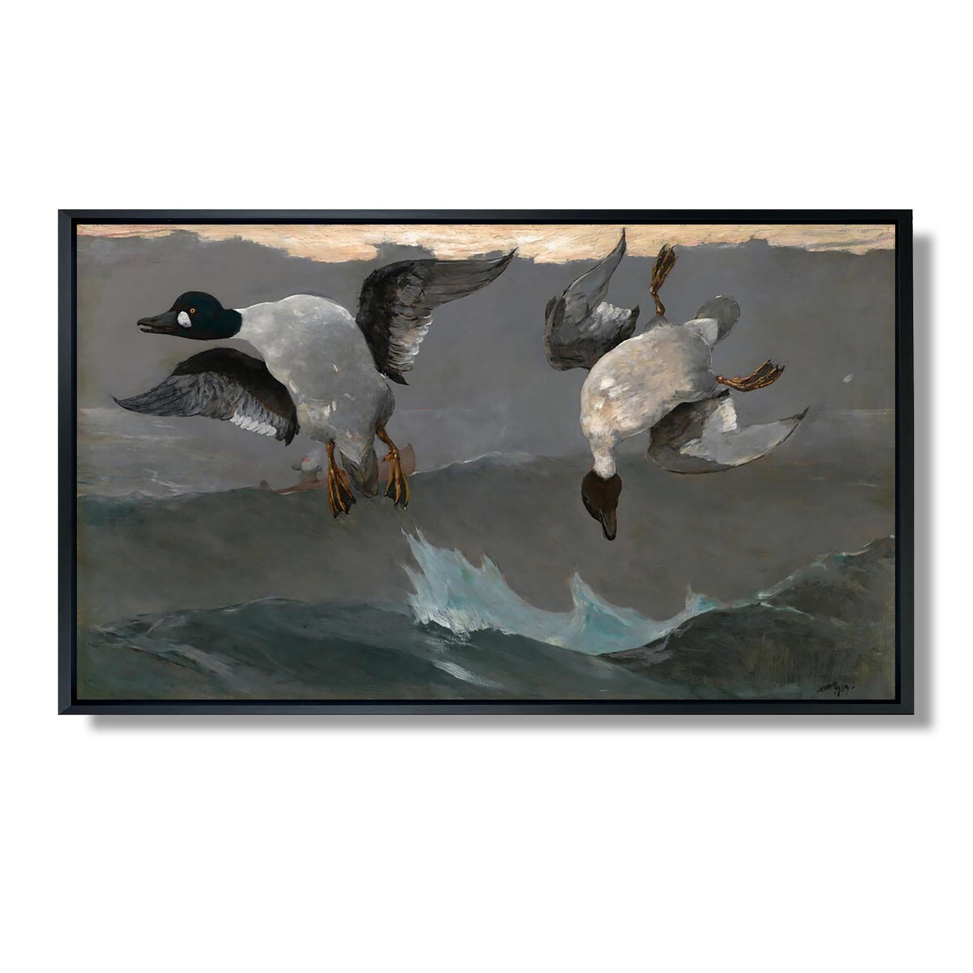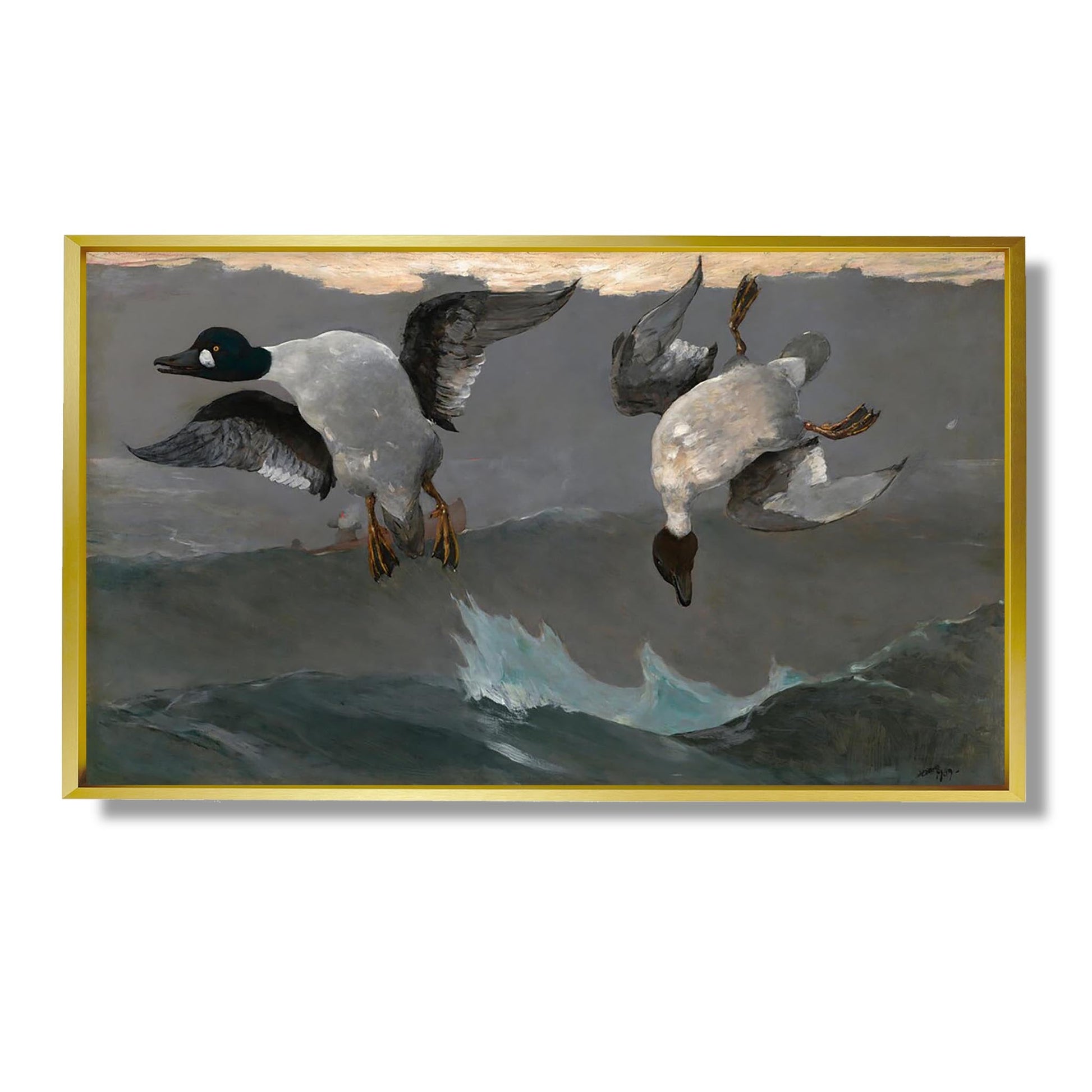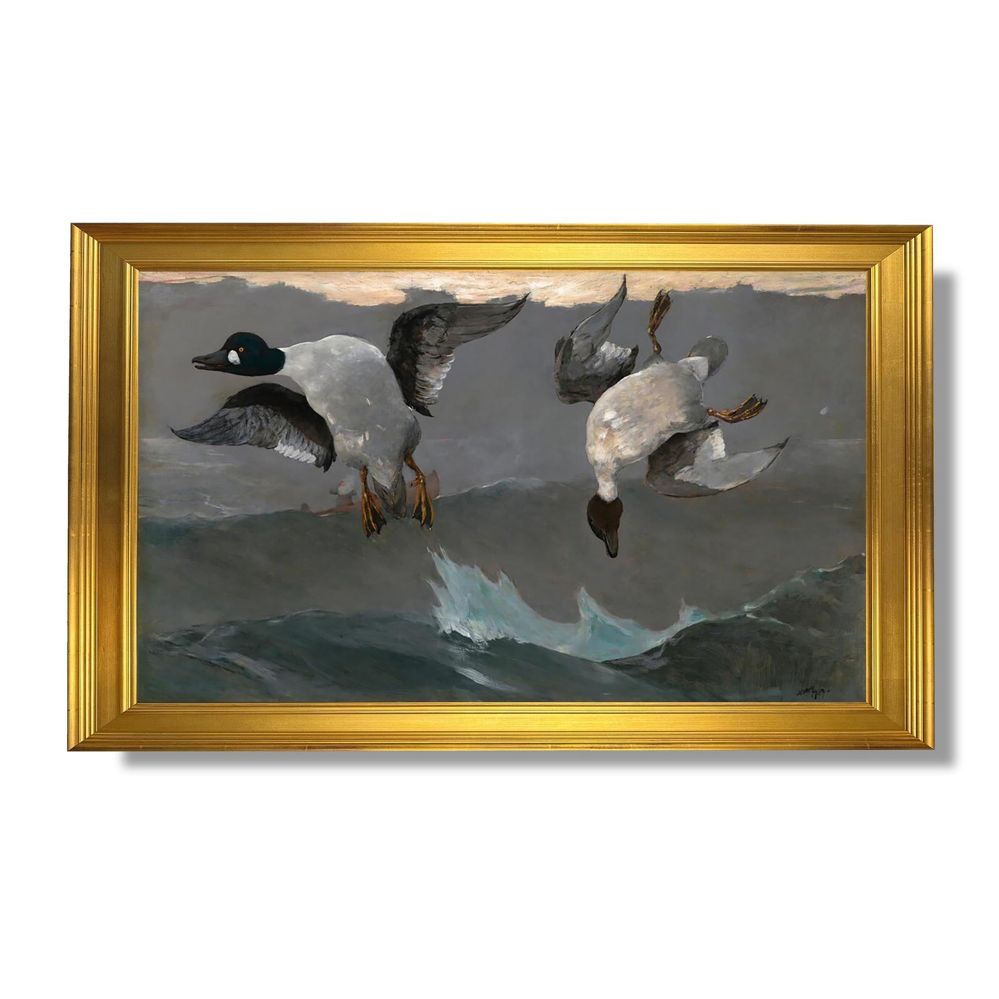"Right and Left" is an iconic work by Winslow Homer, painted in 1909. The painting illustrates the artist's passion for nature and the outdoors, depicting a hunter shooting two ducks in mid-flight. The dynamic composition and play of light reveal Homer's mastery of movement and emotion. The vivid colors and minute details of the birds and landscape demonstrate his keen observation of wildlife. This work embodies the harmony between man and nature, while highlighting the rugged beauty of the natural world.