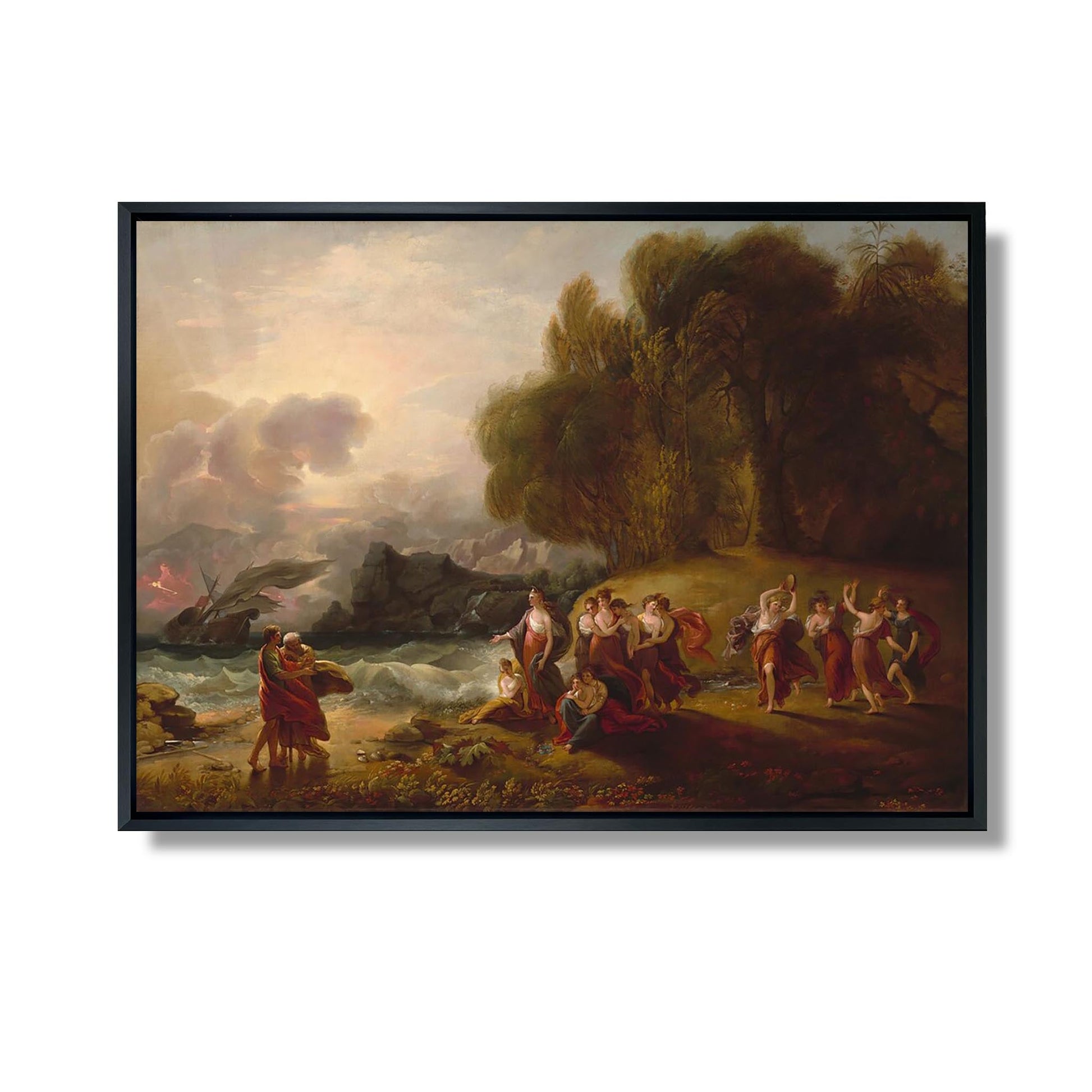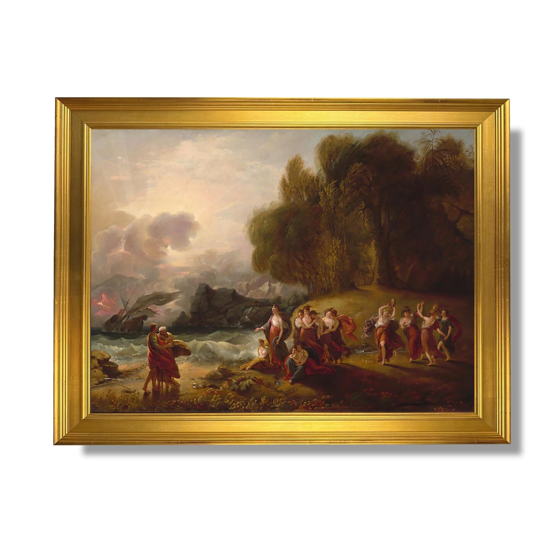 Benjamin West's "Telemachus and Calypso" is an iconic work of Neoclassicism, created in 1783. It illustrates a key moment in Homer's Odyssey, when Telemachus, son of Odysseus, meets Calypso, the nymph who has held his father captive on the island of Ogygia. West captures the emotional intensity of this encounter, highlighting the beauty and melancholy of the characters. The composition, rich in detail and color, reflects the influence of the great masters of the Renaissance. This work bears witness to the quest for identity and love, while celebrating classical mythology.