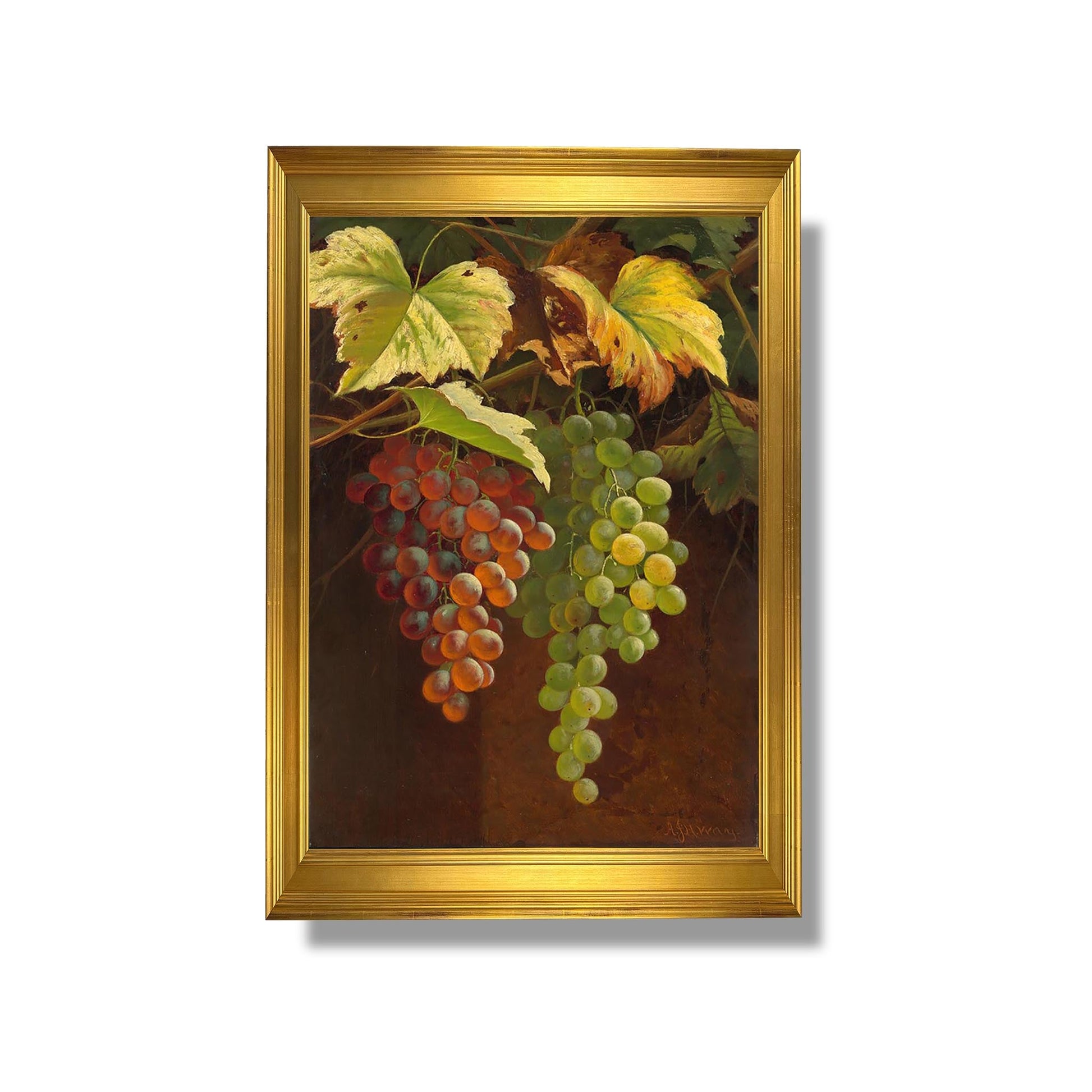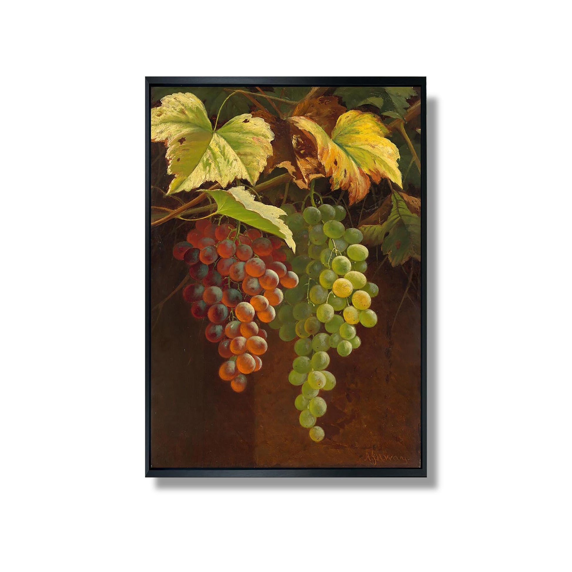 "Two Bunches of Grapes" is an iconic work by Andrew John Henry Way, a 19th-century American painter known for his skill in depicting still life. In this composition, Way captures the beauty of the grape clusters with remarkable precision, highlighting the nuances of color and texture of the fruit. Light plays a vital role, creating highlights and shadows that add depth to the work. This painting not only exemplifies Way's technical mastery, but also his appreciation for the simplicity and elegance of nature, inviting the viewer to contemplate the ephemeral beauty of things.