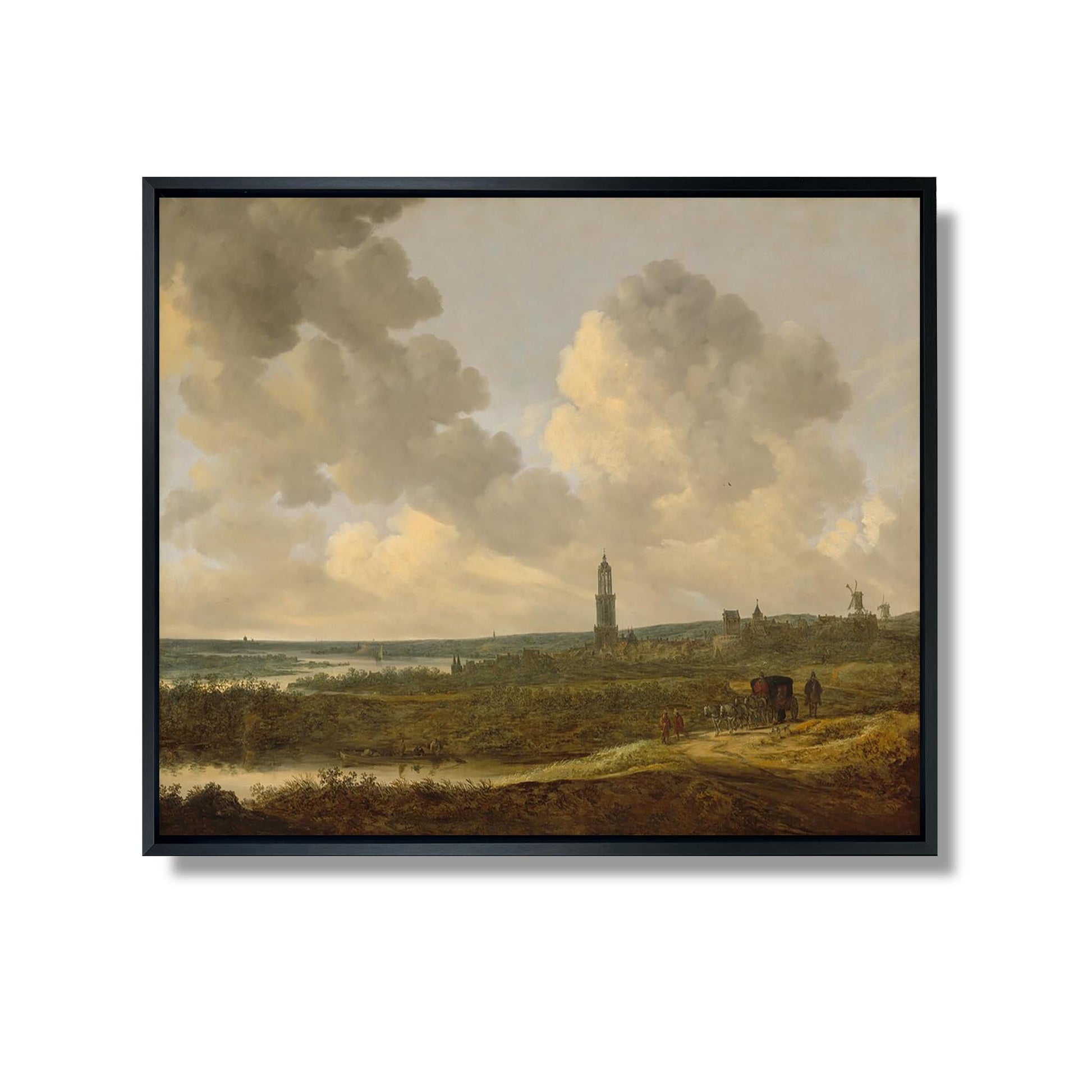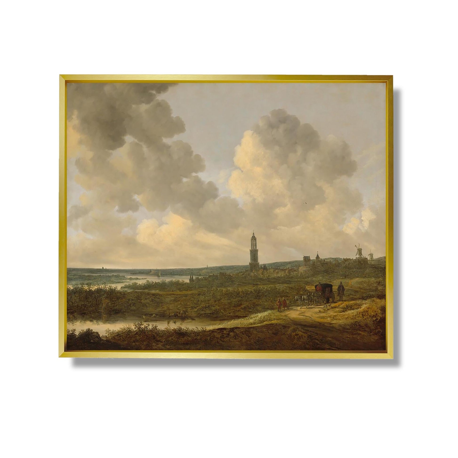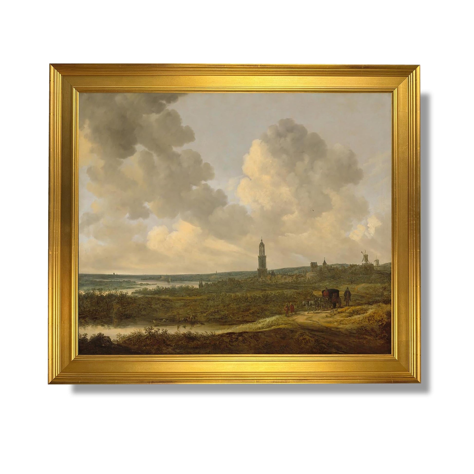 "View of Rhenen" is an iconic work by Dutch painter Jan van Goyen, created in the 17th century. This painting captures a peaceful landscape along the Rhine River, emphasizing natural beauty and the harmony between man and his environment. Van Goyen uses soft tones and shades of gray to create a serene atmosphere, while incorporating architectural elements such as houses and churches, which are evidence of everyday life. His style, characterized by balanced compositions and attention to detail, perfectly exemplifies the Dutch landscape movement, marking an important step in the evolution of landscape painting.