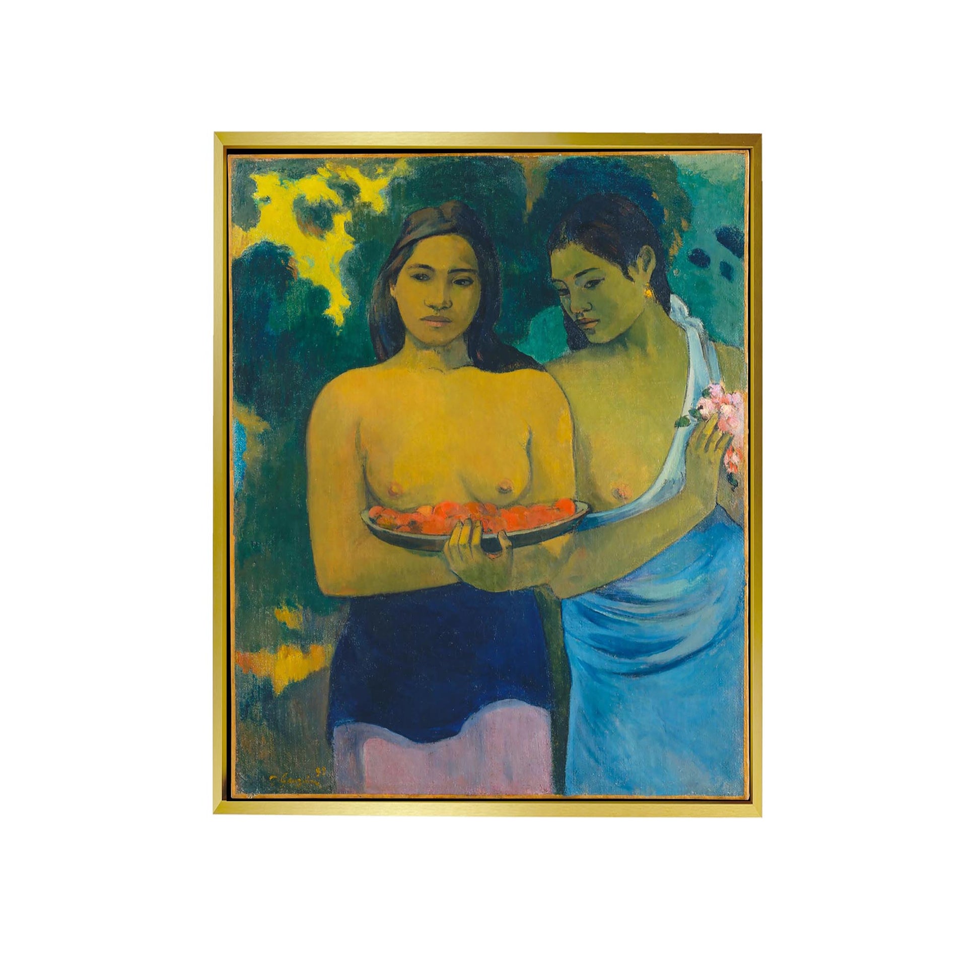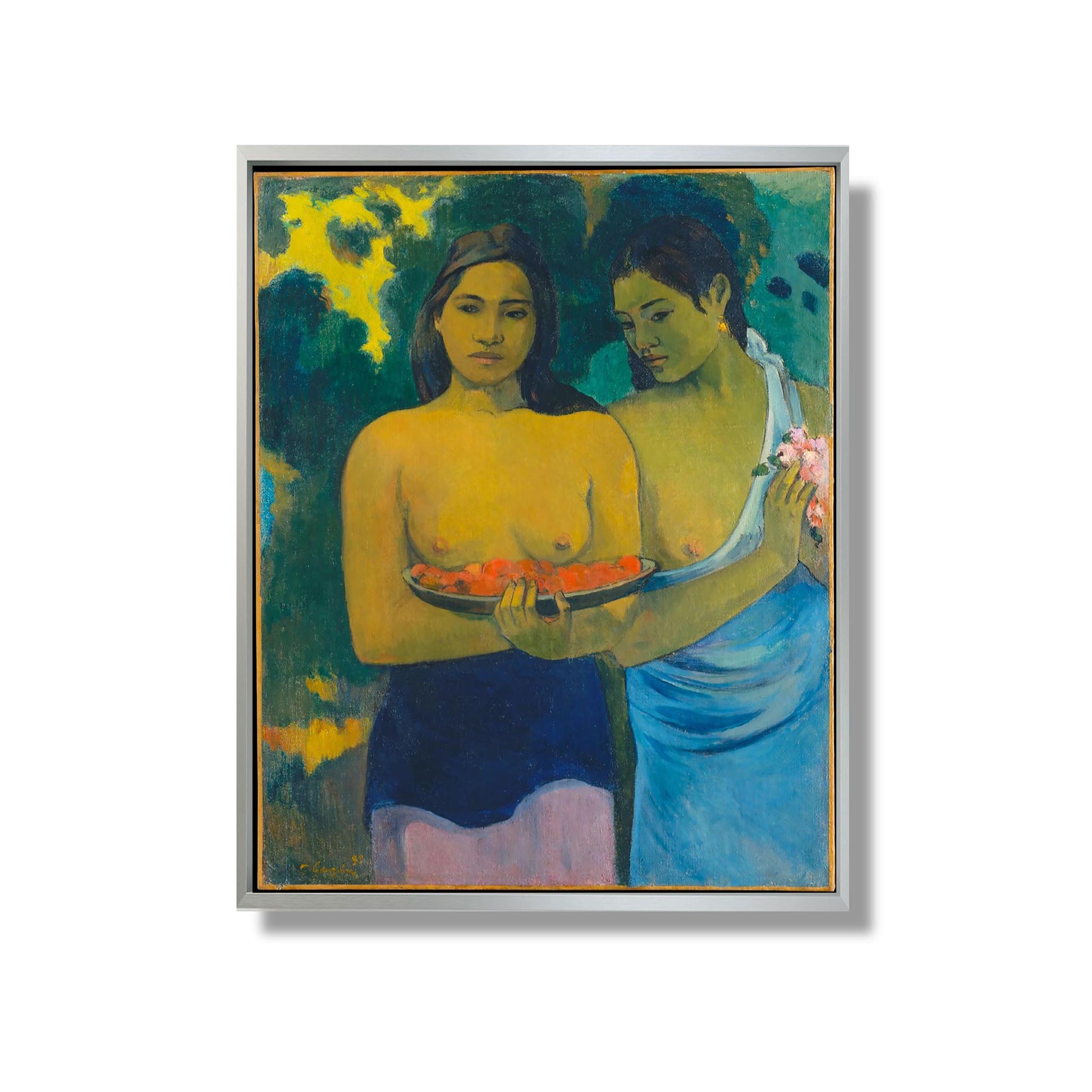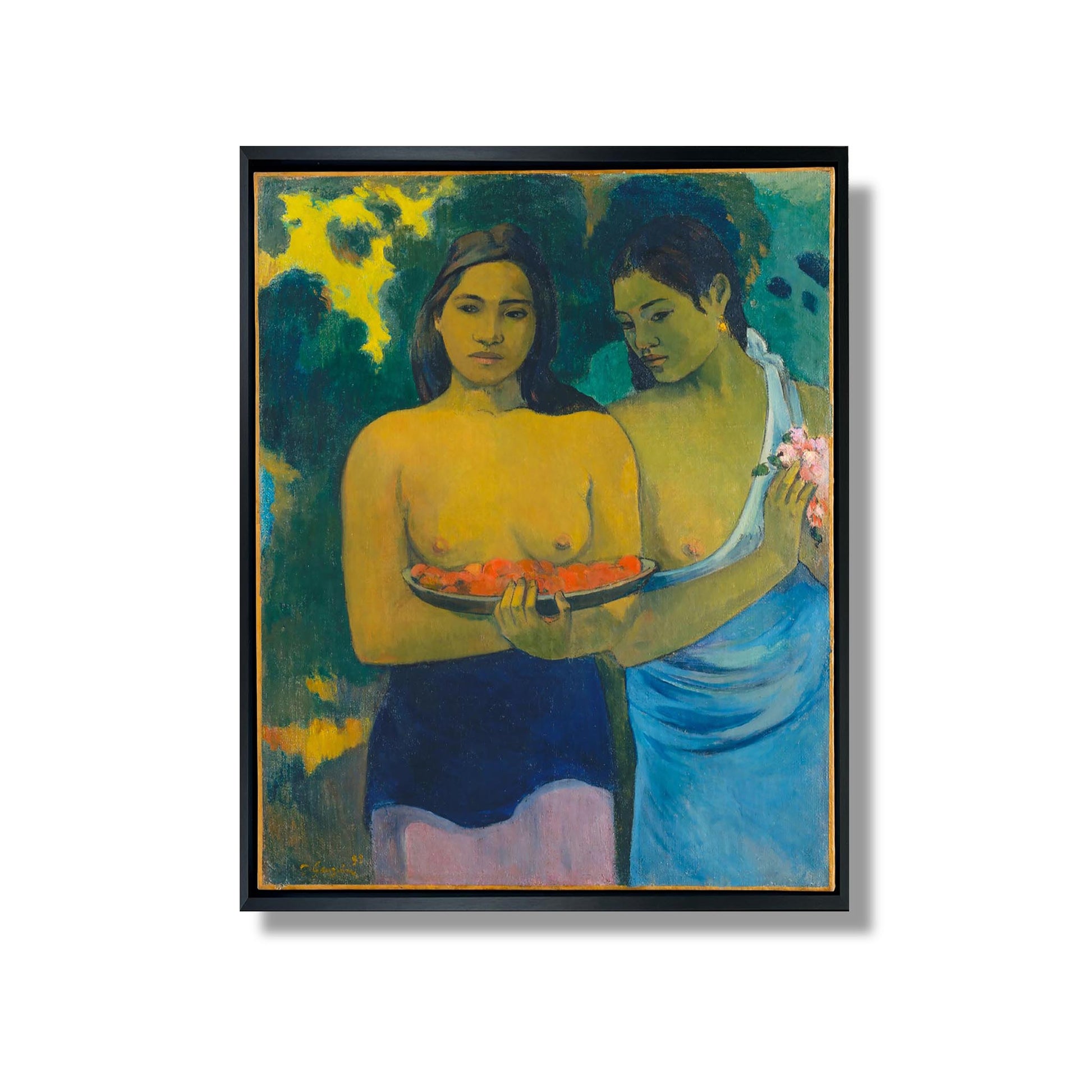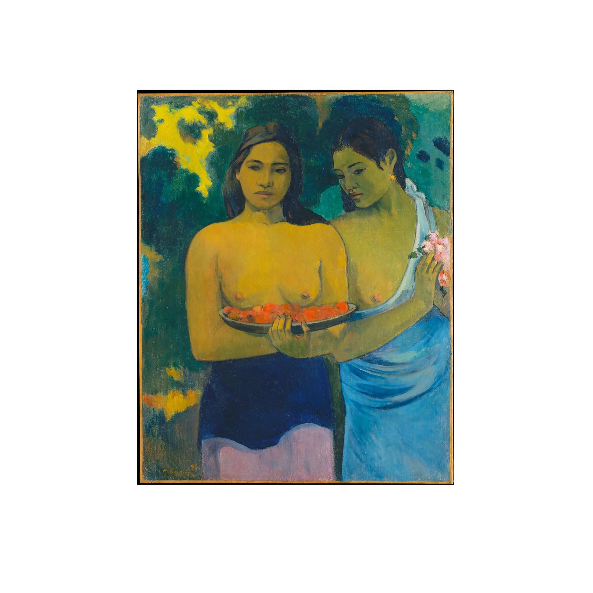 "Deux Tahitiennes" est une œuvre emblématique de Paul Gauguin, peinte en 1899. Cette toile représente deux femmes tahitiennes, vêtues de costumes traditionnels, assises dans un paysage luxuriant. Les couleurs vives et les formes stylisées témoignent de l'influence du post-impressionnisme et de l'art primitif. Gauguin cherche à capturer l'essence de la vie polynésienne, loin des conventions européennes. Les visages des femmes, empreints de sérénité, évoquent une spiritualité profonde, tandis que le décor tropical souligne la beauté et l'exotisme de Tahiti.