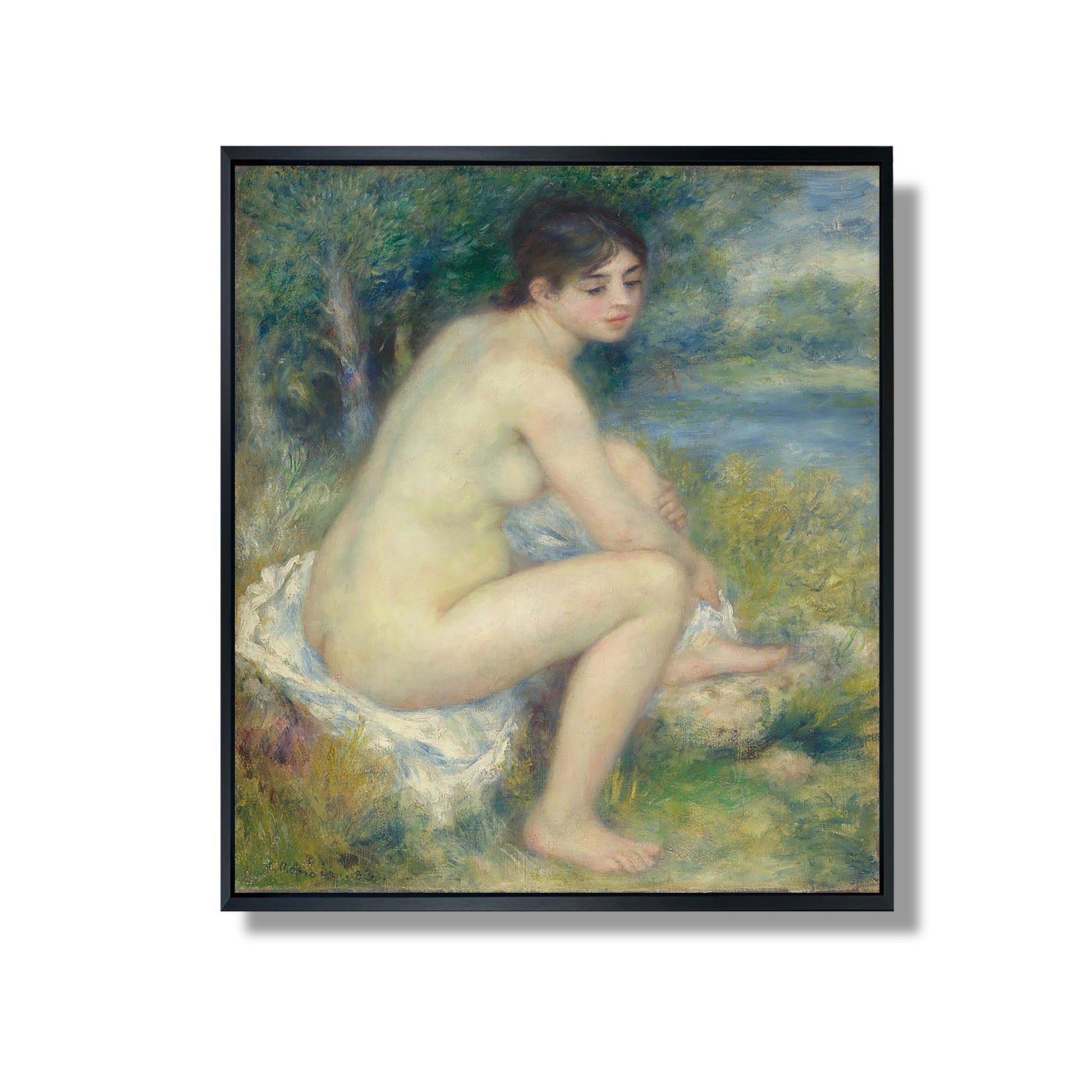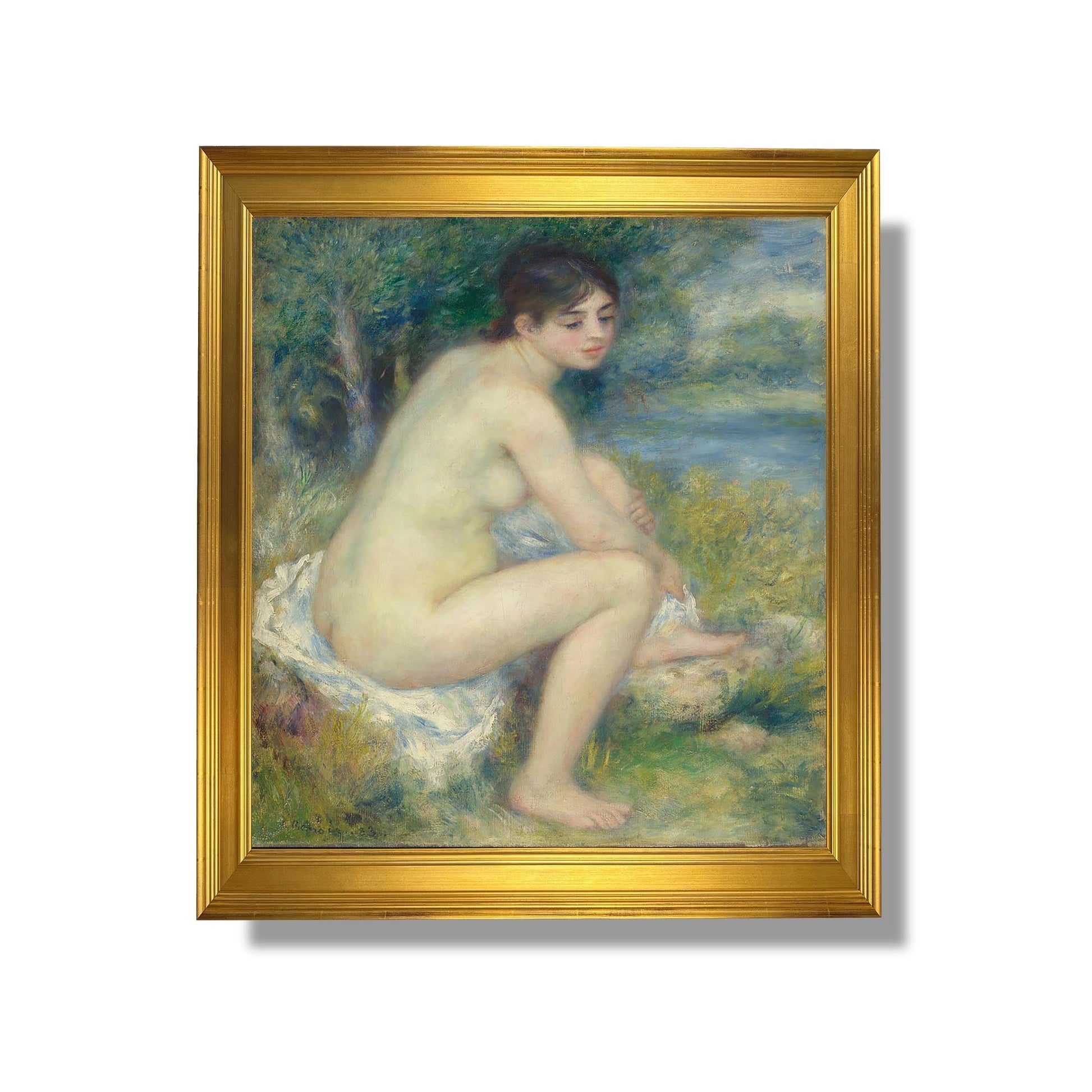 "Femme Nue dans un Paysage" est une œuvre emblématique de Pierre-Auguste Renoir, réalisée en 1876. Ce tableau illustre la fascination de l'artiste pour la beauté féminine et la nature. La composition met en scène une femme nue, allongée sur l'herbe, entourée d'un paysage verdoyant et lumineux. Les couleurs vives et les touches de pinceau fluides témoignent du style impressionniste de Renoir, capturant la lumière et l'atmosphère. L'œuvre évoque une sensualité délicate et une harmonie entre le corps humain et la nature, célébrant la vie et la beauté dans toute leur splendeur.