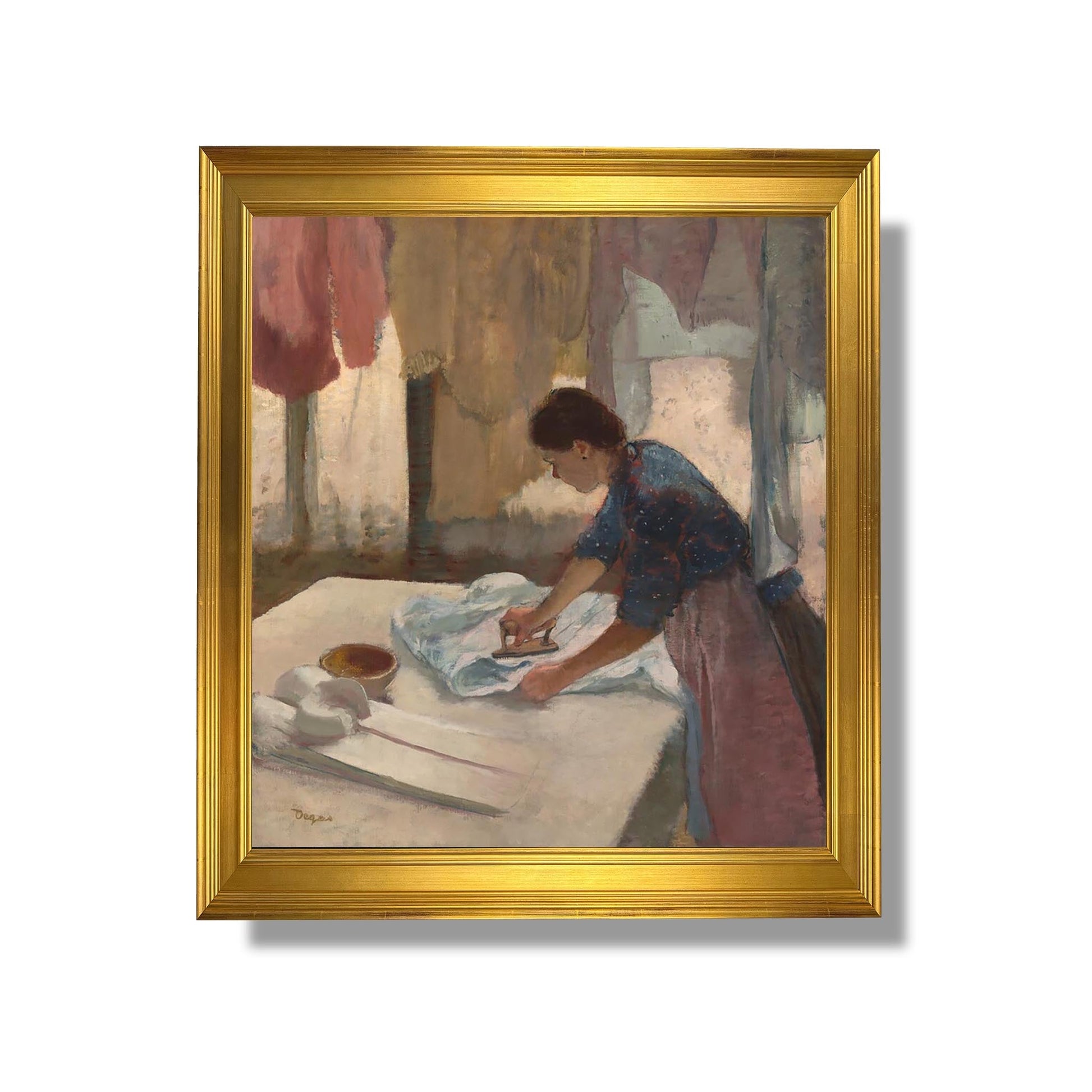 Edgar Degas, maître du mouvement impressionniste, a capturé la vie quotidienne avec une sensibilité unique. Dans son œuvre "Femme repassant", réalisée en 1873, il dépeint une femme absorbée par son travail domestique, illustrant la beauté des gestes ordinaires. La composition met en avant des lignes fluides et des jeux de lumière, typiques de son style. Degas utilise des angles de vue innovants, créant une intimité avec le sujet. Cette toile témoigne de son intérêt pour la condition féminine et la représentation du temps, tout en révélant la poésie cachée dans les tâches quotidiennes.