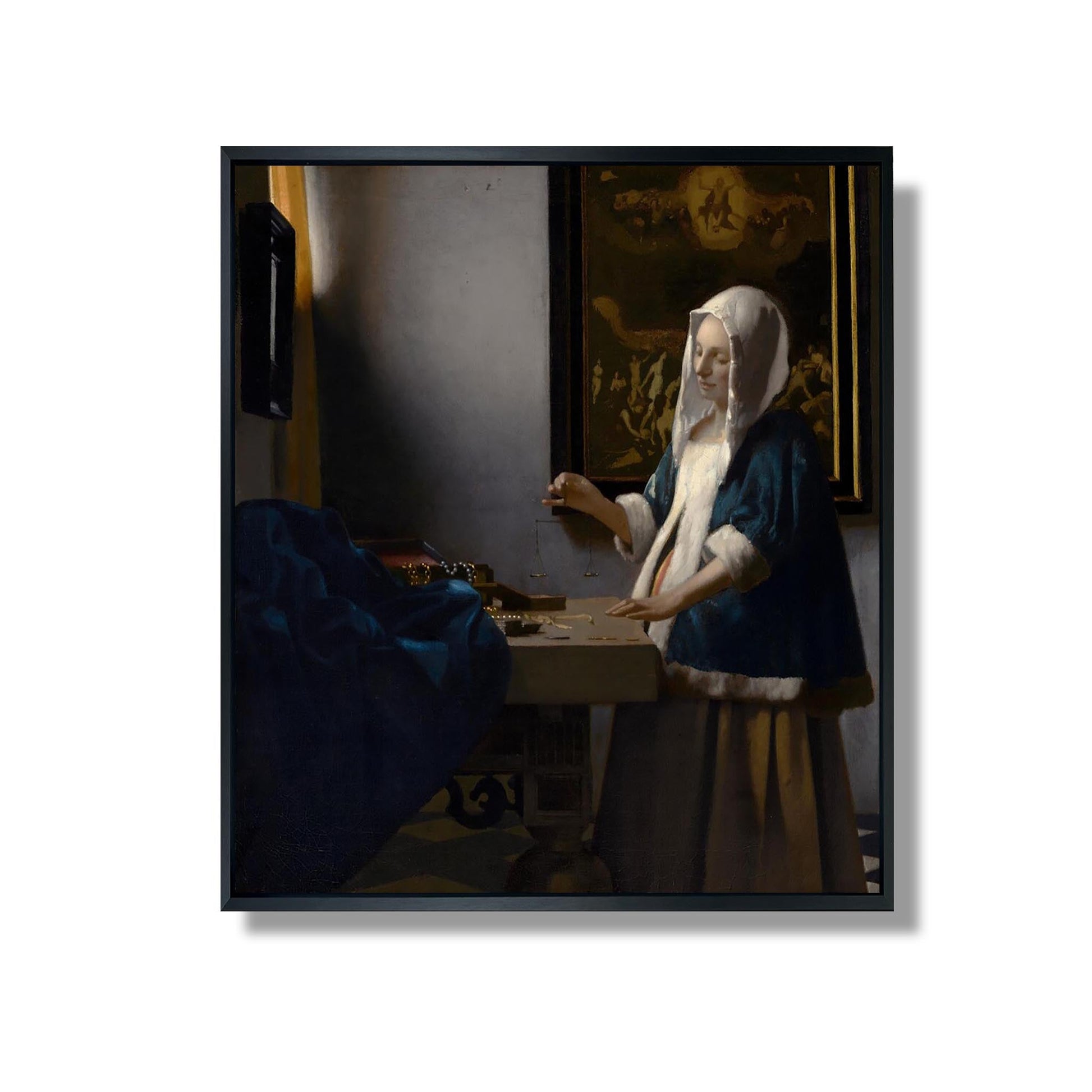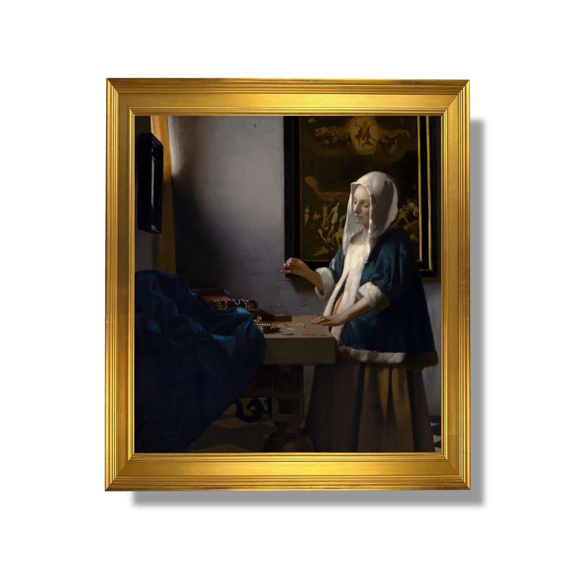 L'œuvre "Femme tenant une balance" de Johannes Vermeer, peinte vers 1664, est un chef-d'œuvre emblématique du baroque néerlandais. Cette toile représente une femme, probablement une allégorie de la justice, tenant une balance dans une pièce baignée de lumière. Le jeu subtil des ombres et des reflets met en valeur la délicatesse de son visage et la richesse des textures. En arrière-plan, un tableau de la Vierge à l'Enfant souligne la dualité entre la spiritualité et la matérialité. Vermeer, maître de la lumière, invite à une réflexion sur l'équilibre entre les valeurs matérielles et spirituelles.