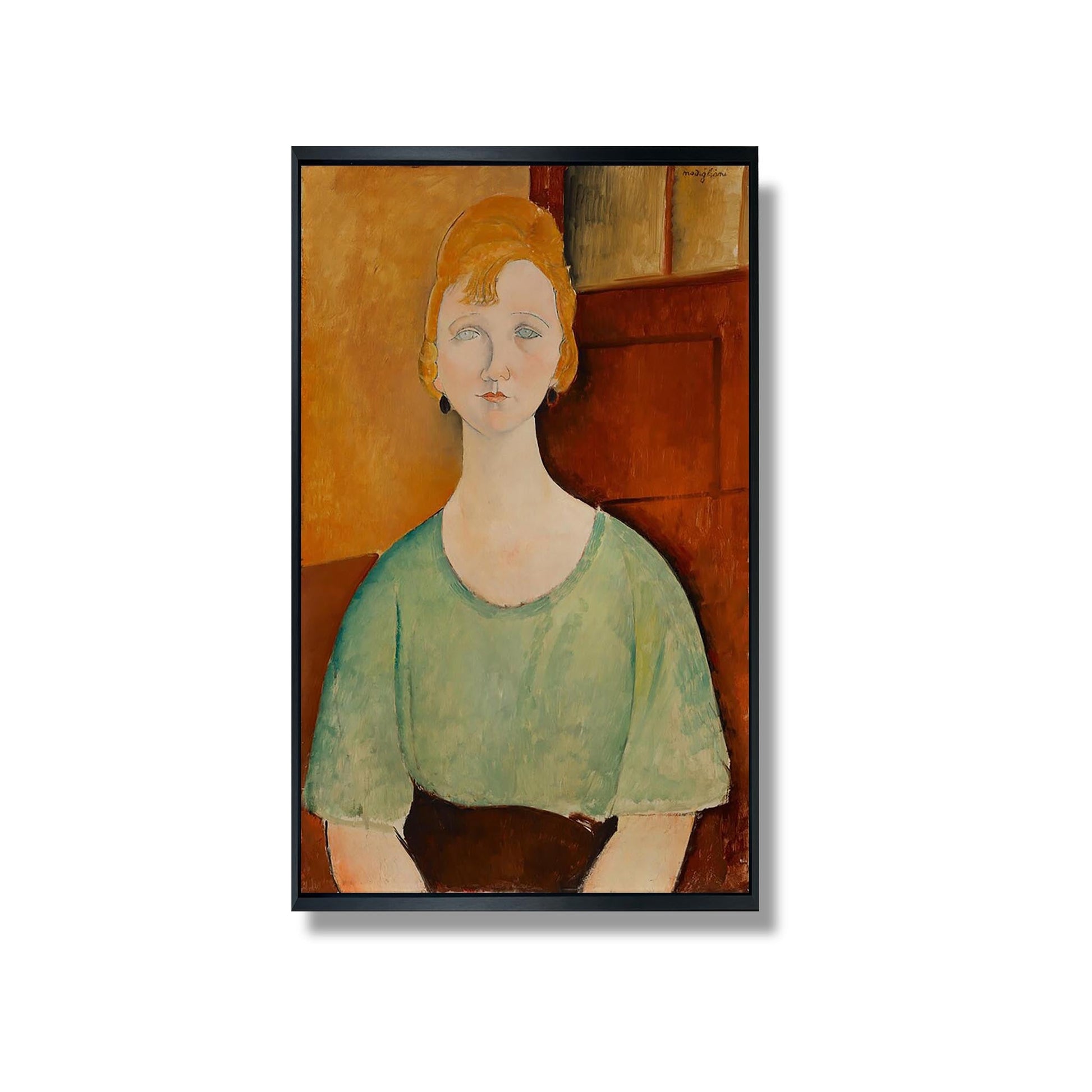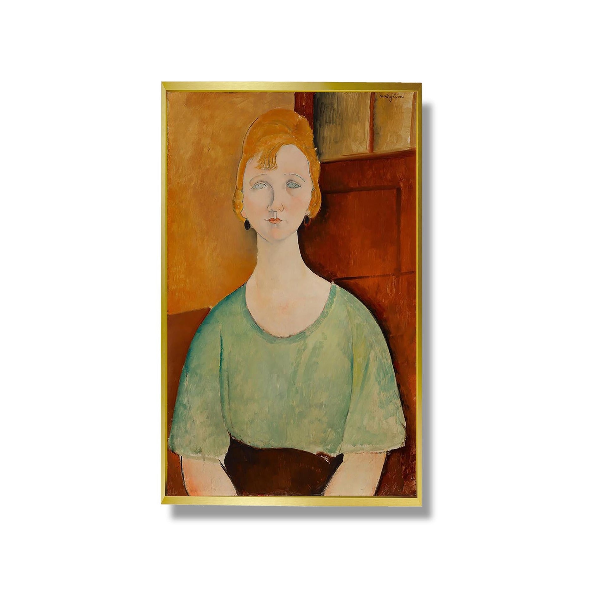 "Fille en chemisier vert" est une œuvre emblématique d'Amedeo Modigliani, réalisée en 1918. Ce tableau illustre le style unique de l'artiste, caractérisé par des formes allongées et des visages stylisés. La jeune femme, vêtue d'un chemisier vert, dégage une aura de mystère et de mélancolie. Les couleurs douces et les contours fluides créent une atmosphère intimiste, tandis que le regard de la modèle semble à la fois distant et captivant. Modigliani, influencé par le cubisme et l'art africain, parvient à exprimer une profonde humanité à travers cette représentation, faisant de cette œuvre un chef-d'œuvre du XXe siècle.
