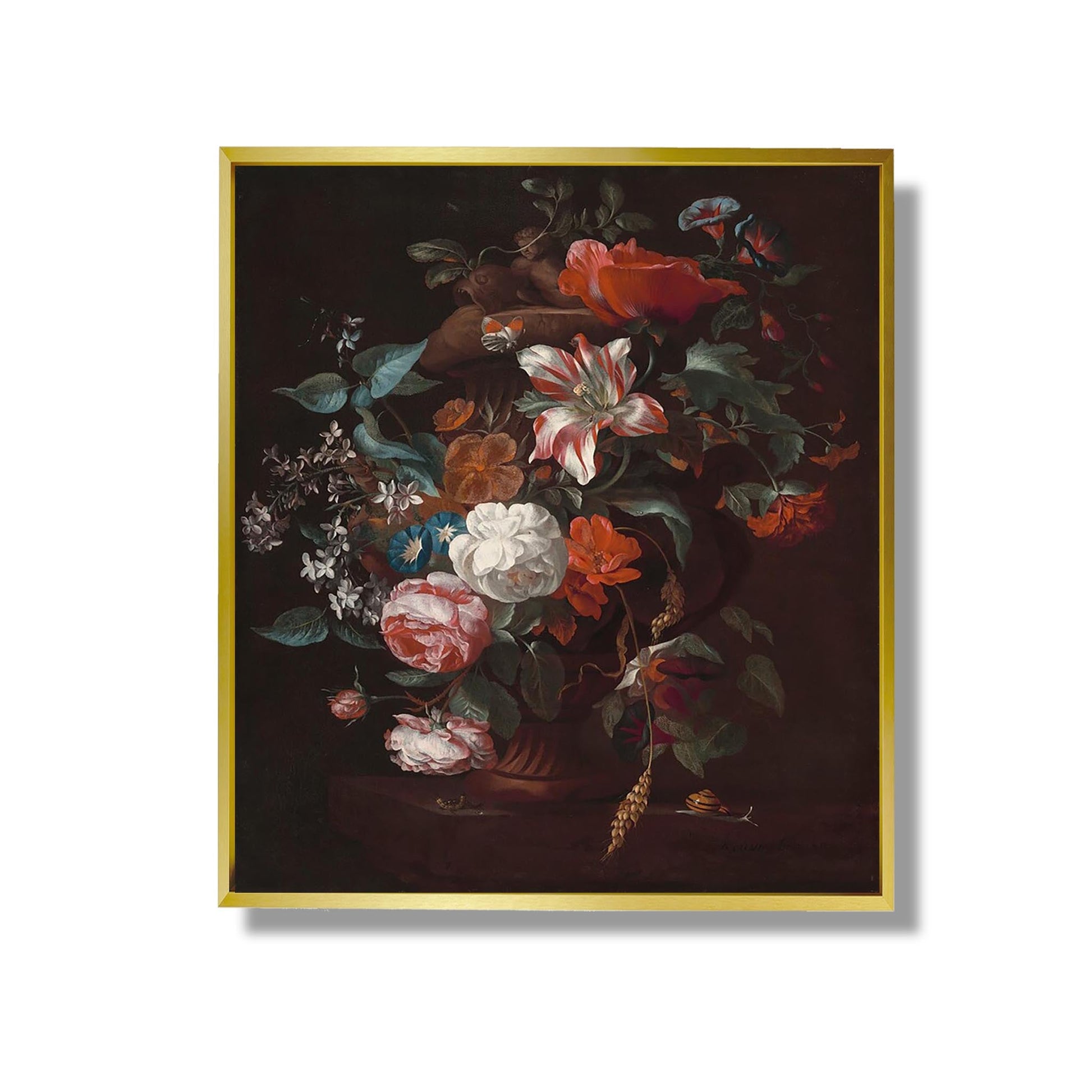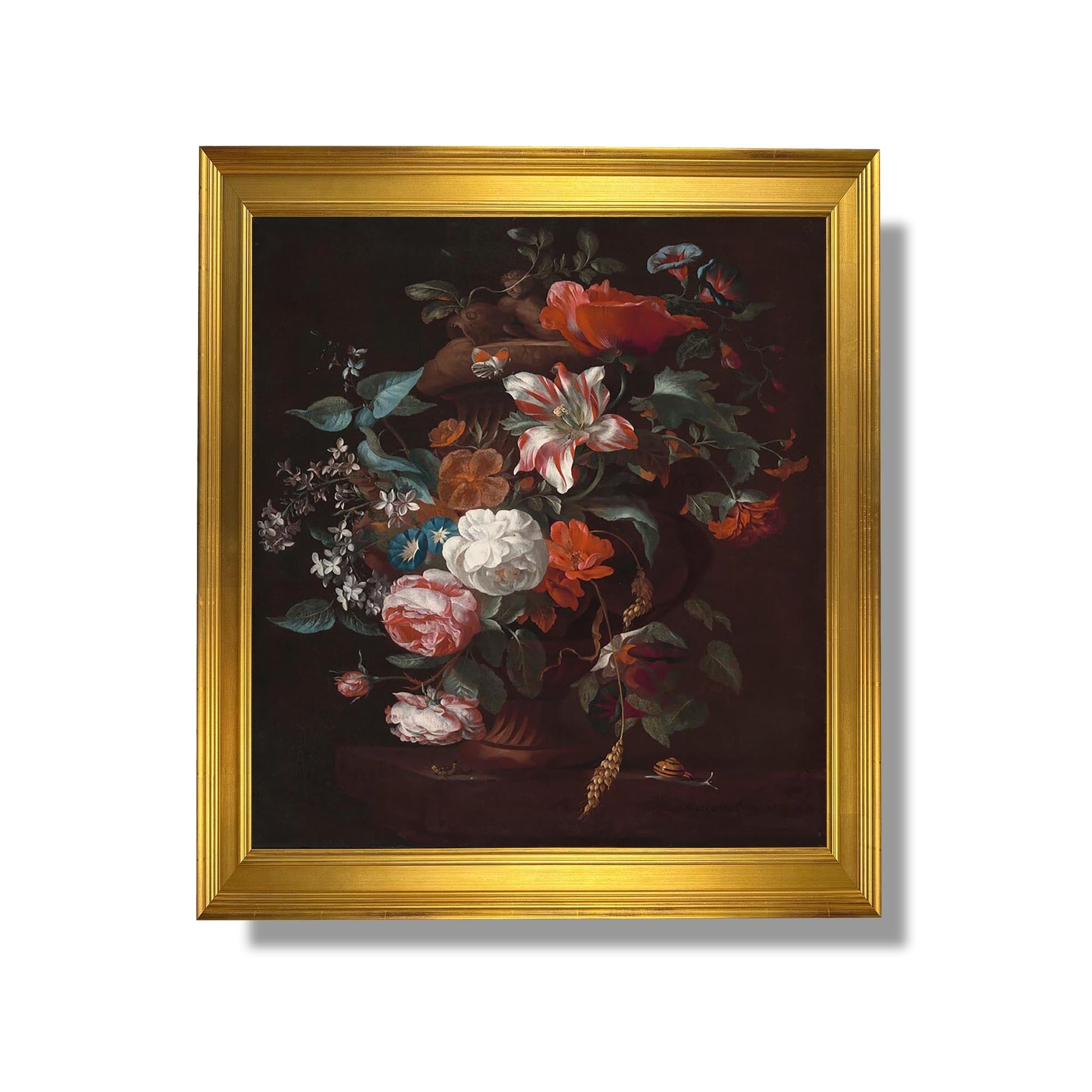 Philip van Kouwenbergh, peintre néerlandais du XVIIe siècle, est reconnu pour ses compositions florales vibrantes, dont "Flowers in a Vase". Cette œuvre emblématique illustre son habileté à capturer la beauté éphémère des fleurs. Le tableau présente un vase débordant de fleurs colorées, soigneusement disposées pour créer un équilibre harmonieux. Les détails minutieux et les jeux de lumière révèlent une maîtrise technique impressionnante. Van Kouwenbergh, à travers cette œuvre, célèbre la nature tout en explorant des thèmes de la vanité et de la fragilité de la vie, invitant le spectateur à apprécier la beauté fugace.