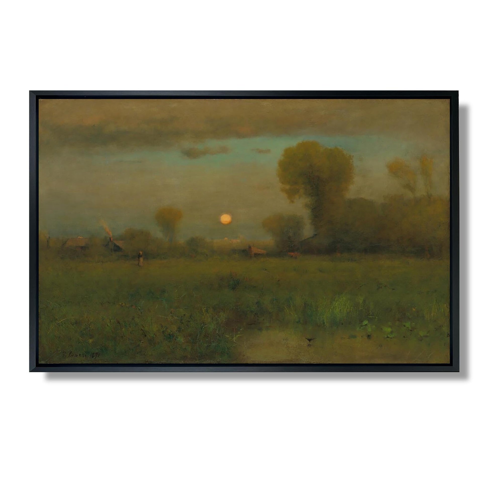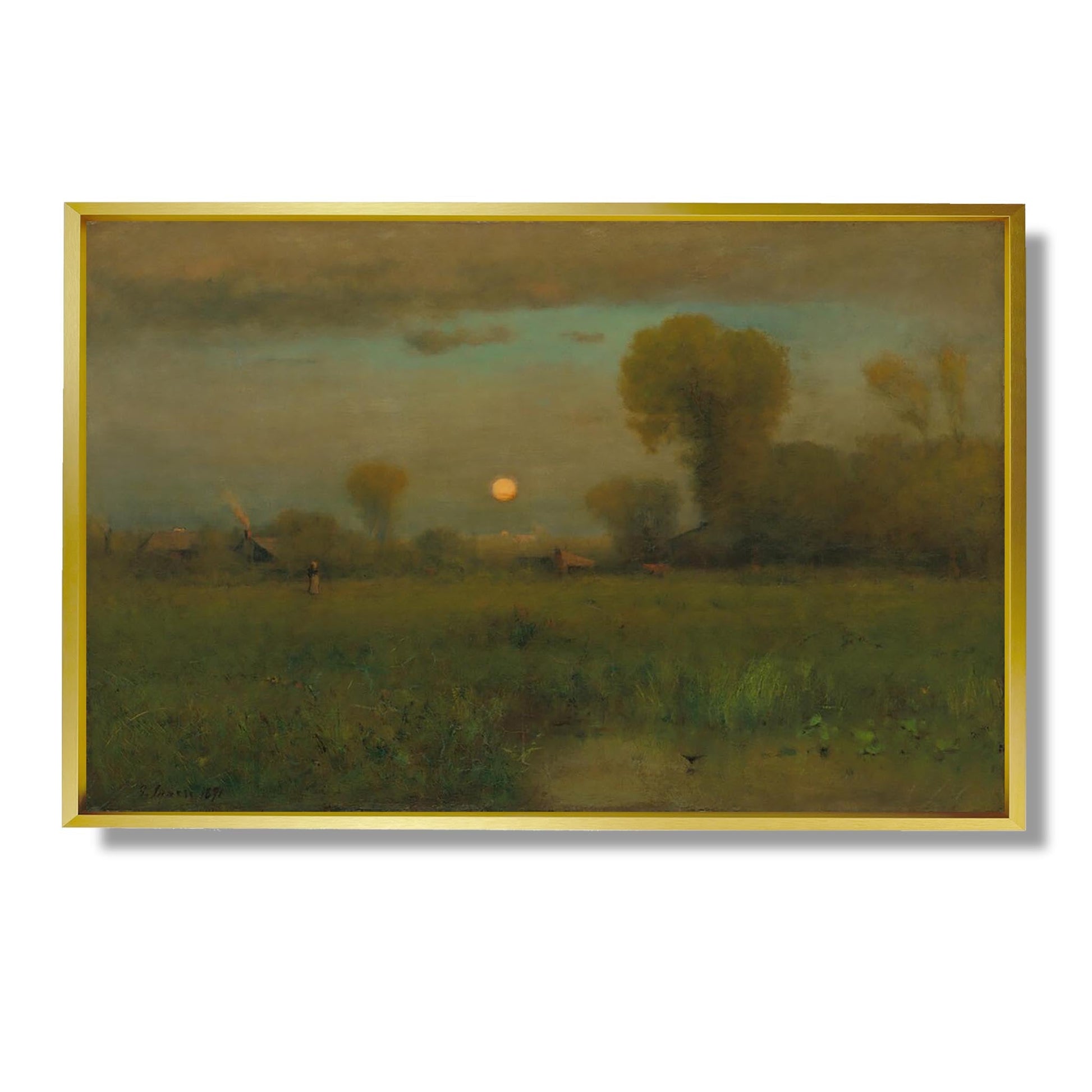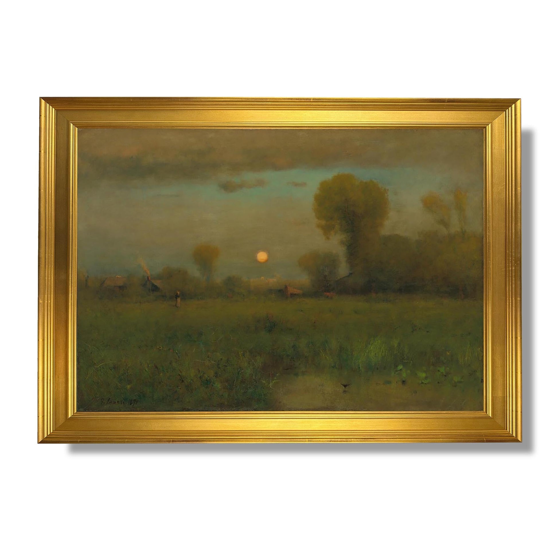 "Harvest Moon" de George Inness est une œuvre emblématique du paysage américain du XIXe siècle, illustrant la transition entre le réalisme et l'impressionnisme. Peinte en 1889, elle capture la beauté d'un soir d'automne, où la lune se lève au-dessus d'un champ doré, baignant le paysage d'une lumière douce et chaleureuse. Inness utilise des coups de pinceau fluides et des couleurs riches pour évoquer une atmosphère de sérénité et de contemplation. Cette toile reflète son intérêt pour la spiritualité de la nature, invitant le spectateur à ressentir une connexion profonde avec le monde naturel.