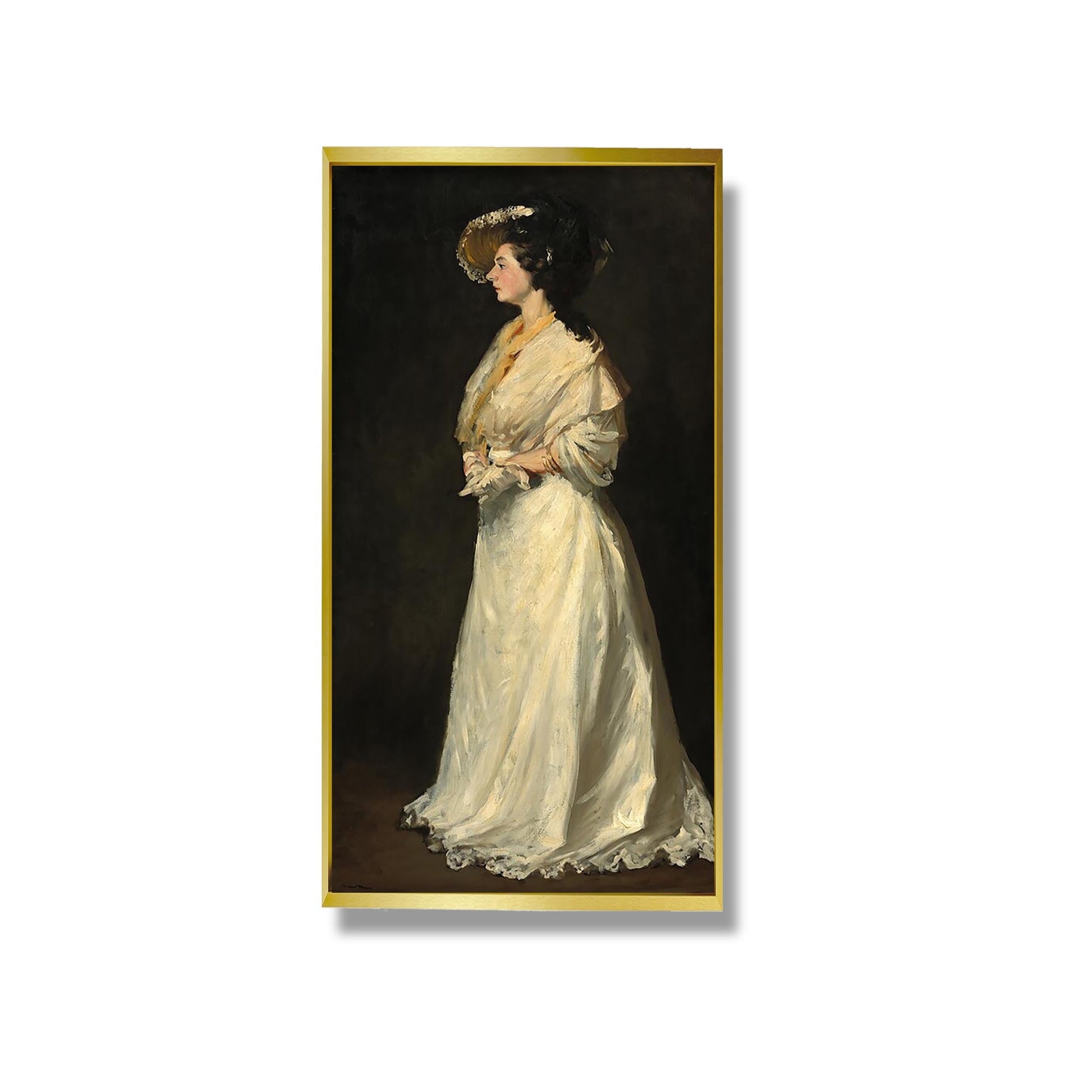 "Jeune femme en blanc" est une œuvre emblématique de Robert Henri, un peintre américain du début du XXe siècle, connu pour son rôle dans le mouvement de l'American Realism. Réalisée en 1910, cette toile capture la beauté et la force d'une jeune femme vêtue d'une robe blanche, symbolisant à la fois la pureté et la modernité. Henri utilise des coups de pinceau audacieux et une palette de couleurs vibrantes pour transmettre l'énergie et la personnalité de son modèle. L'œuvre reflète l'intérêt de l'artiste pour le portrait vivant, mettant en avant l'individualité et l'expression personnelle, tout en s'inscrivant dans une quête de vérité artistique.
