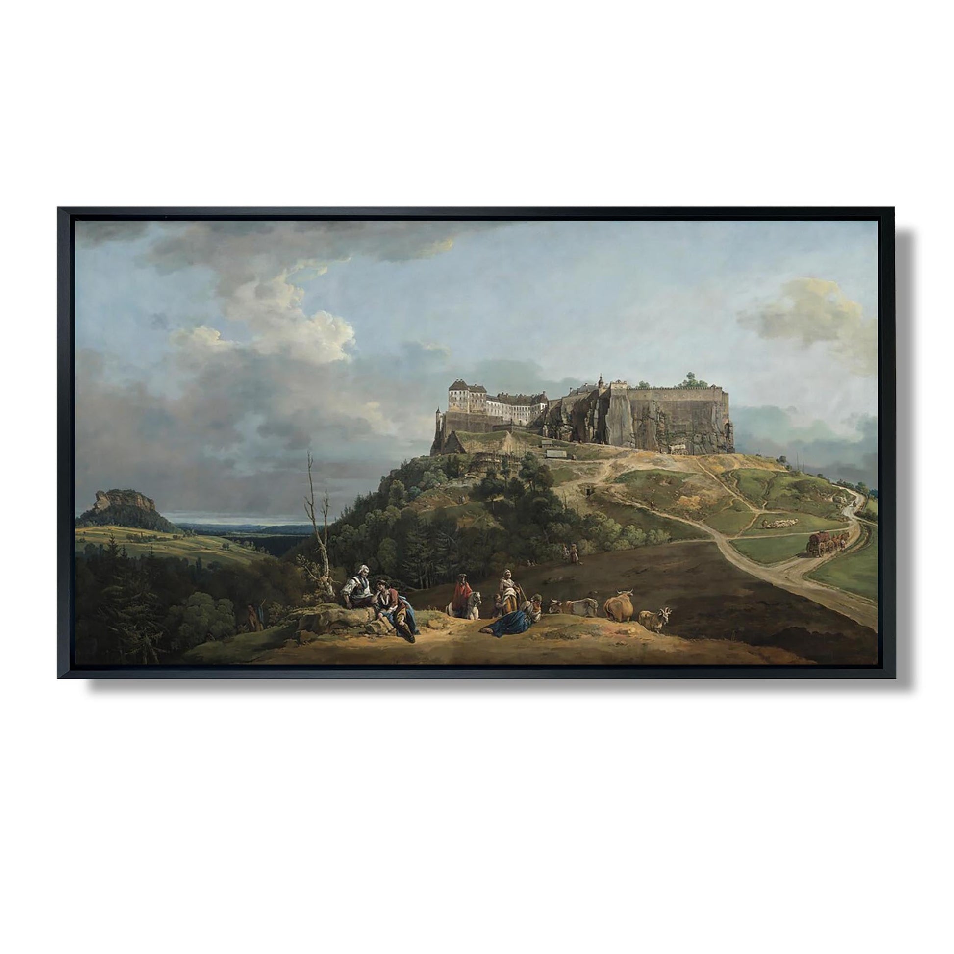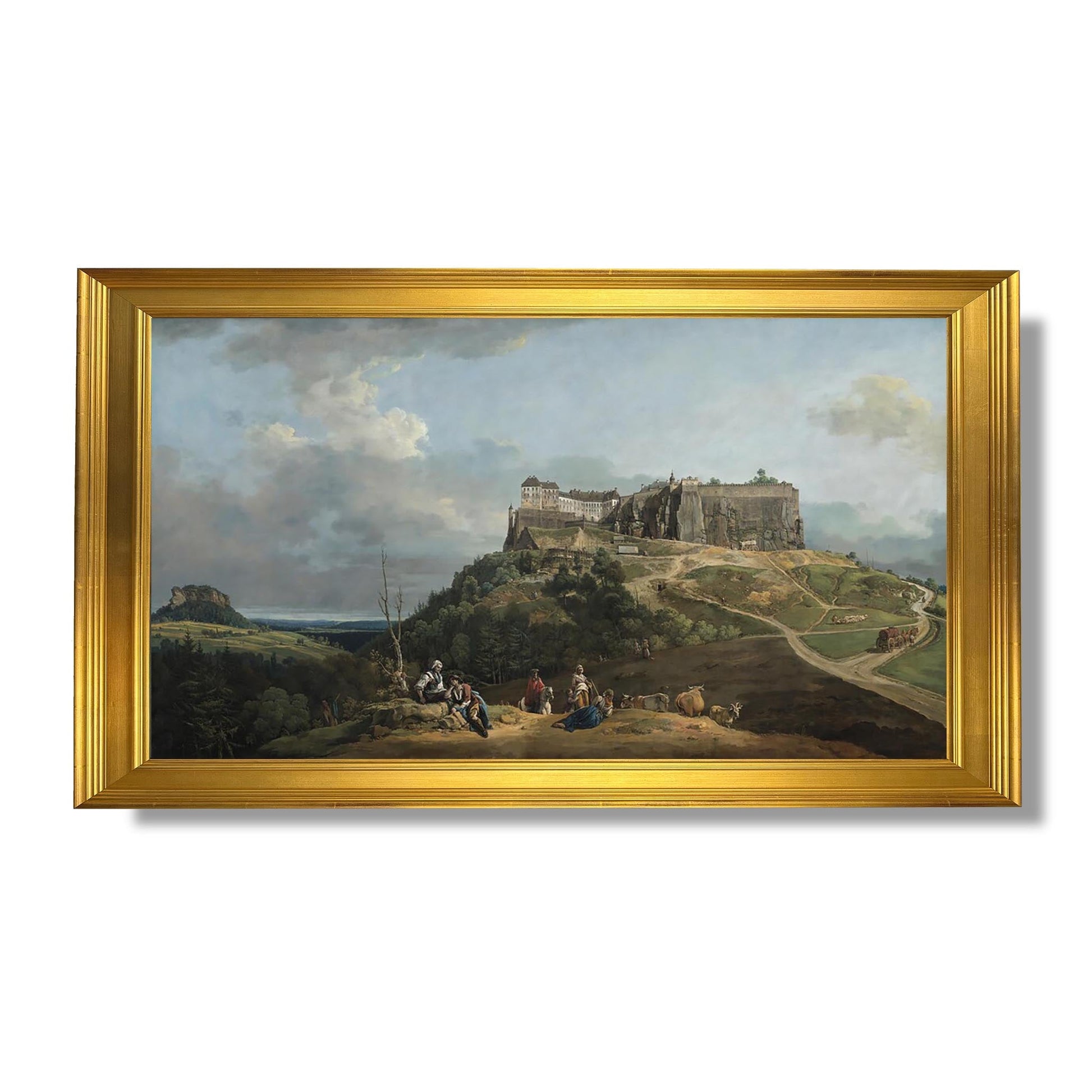 "La Forteresse de Königstein" est une œuvre emblématique de Bernardo Bellotto, un maître de la peinture de paysage du XVIIIe siècle. Réalisée entre 1756 et 1758, cette toile représente la majestueuse forteresse de Königstein, perchée sur un promontoire rocheux en Saxe. Bellotto, connu pour son sens du détail et sa capacité à capturer la lumière, offre une vue panoramique qui met en valeur l'architecture militaire et le paysage environnant. L'œuvre témoigne de l'habileté de l'artiste à allier précision topographique et esthétique, tout en évoquant la grandeur et la sérénité du site.