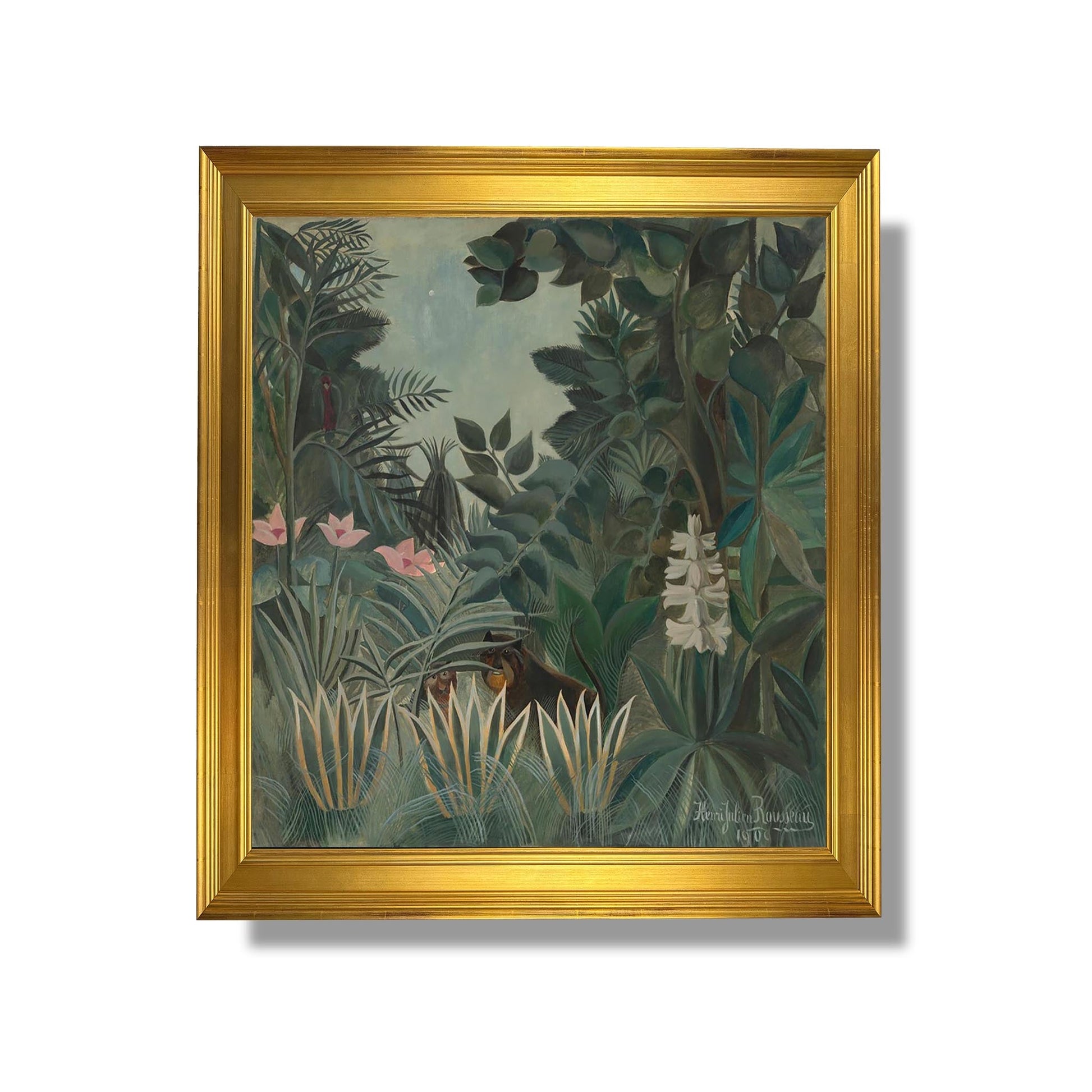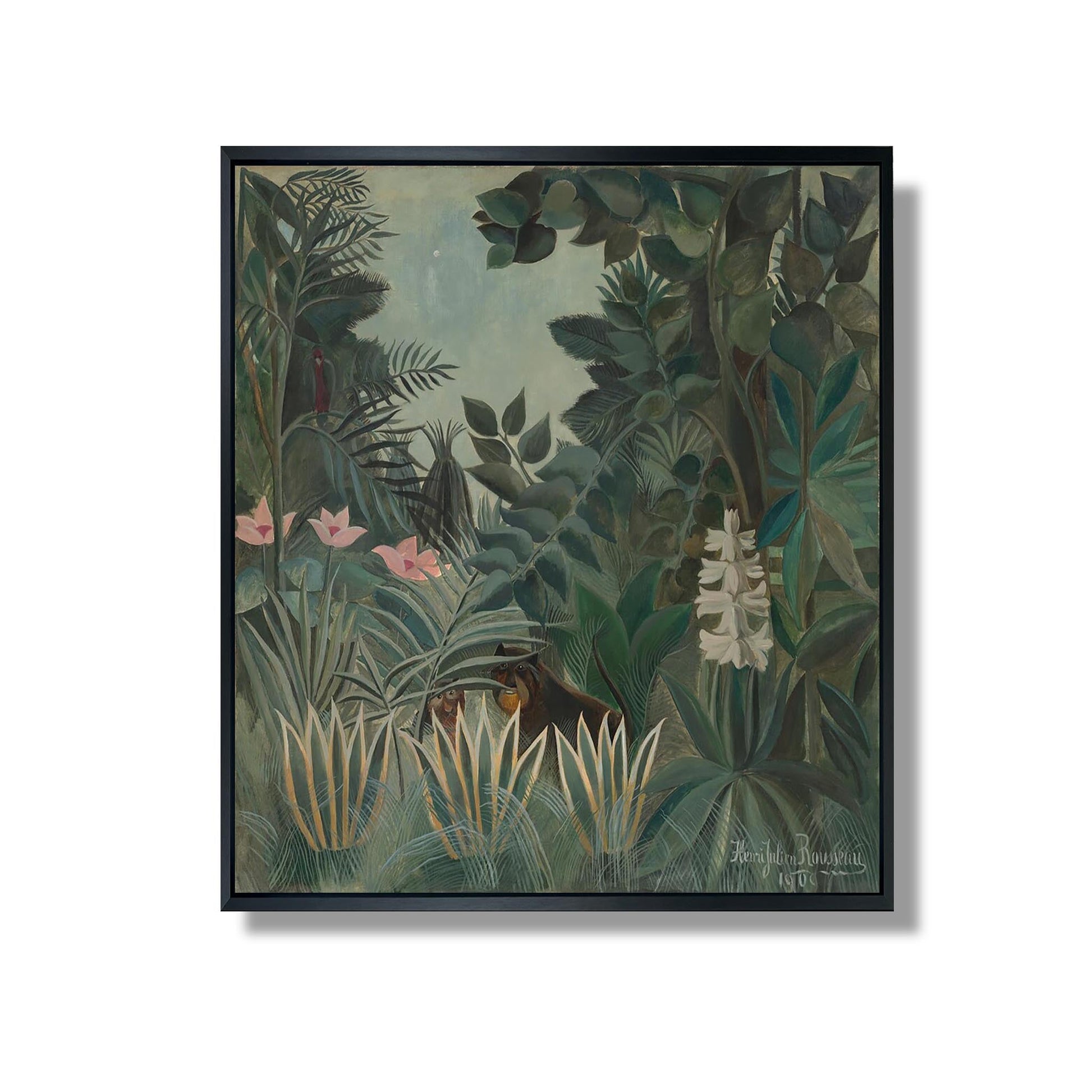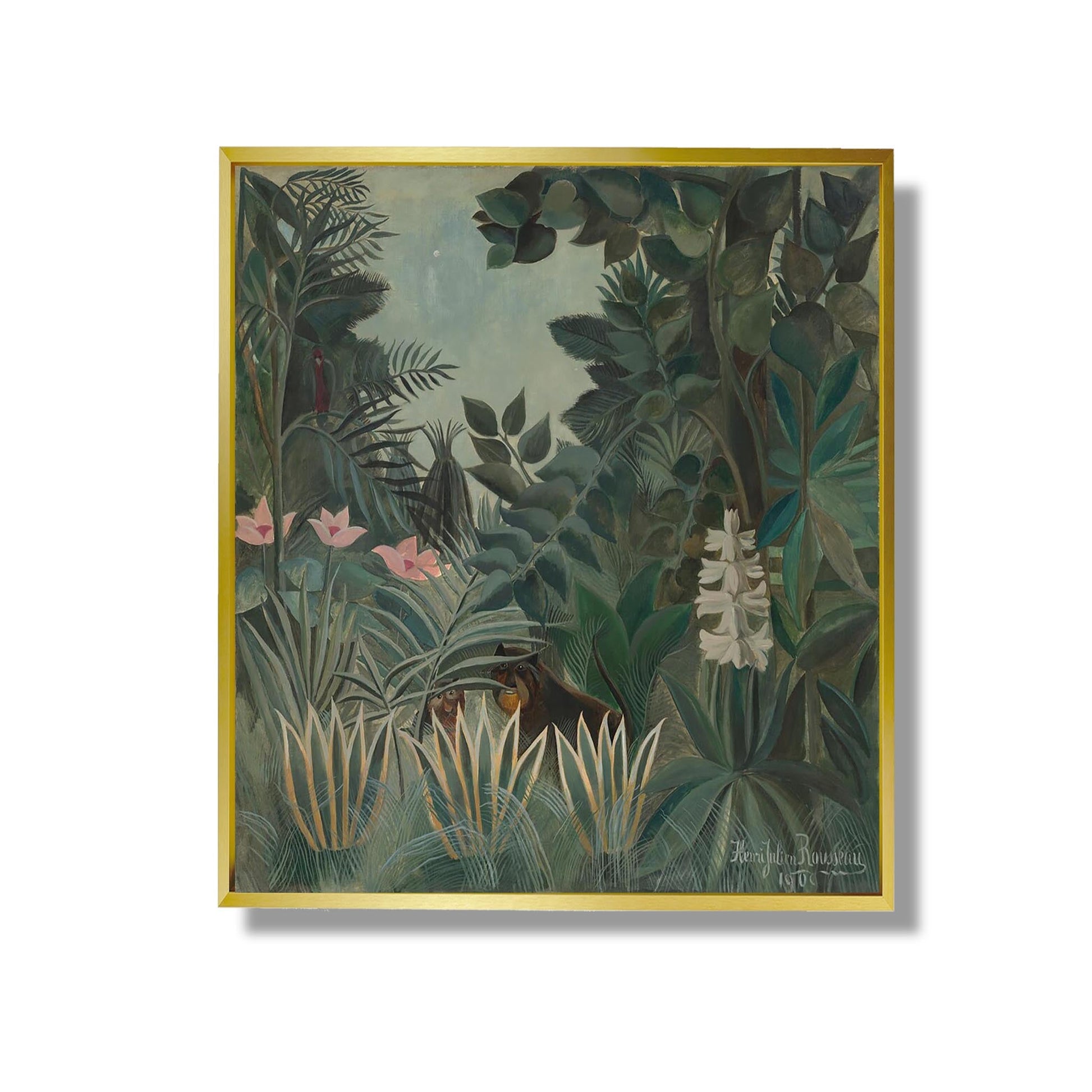 "La Jungle Équatoriale" est une œuvre emblématique d'Henri Rousseau, peinte en 1910. Ce tableau illustre la fascination de l'artiste pour les paysages exotiques, bien qu'il n'ait jamais quitté la France. Rousseau y dépeint une jungle luxuriante, peuplée d'animaux sauvages et de végétation dense, créant une atmosphère à la fois mystérieuse et onirique. Les couleurs vives et les formes stylisées témoignent de son style naïf, caractérisé par une simplicité apparente mais une profondeur émotionnelle. Cette œuvre reflète l'imagination débordante de Rousseau et son désir d'évasion vers des mondes inconnus.