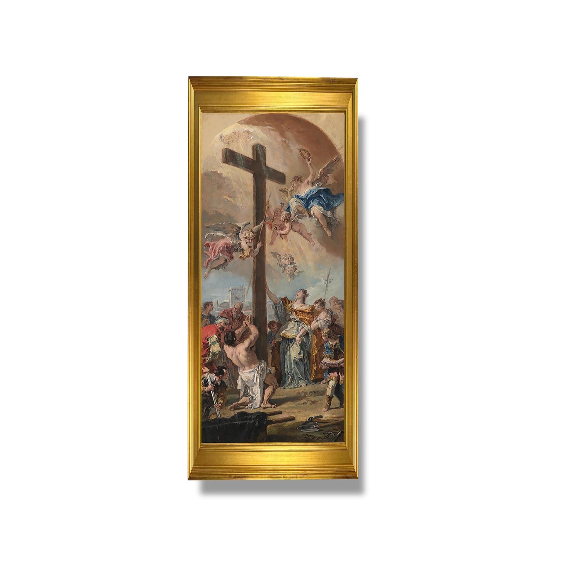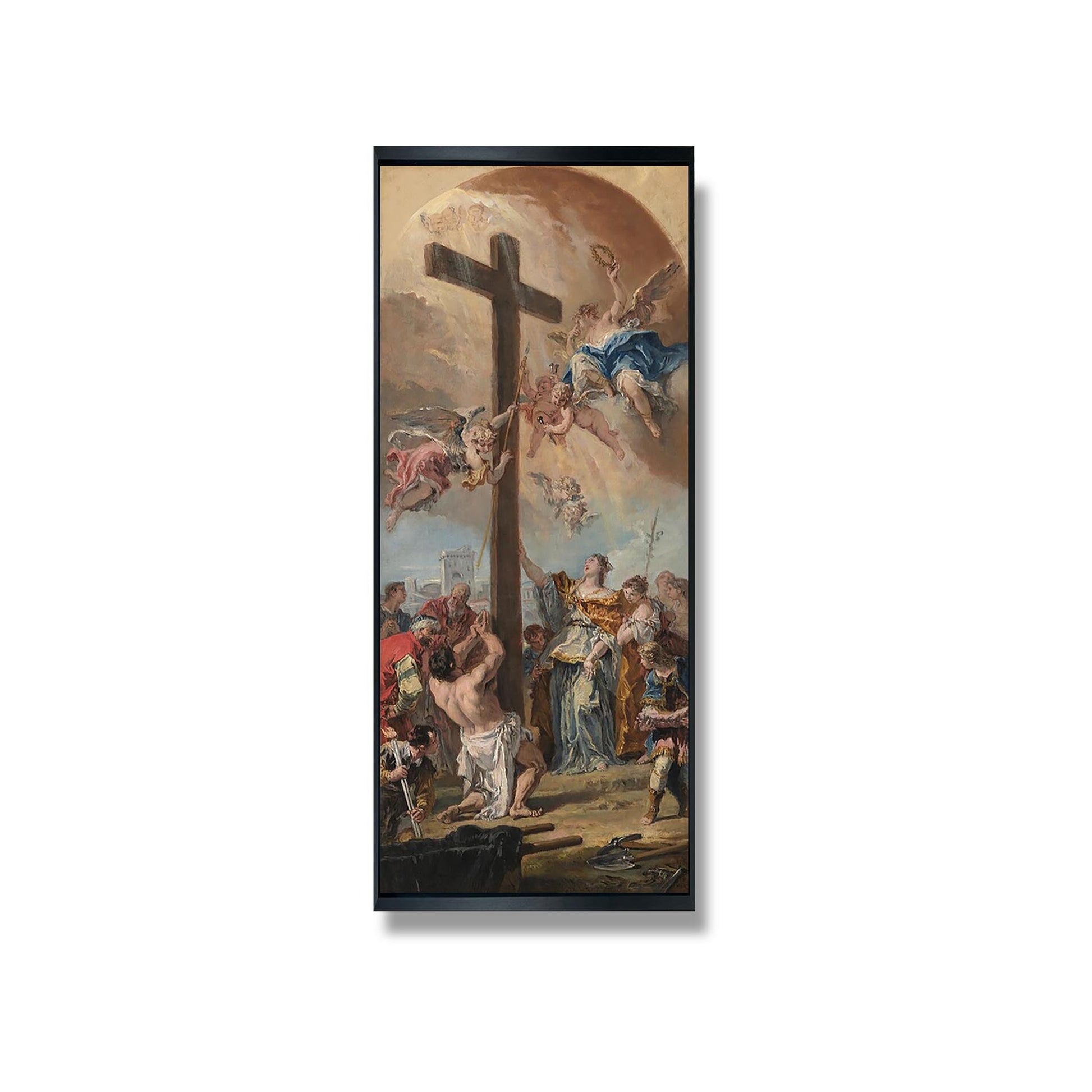 L'Exaltation de la Vraie Croix, œuvre majeure de Sebastiano Ricci, est un tableau baroque qui illustre la célébration de la croix chrétienne. Réalisée au début du XVIIIe siècle, cette peinture se distingue par son dynamisme et sa richesse chromatique. Ricci utilise des compositions audacieuses et des jeux de lumière pour accentuer l'émotion spirituelle. Les figures, expressives et en mouvement, témoignent de la ferveur religieuse de l'époque. L'œuvre, à la fois théologique et artistique, invite le spectateur à une contemplation profonde de la foi et du sacrifice, incarnant l'essence même du baroque.