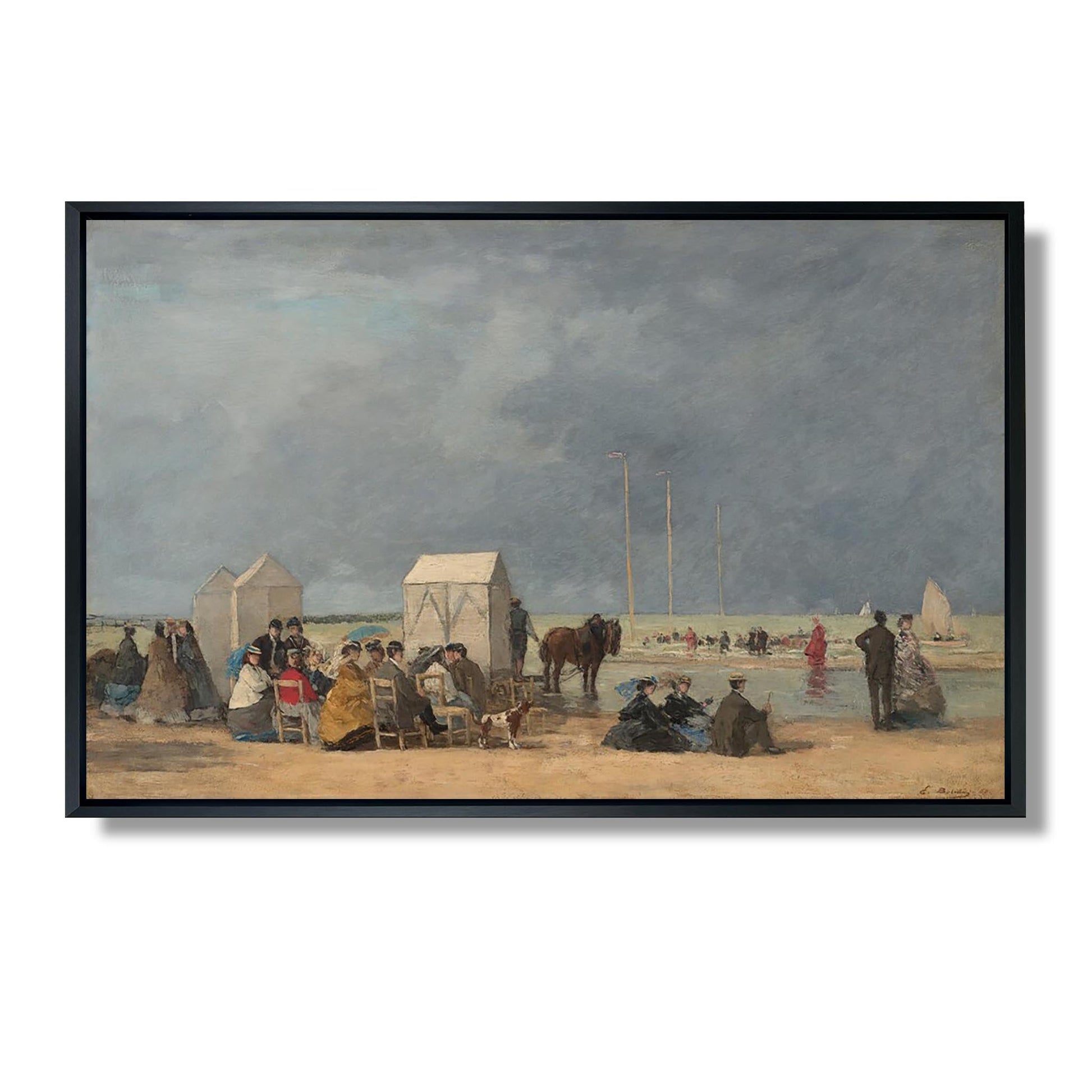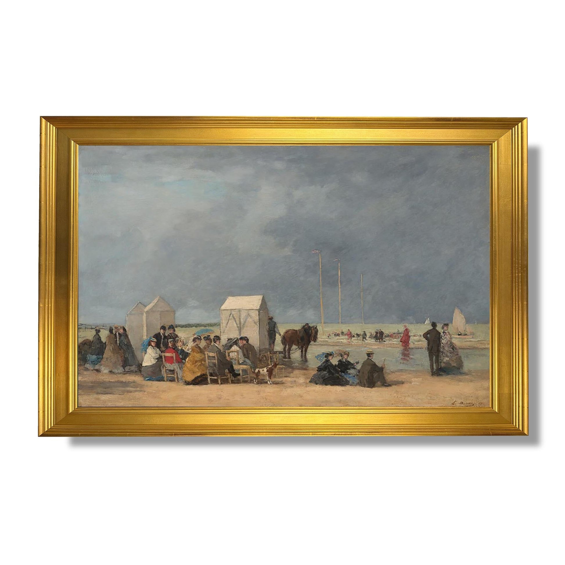 L'Heure du Bain à Deauville, peint par Eugène Boudin en 1888, capture l'essence de la vie balnéaire à la fin du XIXe siècle. Cette œuvre emblématique illustre des baigneurs sur la plage, entourés de parasols colorés et de l'animation estivale. Boudin, pionnier de la peinture en plein air, utilise des touches légères et des couleurs vives pour évoquer la lumière naturelle et l'atmosphère vivante de Deauville. Son style impressionniste préfigure les œuvres de ses contemporains, tout en célébrant la beauté éphémère des instants quotidiens. Cette toile témoigne de son amour pour la mer et la vie en plein air.
